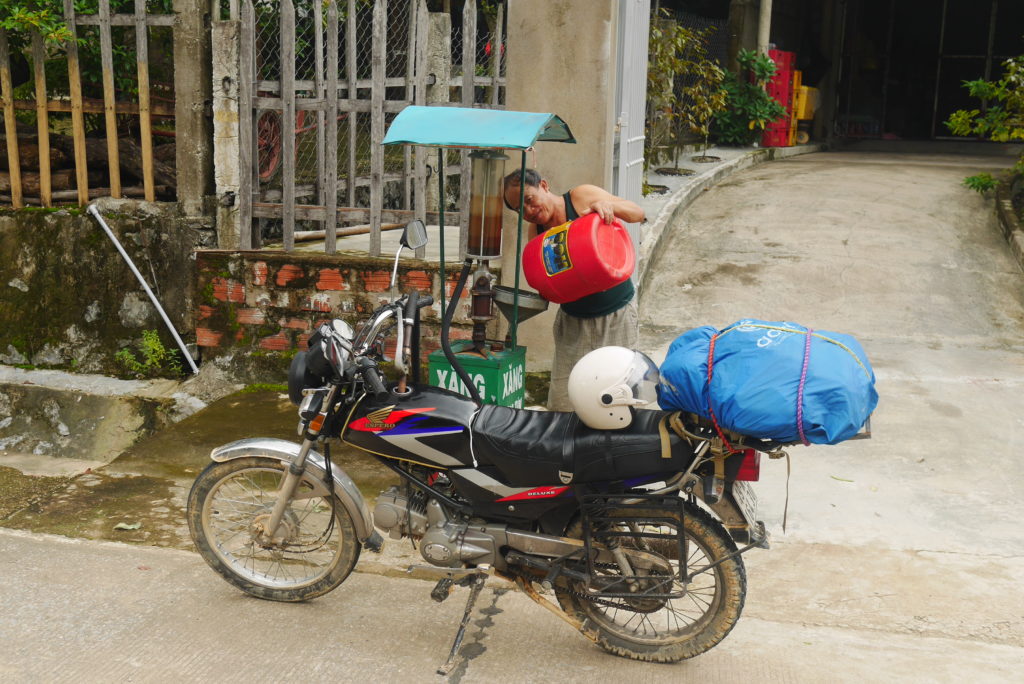 I thought I was getting to know this country fairly well so I figured there would be plenty of restaurants and gas stations along the way, just like there have been along all other roads I’ve driven so far. This assumption was a great mistake because by the time I reached the Ho Chi Minh highway I was getting kind of hungry and the bike was running low on petrol (by my estimation, there is no petrol gauge). After a short while I found a road side eatery in a tiny little village and just before I reached the theoretical maximum for this kind of motorbike, I happened upon a portable, old style gas pump by the side of the road. I stopped and sure enough an old guy came out and hand cranked my tank full.