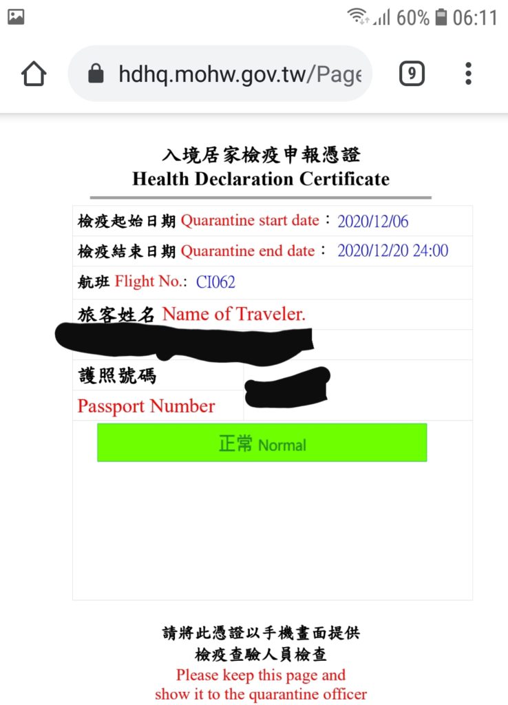 When we landed in Taiwan there was a special procedure set up for us. First, we had to line up (with social ditancing) in one of the corridors where airport staff checked our passports and corona test reports. They then instructed us to go to a certain website where we could access our online health declarations and store them in our phones. Next came a checkpoint where we had to show this online declaration, as well as the corona test results to some people who checked us off on some kind of list. Normally, as a permanent resident I can just go through immigration without filling in any forms, but this time I had to fill one in with the address of the quarantine hotel I would be staying in. Finally, at immigration I had to show the corona test report along with the standard paperwork.