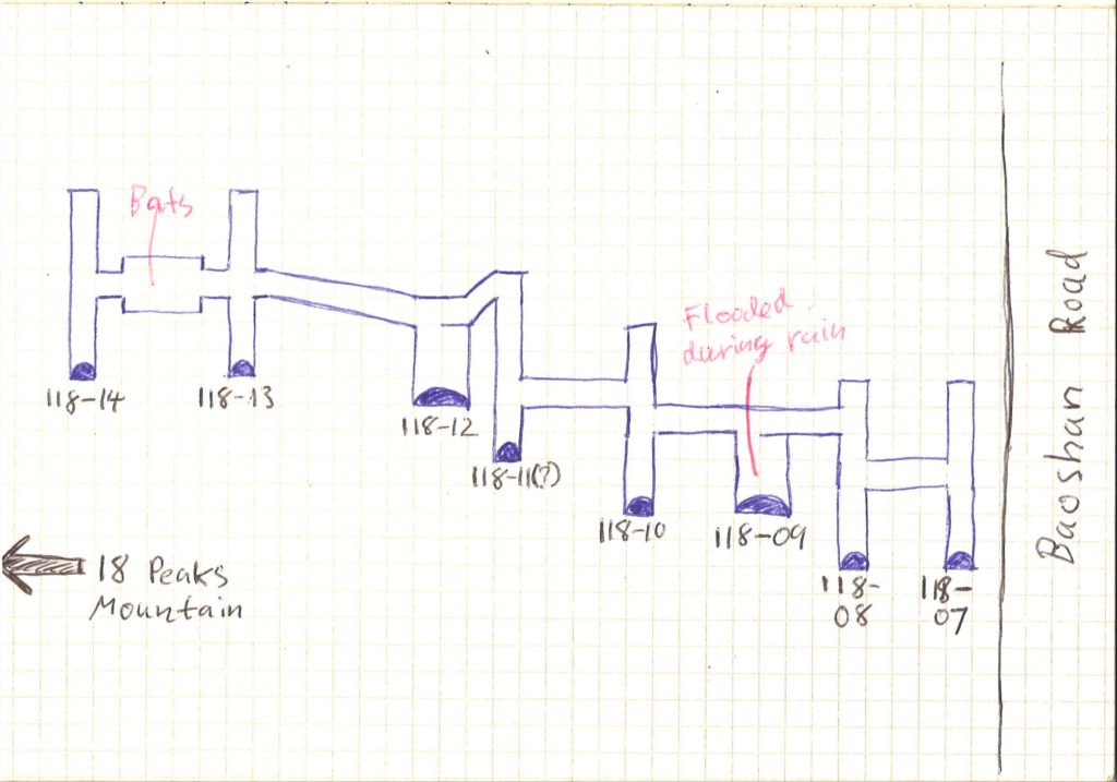 There is a sign painted on each tunnel entrance that reminds me of ones I saw in the tunnels below Fengqi Sunset Trail. I figured it could be fun to make a map of theses tunnels, just like I did at Fengqi. The tunnel system under 18 Peaks Mountain si pretty small and not particularly complex so a map isn’t really necessary but making it was a fun little project. Here are the results: