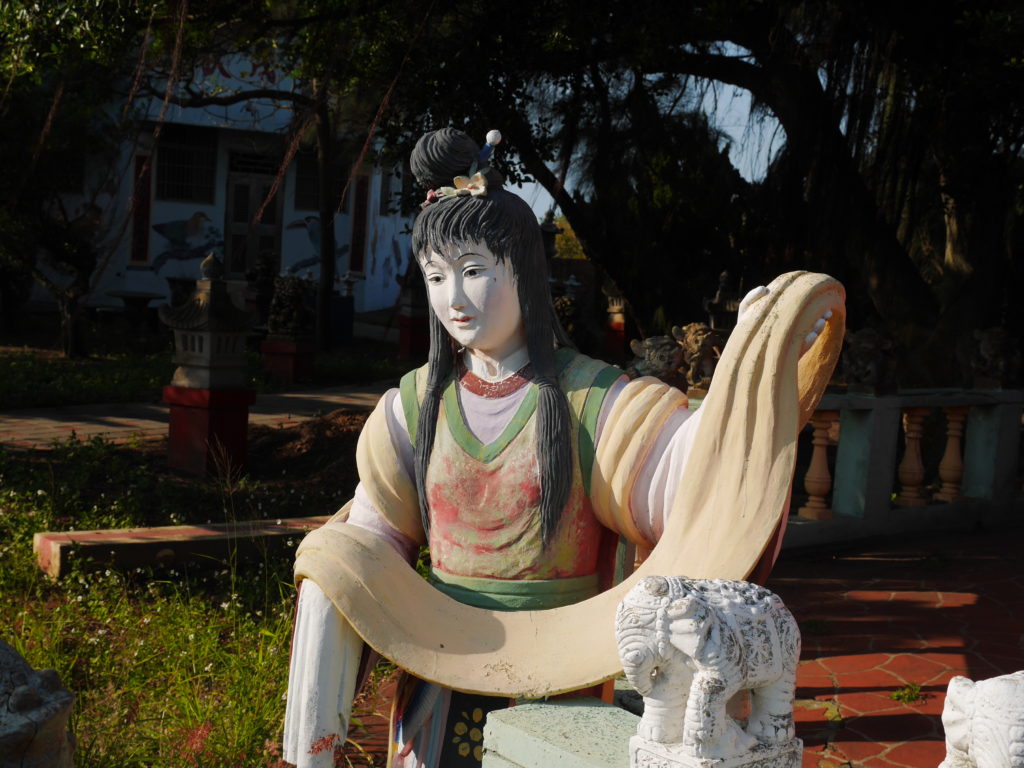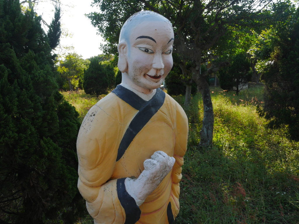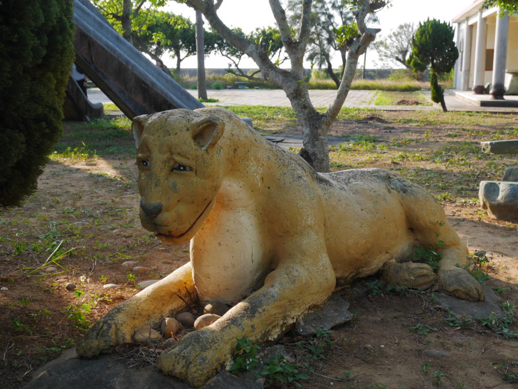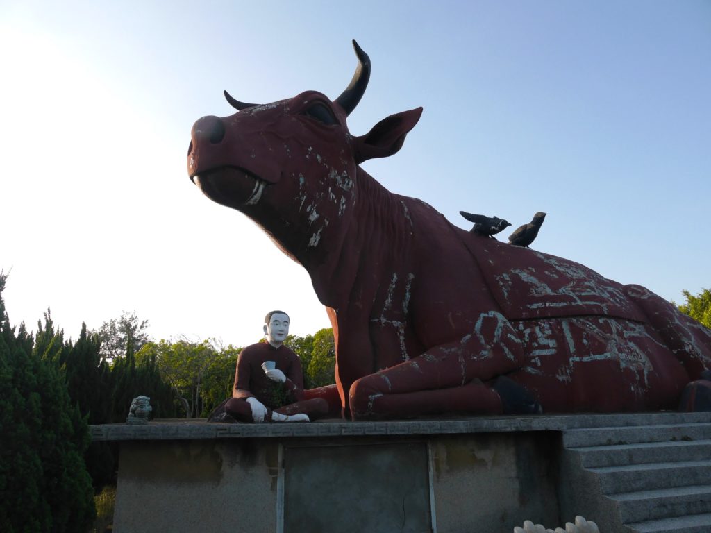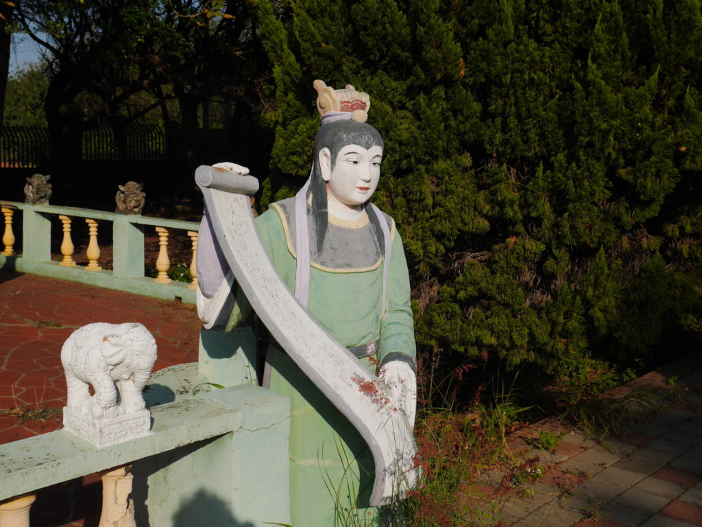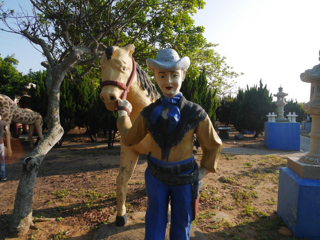 One such place is Qiumaoyuan statue park. As you can see from the map link, it is marked as a tourist spot, but you have to zoom in a fair bit in order for it to show up. There are a couple different aspects that make it really odd and, as you can guess, worth visiting for anyone with even a passing interest in such things. First is that the collection of statues it houses is so incongruous; there’s a wild mix of everything from Buddha to Jesus to animals to political propaganda and anything in between – there’s even a random cowboy for some reason. Second is the low quality of the statues. Many of them have been made with fiber glass, a material which is really not suitable Taiwan’s climate. Moreover, their design is rather sub-par, with many of the them – especially the animals – having a facial expression that makes them look either surprised and/or dumb. Third is that there are a number of temples inside the park that all have the same general size and shape, but are clearly meant for worshiping different gods; sort of “select your preferred religion”. Fourth is the fact that the place is in a state of neglect. Some parts of it are overgrown with weeds, several of the statues are cracked and broken, and there’s a general feeling about the whole place that they do just enough maintenance to keep it from falling into ruin completely. At this point I think it’s time to show some pictures so you can see for yourself.