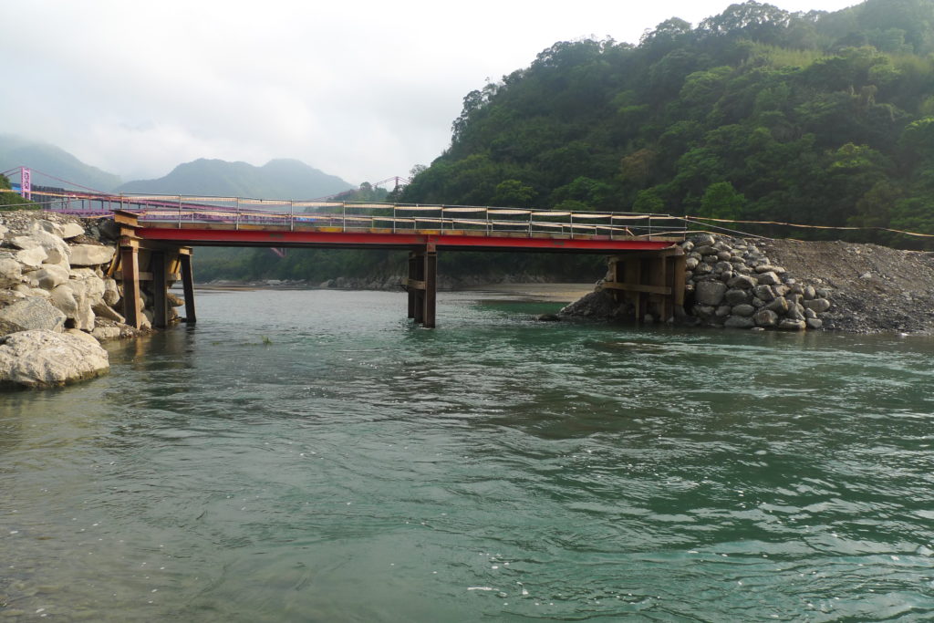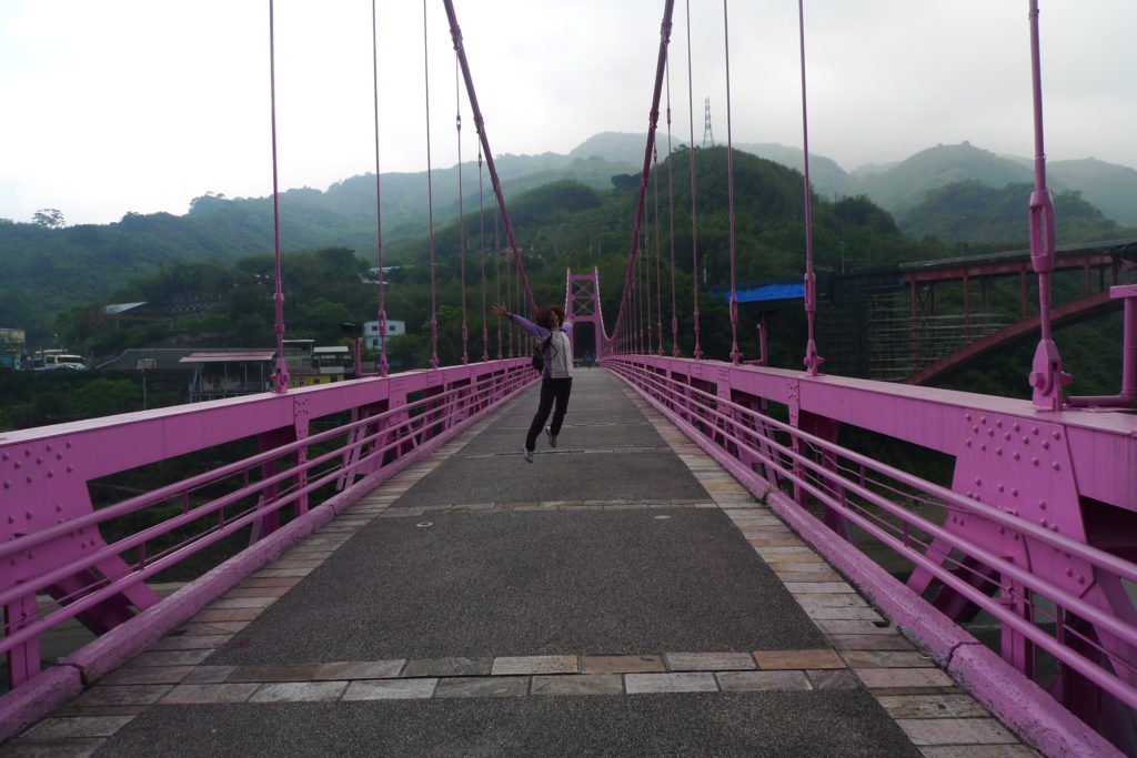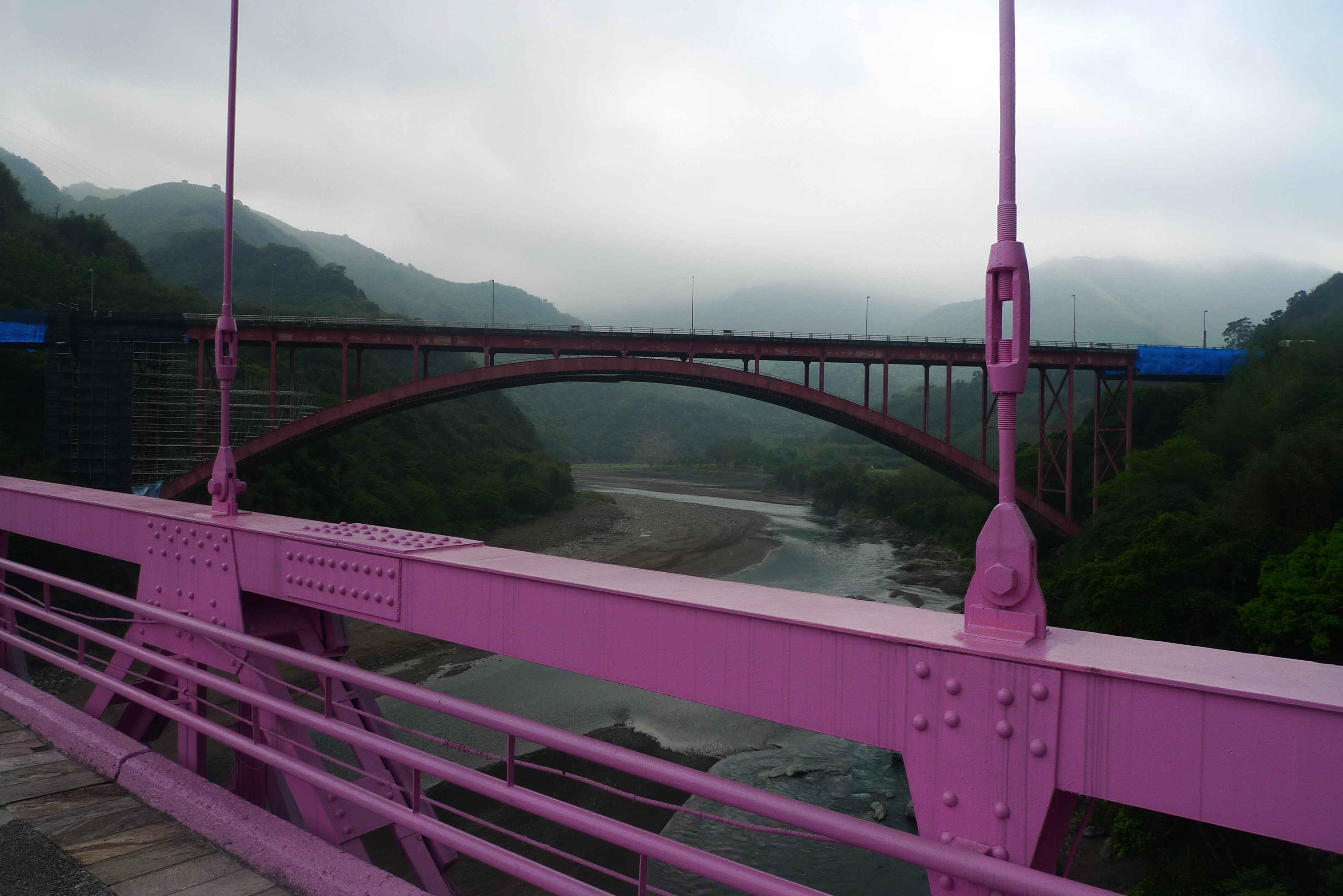 Coming down from the tower, it started raining. I pulled on my rain pants an jacket, just for the rain to stop a few minutes later. This was just as well because, as we were crossing a river gorge, we saw the old bridge that had been painted pink, which was enough reason for us to stop and explore.