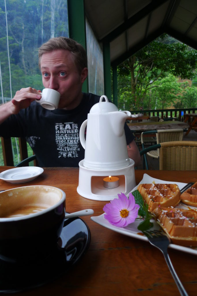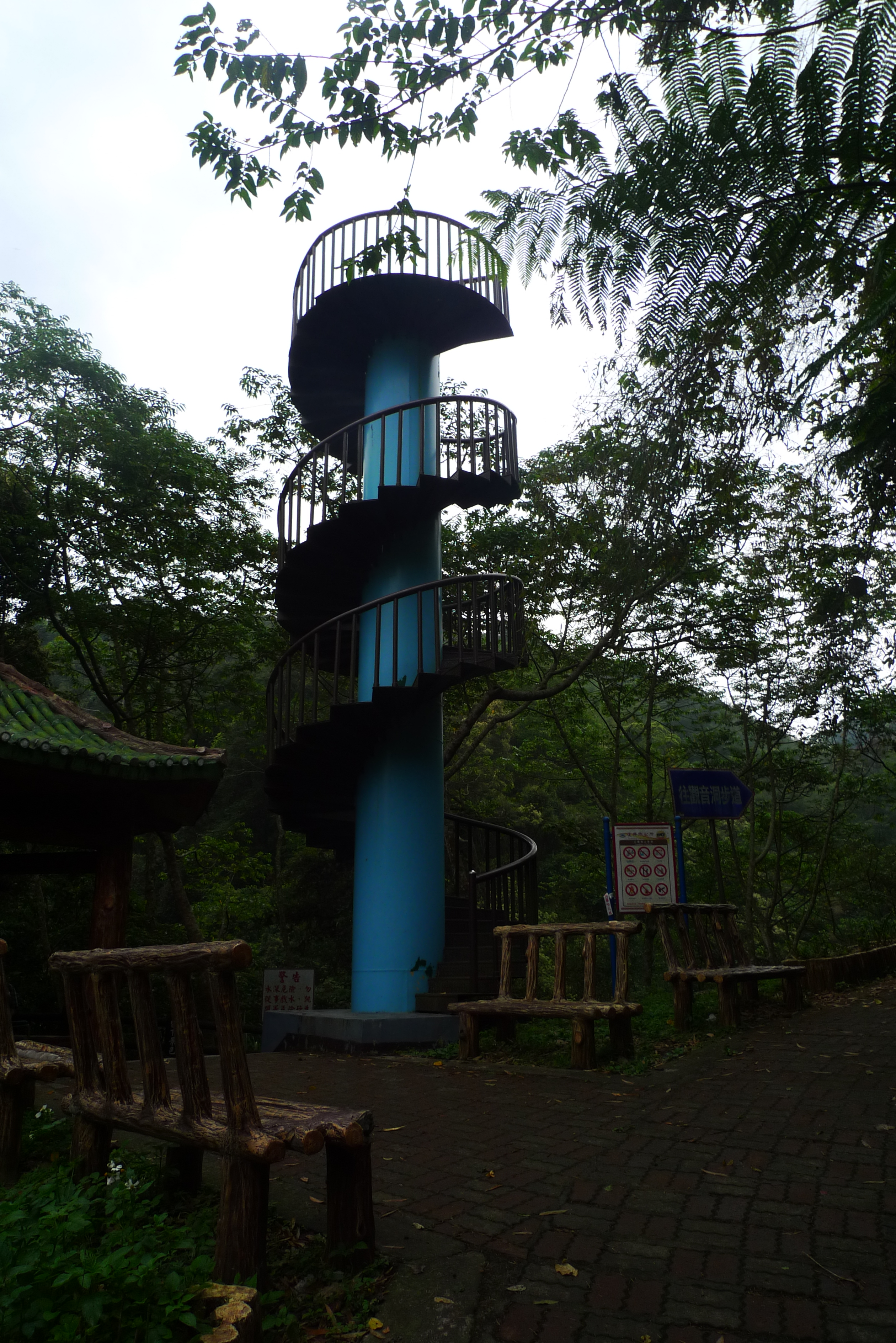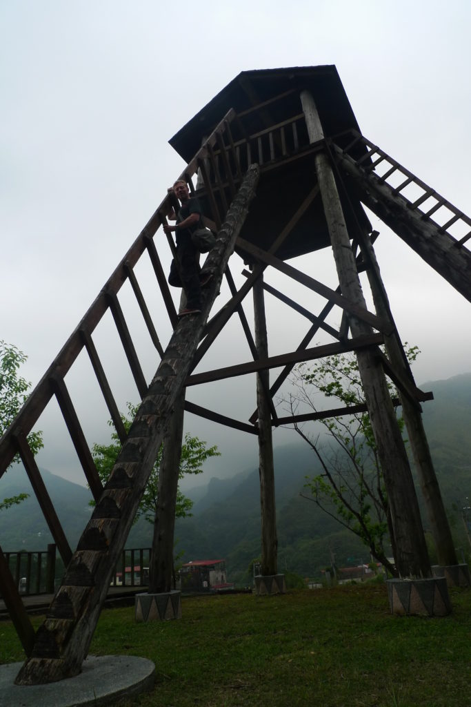 We kept on riding for a fair amount of time along mountain roads that were surprisingly well paved and wide. After a few minor stops and leg stretchers, we came to a tower that Yini has been to earlier. There were two ways up the tower, one normal set of stairs and on narrow, steep ladder carved from a single log, with a not-so-sturdy handrail on one side. I opted for the narrow ladder, then gave up about half way up as the hand rail became even less reliable.