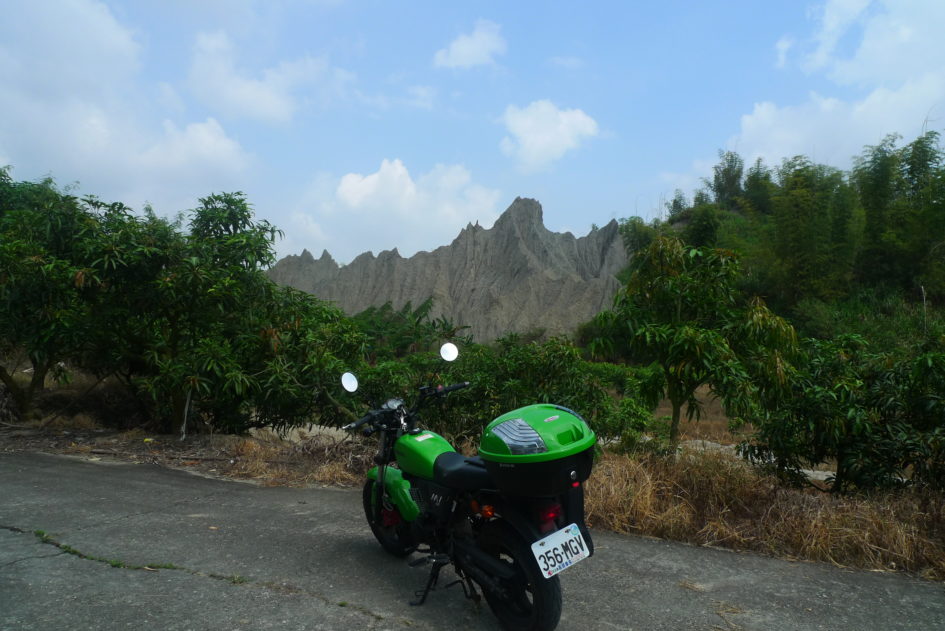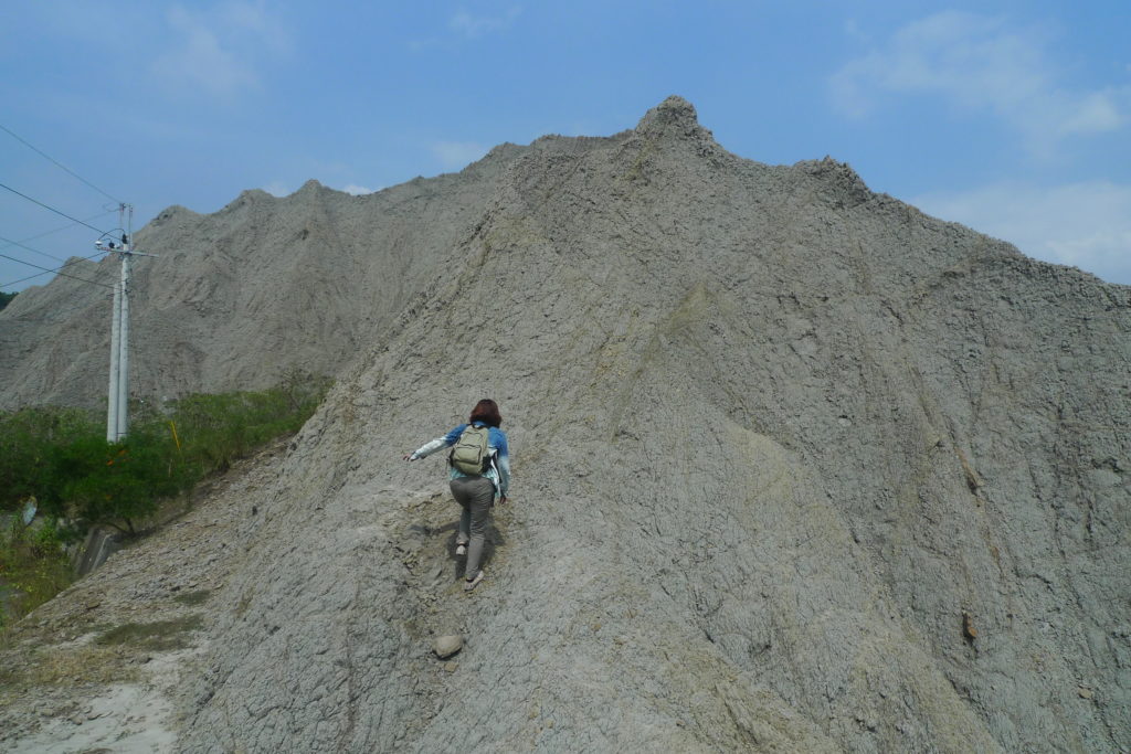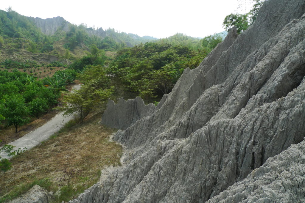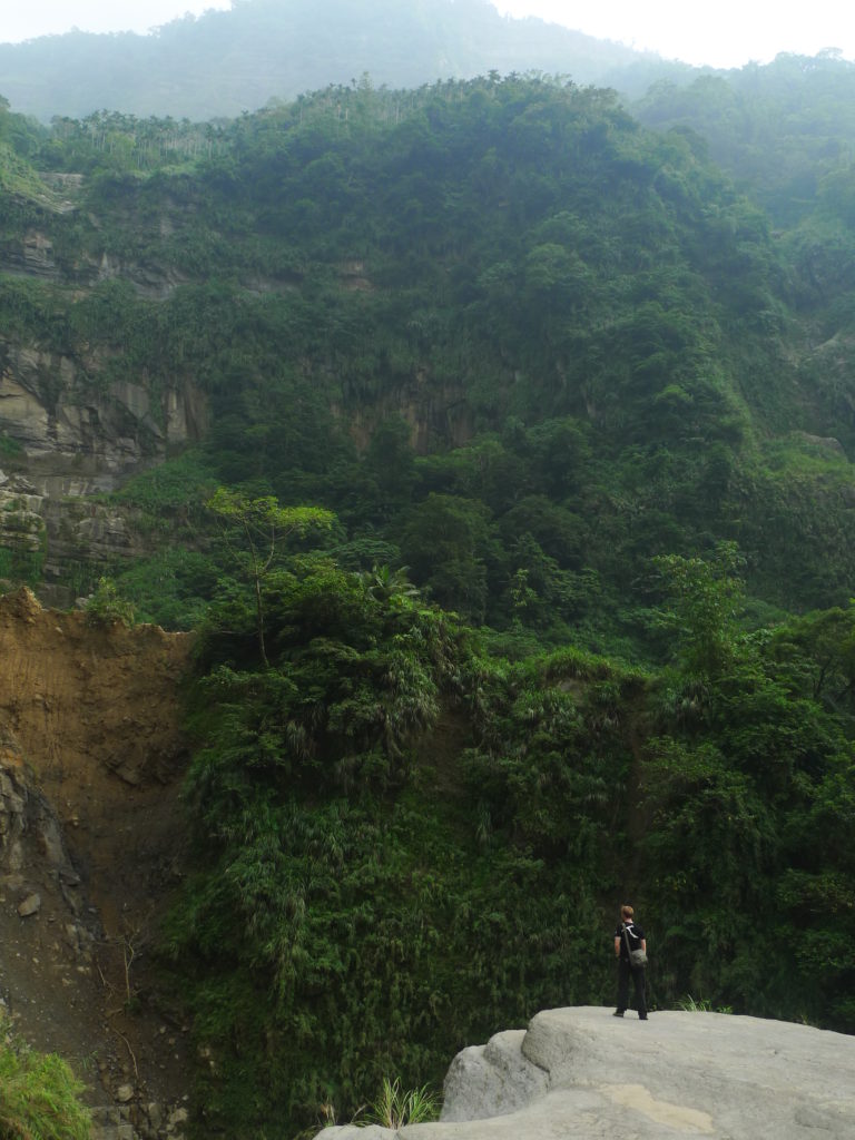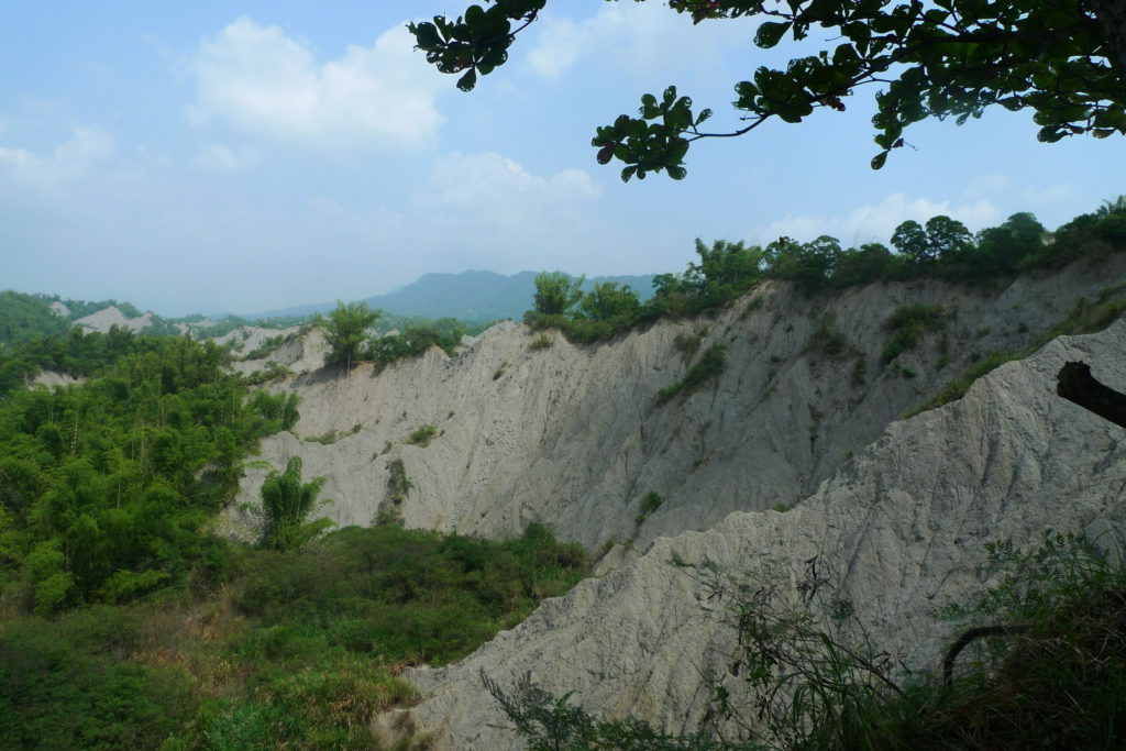 The last day we ventured out east. On roads of broken concrete, barely wider than a goat path, we climbed up steep inclines, and held on for dear life down even steeper descents, winding our way out into the wilderness. We went to the area known as Caoshan Moon World, a mountainous region full of barren cliffs of crumbling dry mud popping up among the vegetation. It’s kind of similar to the place we visited in Taidong a few years ago, but more spaced out, with lots of jungle in between the mud cliffs.