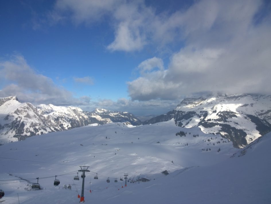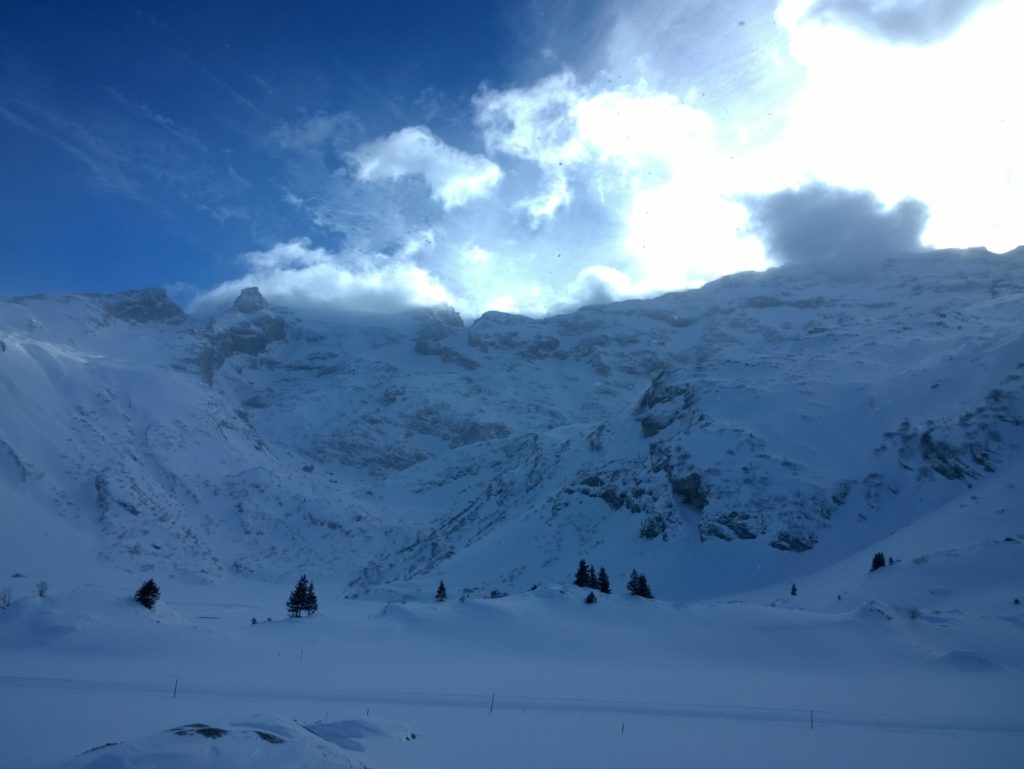 I spent the morning exploring different parts of the system than yesterday, and found plenty of untouched powder just a short distance from the main track. The weather was good, only light clouds scudding across the sky and I had plenty of fun.
