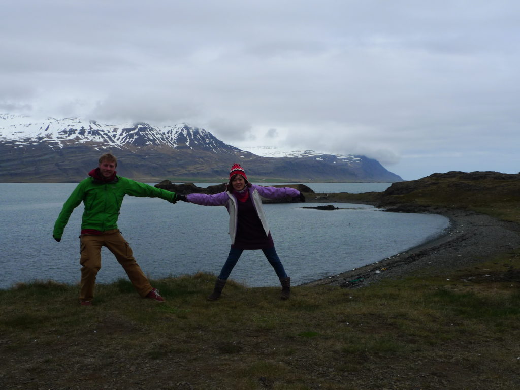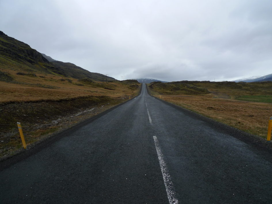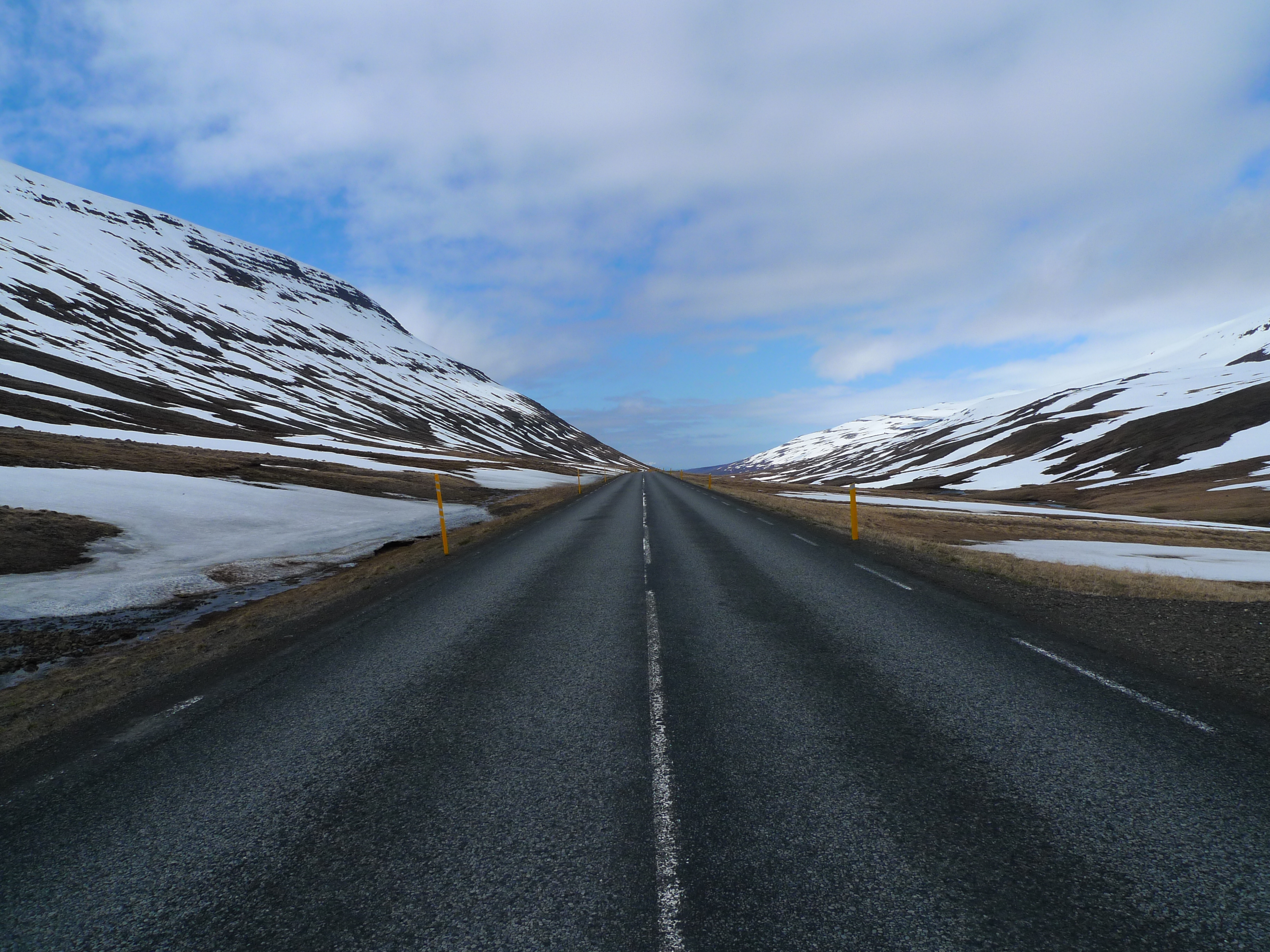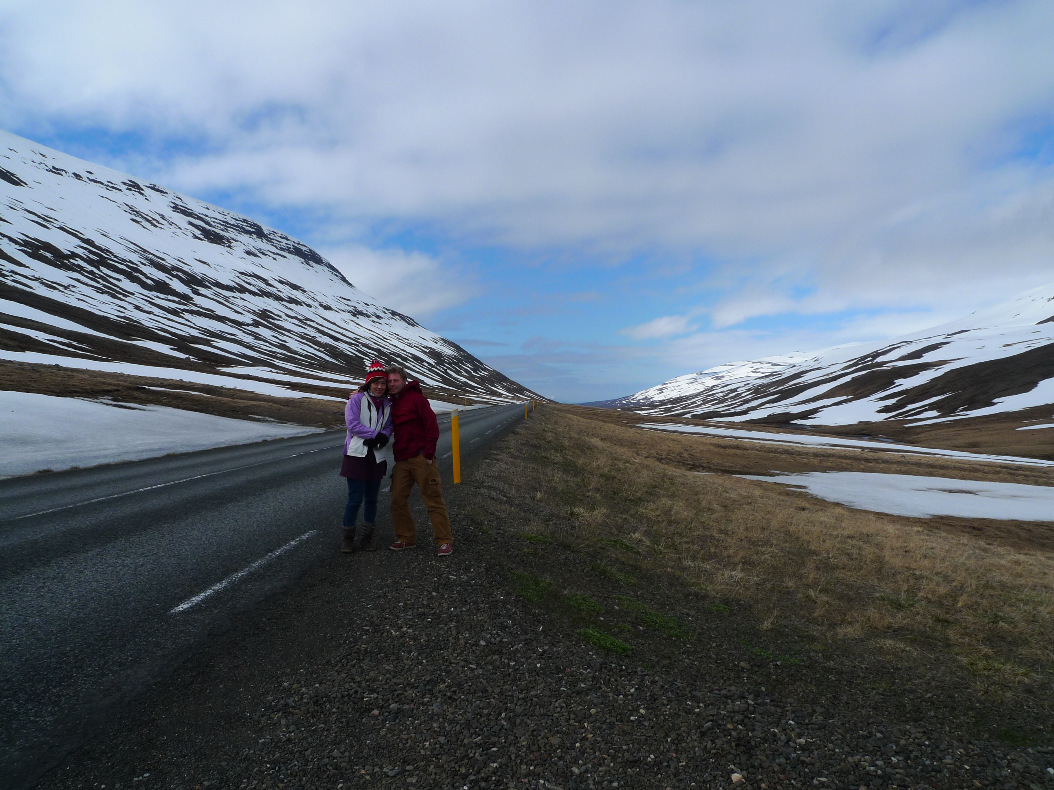 Towards the evening, we turned off the road skirting the fjords and drove more inland. We soon came into a kind of narrow valley with big patches of snow on both sides, the sky clearing up and the the road open in front of us. Though we are getting more used to the constant beauty of this country, we were completely overwhelmed by this sight.