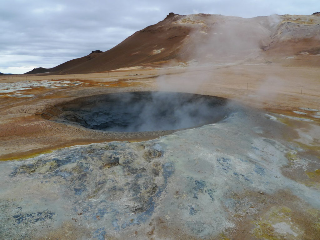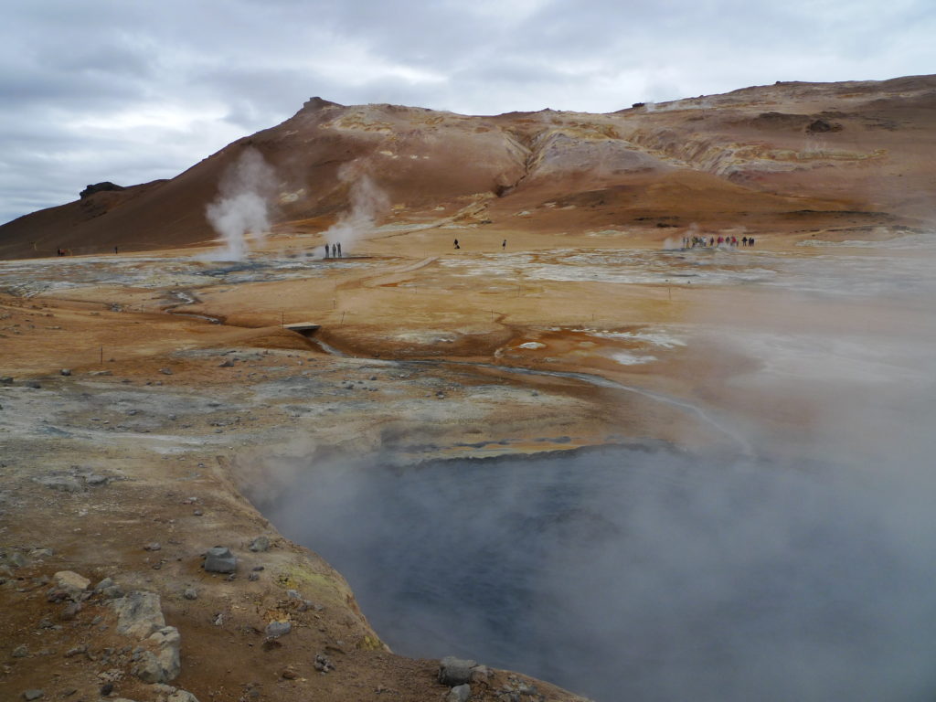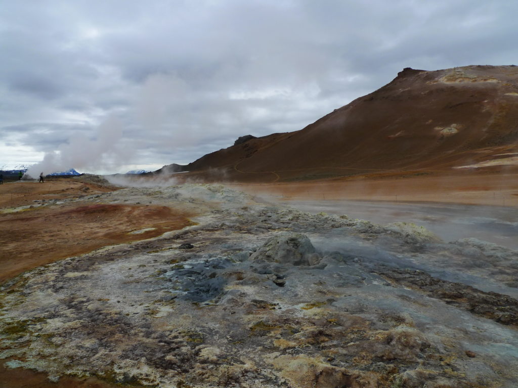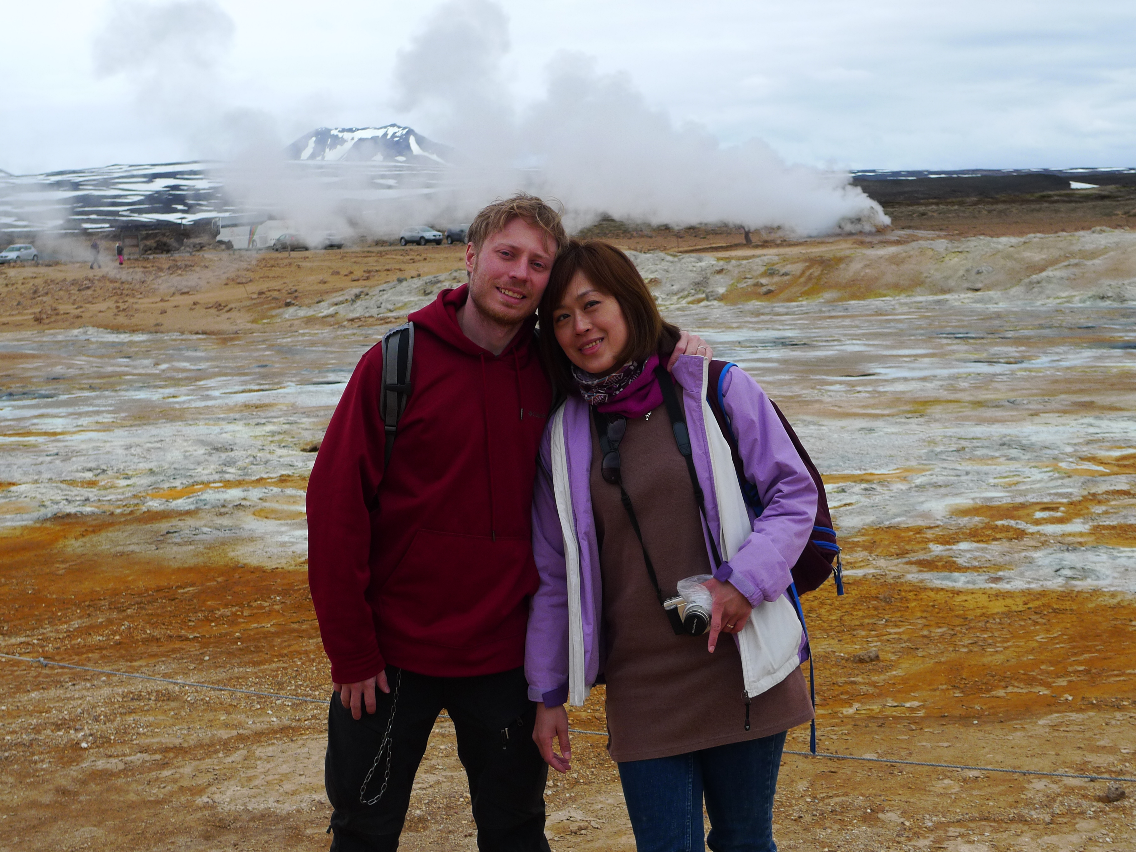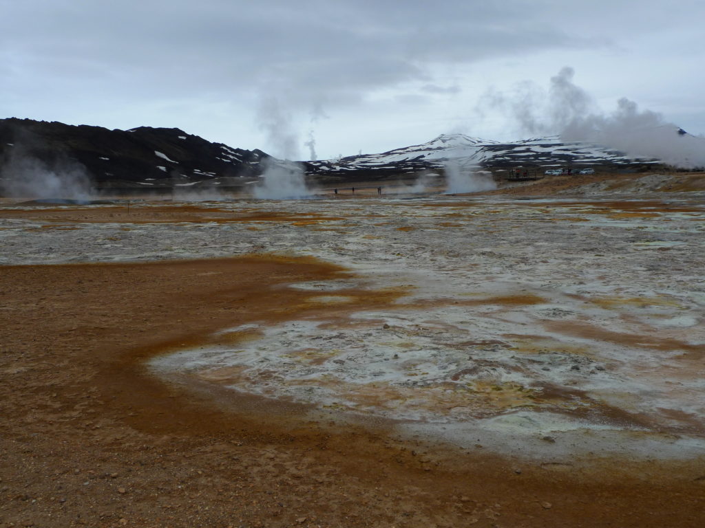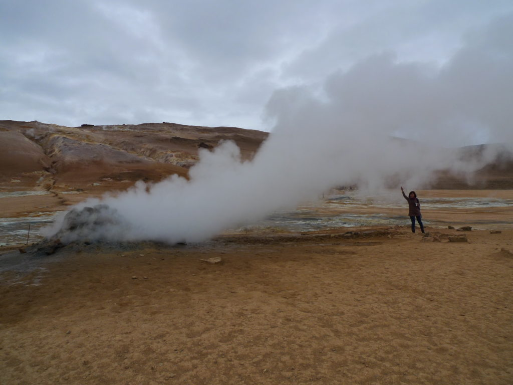 After a short stop to snap some photos we kept driving. Just before we got into the lake area, we saw pillars of white smoke on the left and went to investigate. It turned out to be a geothermal area of bubbling cauldrons and miniature volcanoes spouting sulfur smelling gas with a loud swooshing sound. It was quite something.