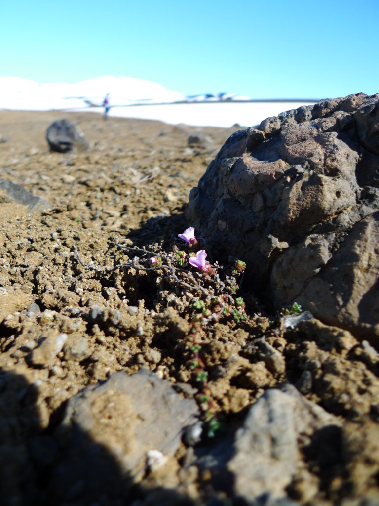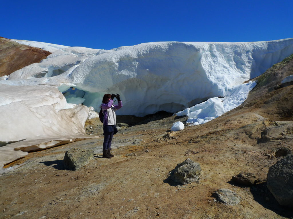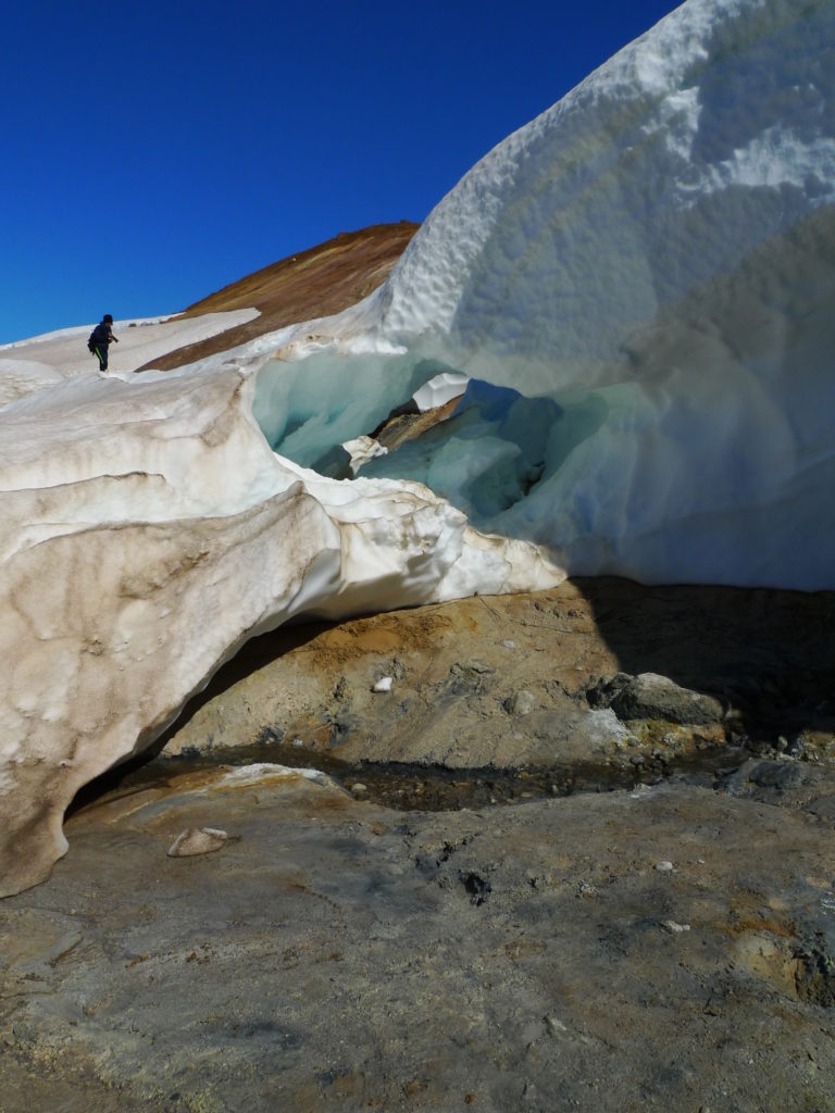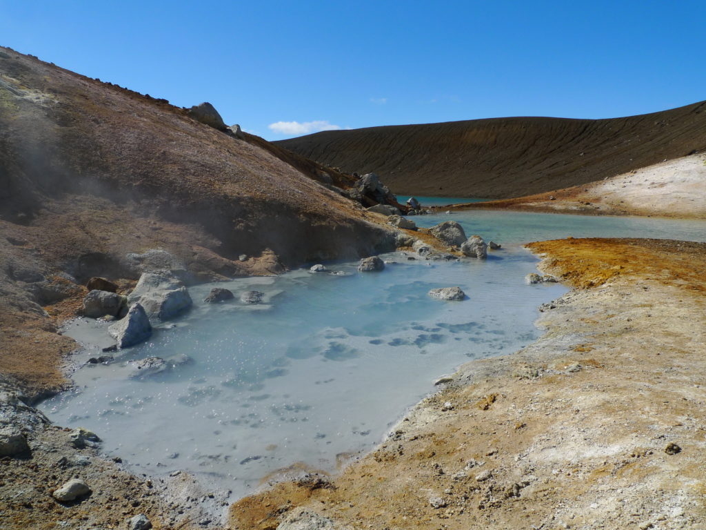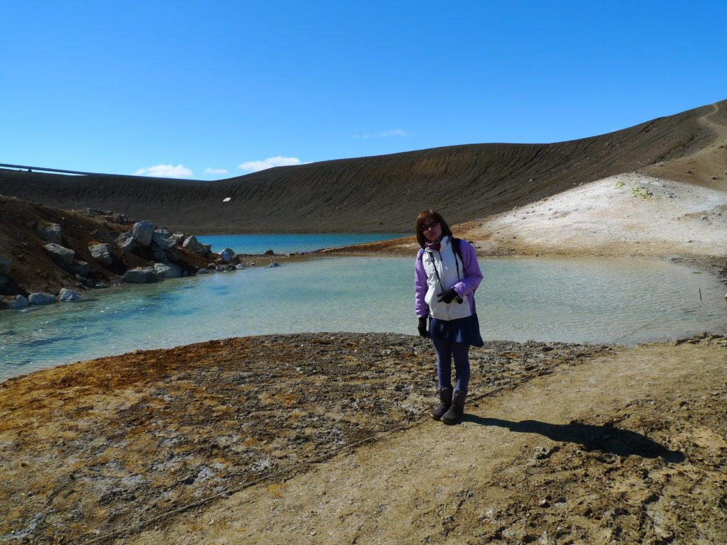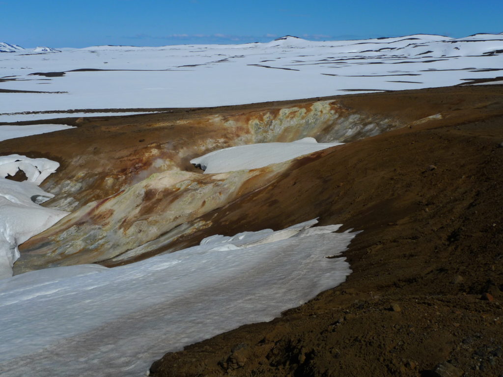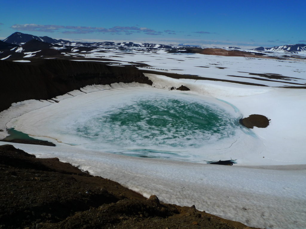 Today we kept exploring the area near lake Myvatn, starting by driving back up to the highlands towards mount Krafla. When we were getting close to our destination we started seeing cars parked along the side of the road and soon found out why. The road simply ended right there in a snowbank, the rest of it covered in snow. No matter, we parked by the road just like everybody else, then walked the rest of the way. The place we went to was another crater, this one partially covered in snow and the bottom filled with turquoise water frozen to ice in the cold highland air. On the backside there was also a smaller crater where the water was not frozen due to geothermal activity.