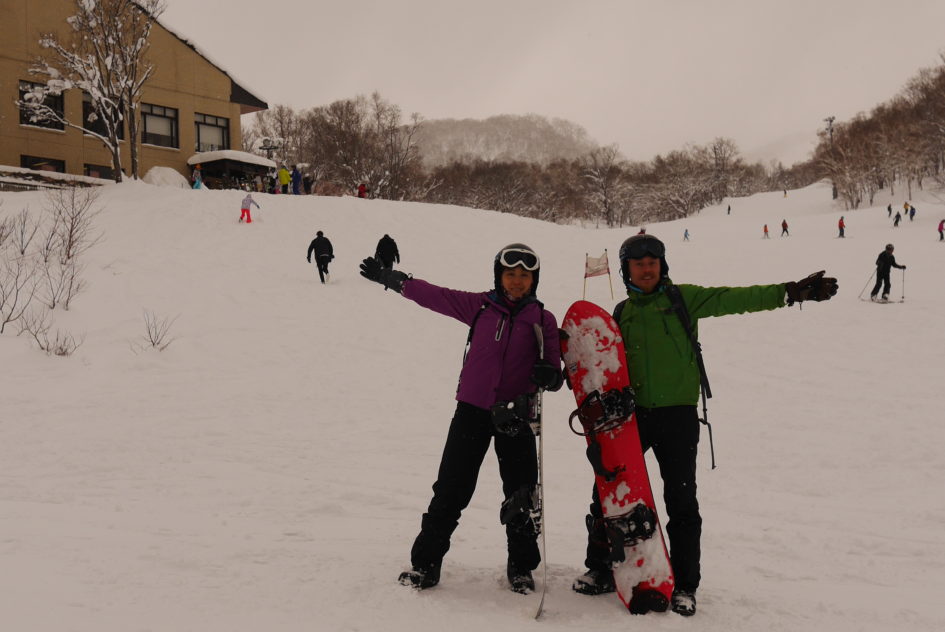 Not wanting to tire herself out too much Yini made this her last day in the slopes. When she went to return her equipment to the rental shop she realized she forgot to bring her regular shoes with her so she had to improvise a solution. She ended up strapping her gloves to the bottom of her feet then covering the rest with the ends of her rain trousers. It’s not something you’d want to wear for a long walk but it worked fine for the few meters to the bus.