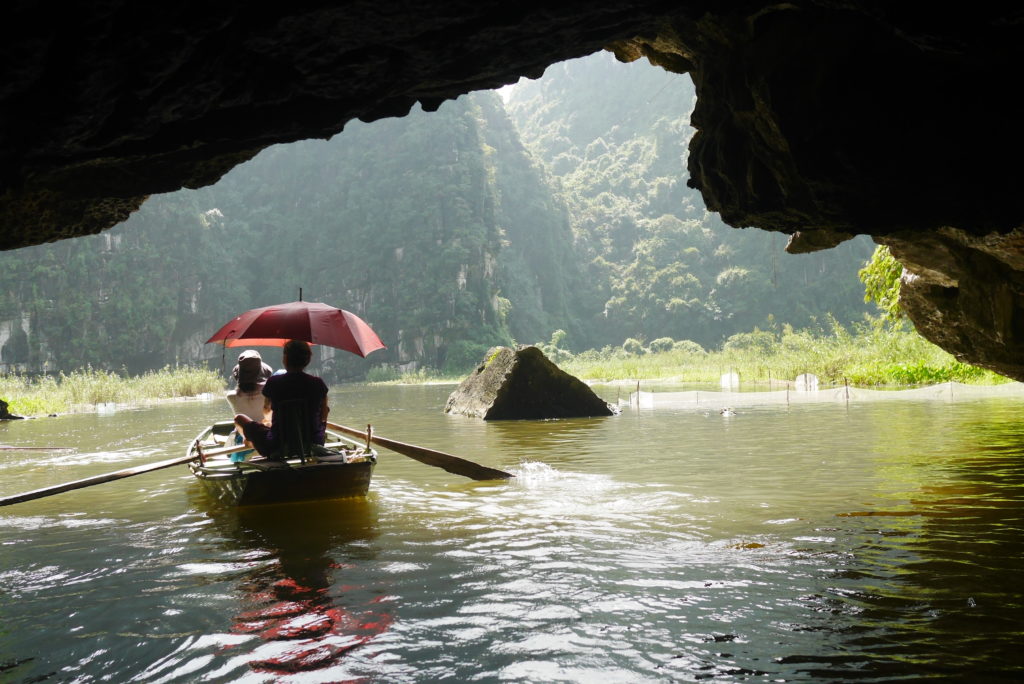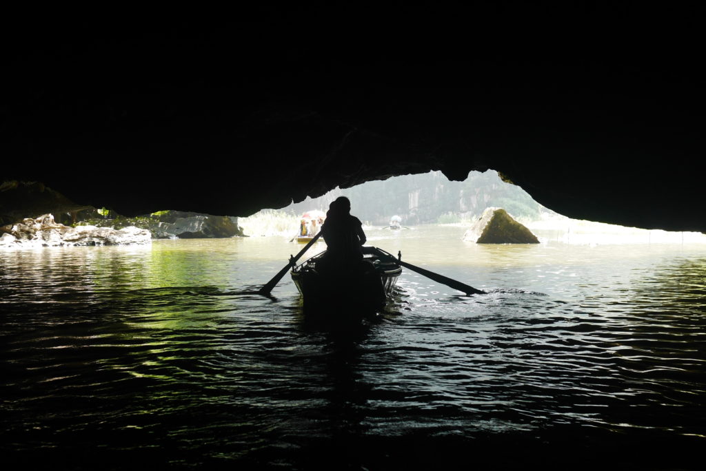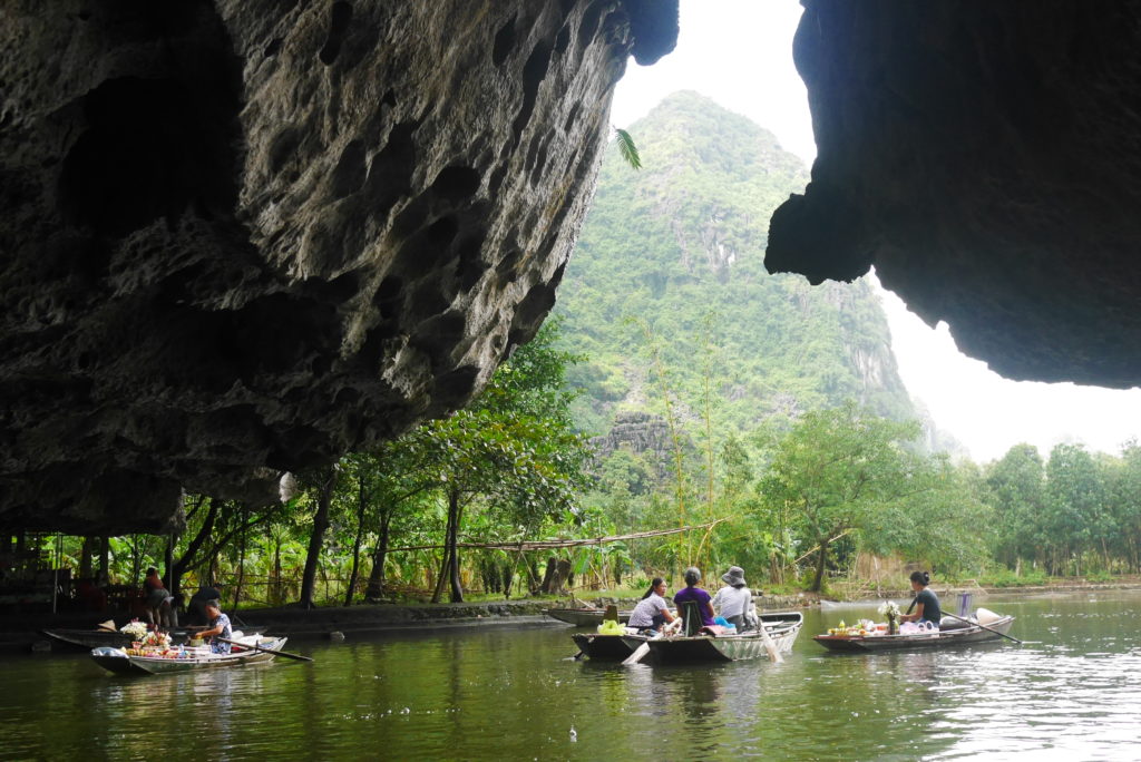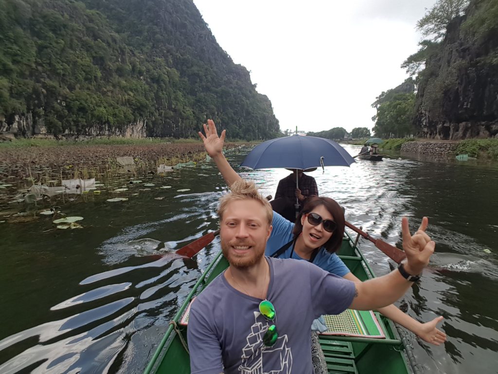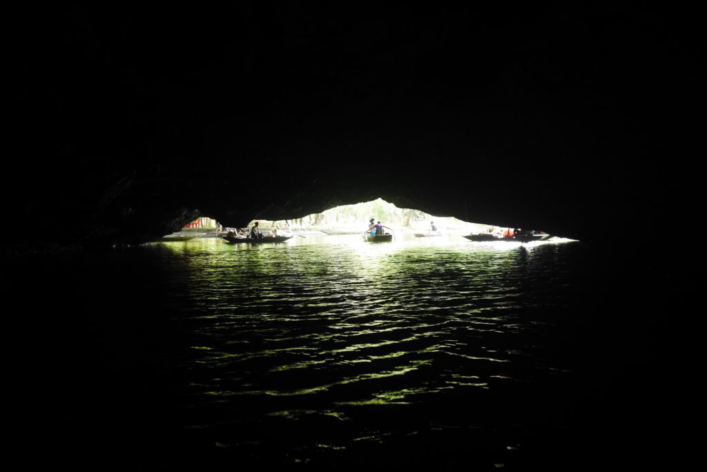 Ninh Binh itself is a pretty small town and not much to see inside the city. The reason people come here is to see the countryside. The landscape is somewhat reminiscent of that of Halong bay with the same kind of karst cliffs but instead of islands in the sea, they stick up out of fields, rice paddies and rivers. The best (or at least most famous) place for seeing this landscape is Tam Coc, some seven or eight kilometers from the city centre. You rent a boat for two or maybe three people and a local person rows (using her feet) you along a small, shallow river that meanders between, and sometimes through, the karsts. It’s sort of pricy but well worth it. Since we had just been to Halong bay before coming here you might think this would be too much of the same, but the surrounding landscape is so different it felt like a completely different experience.