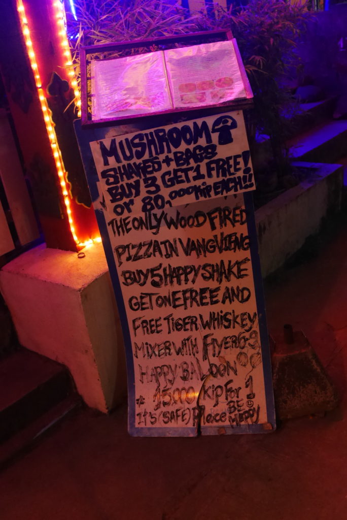 In the last few days I’ve taken a couple evening walks to see what goes on when people come back from the tubing. The answer is: apparently nothing, the town is set up for partying (a few places even offer “happy pizza” or “happy shakes”) but the bars and restaurants are nearly empty. It’s actually kind of strange to see.