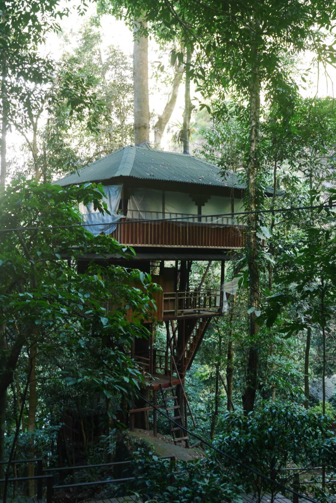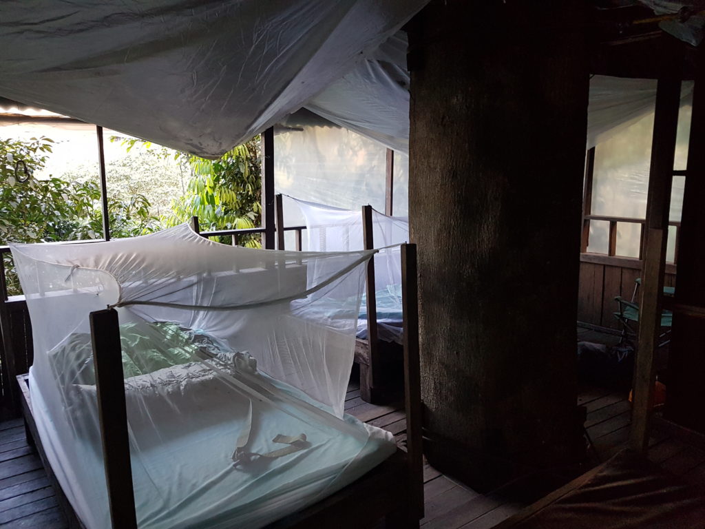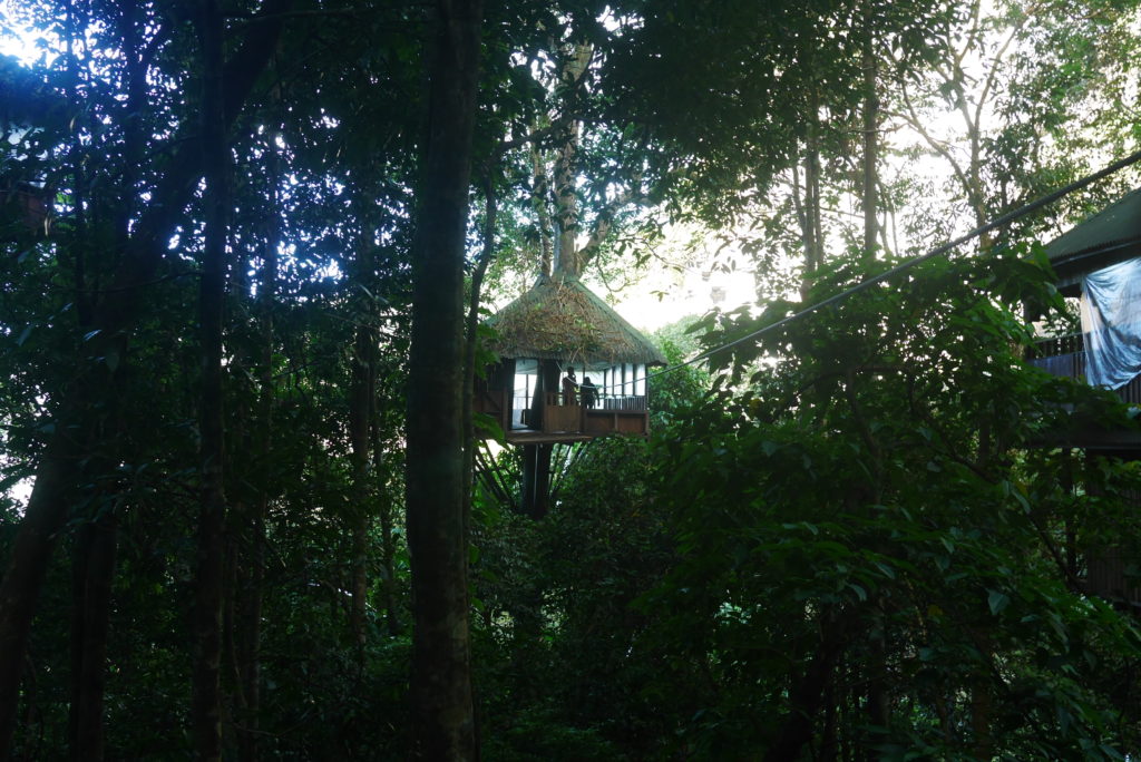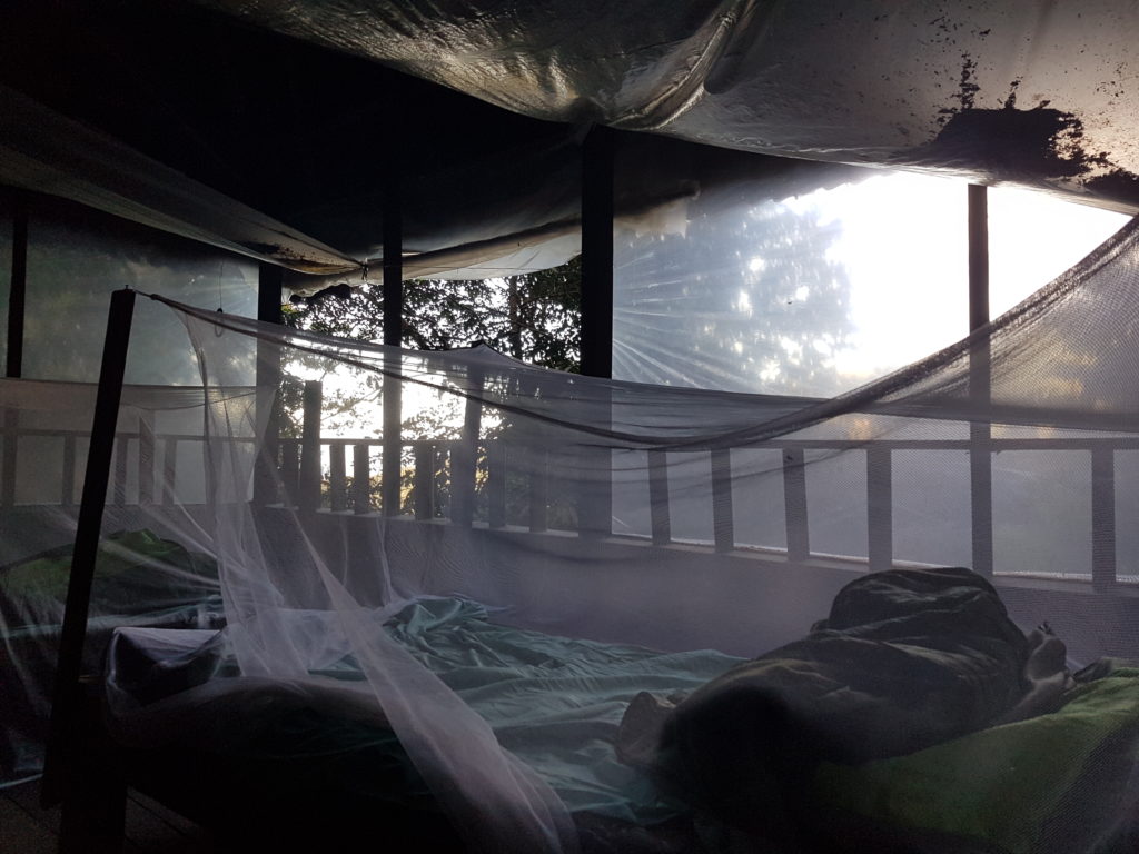 By mid afternoon we had done ten ziplines and came down to a couple of houses on platforms. We stayed there the rest of the afternoon and evening, relaxing, looking at the view and I even had a shower at the foot of the nearby waterfall. After dinner we sat chatting by the fire until around nine. At that time we had to strap on our harnesses again for the final zipline to our treehouse.