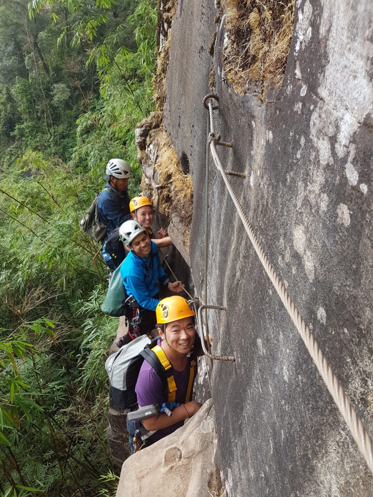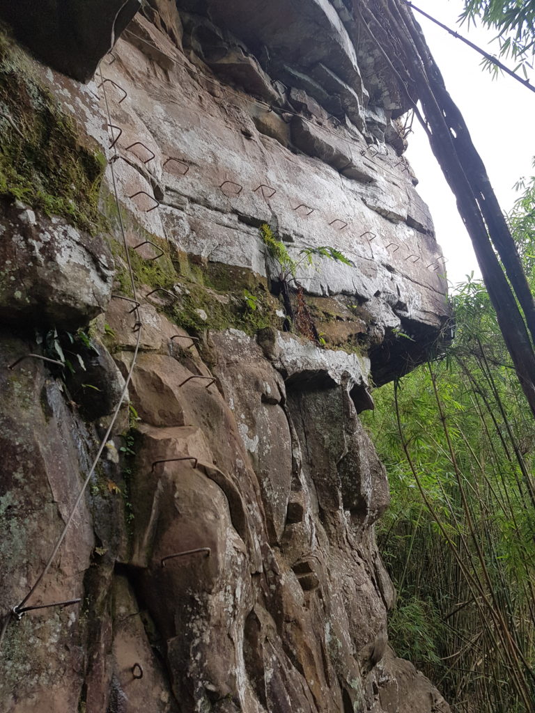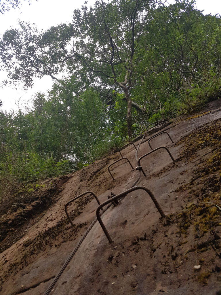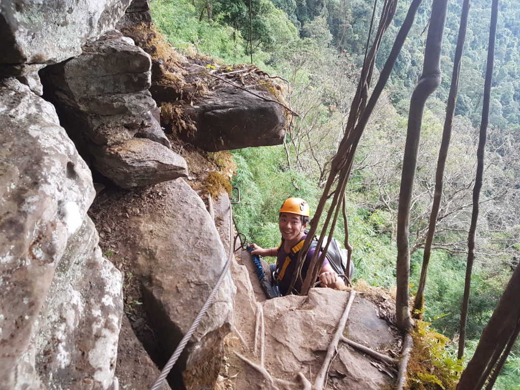 After doing a total of 13 ziplines we were rather low down and had to hike back up to the platforms for lunch. After lunch we continued hiking upwards along steep and rutted paths. It was hard going but eventually we were almost at the top. From there we had to climb a so called Via Ferrata to continue. Via Ferrata is a kind of path made from metal brackets drilled into the rock face. It’s kind of like rock climbing except you have guaranteed hand and foot holds. Climbing up was a little bit scary but great fun.