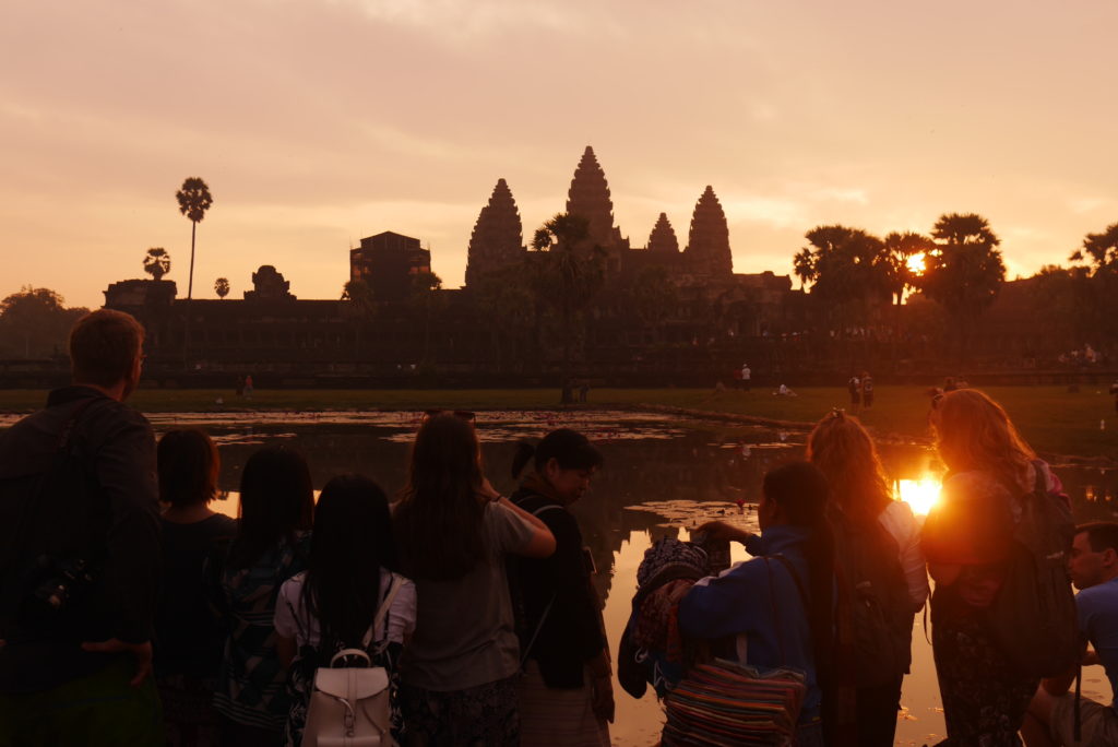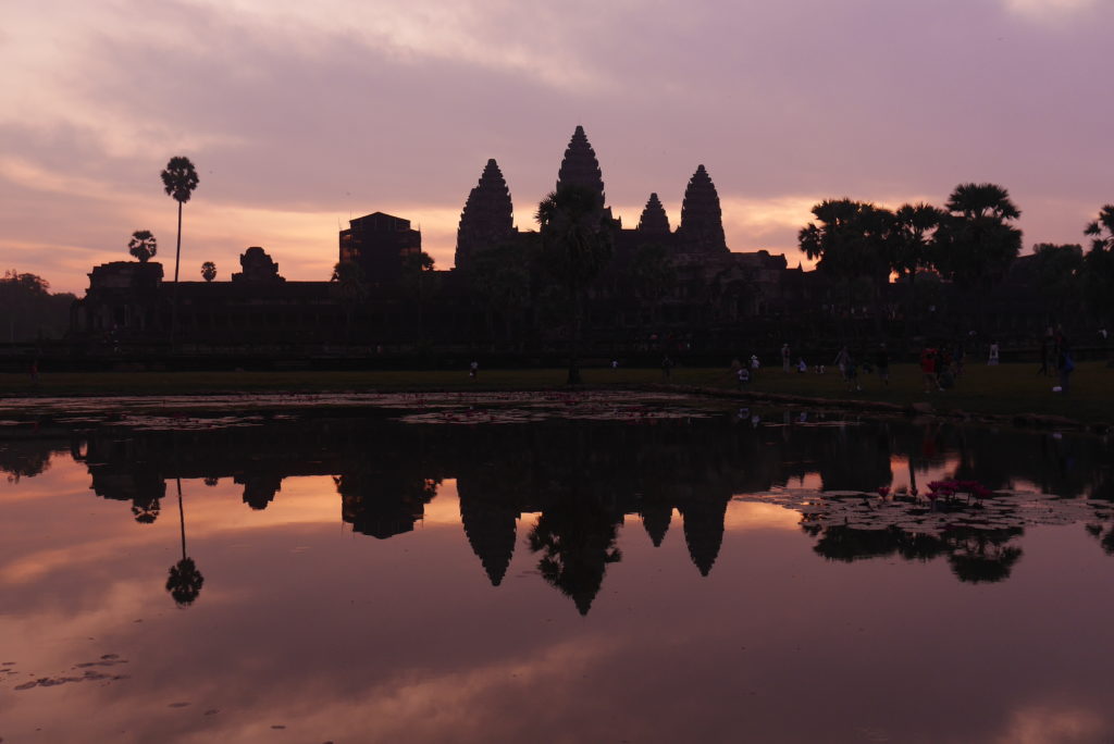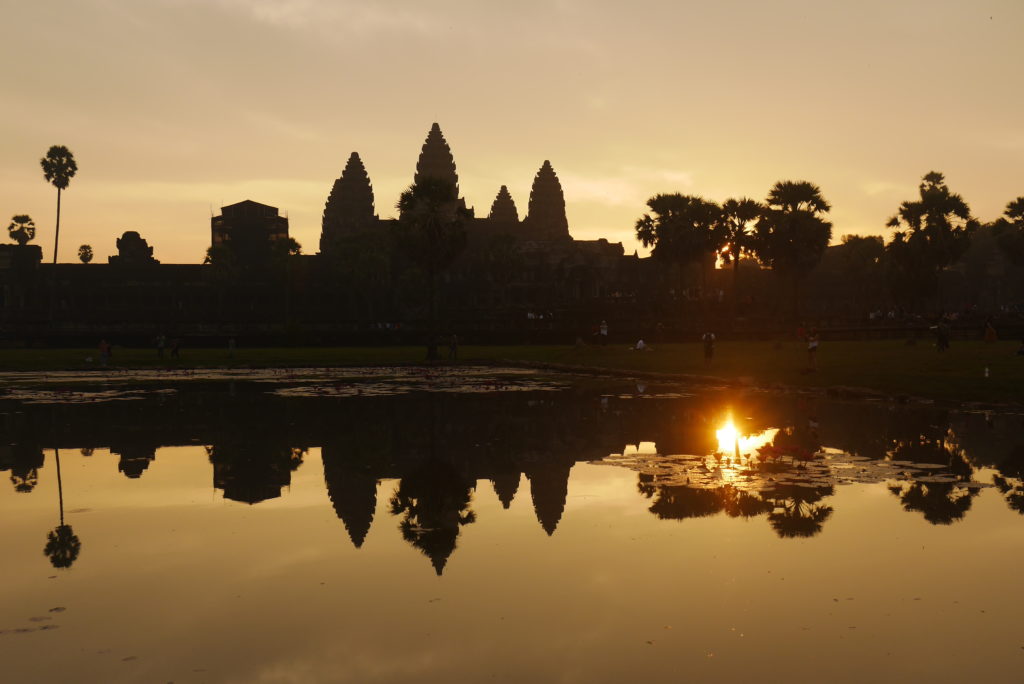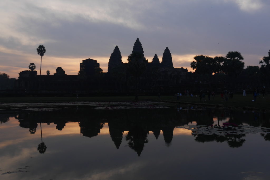 When we arrived at the temple there were already some people waiting but we managed to claim a spot right at the edge of the pool facing the temple. Soon there was a veritable crowd, three rows deep lining the edge of the pool, we were lucky to be so early. After a while we started seeing the contours of the temple against the night sky. After that the sun started to rise for real, the sky changing from dark blue to pale yellow to orange as the sun rose over the top of the temple, with the silhouette of the temple reflected in the still surface of the pool. It’s quite a sight, definitely worth losing a bit of sleep for.