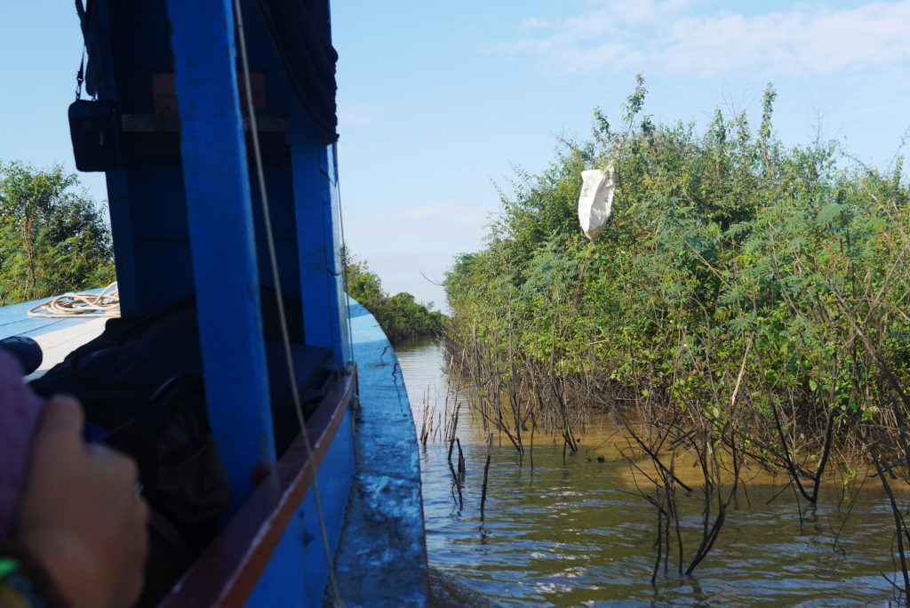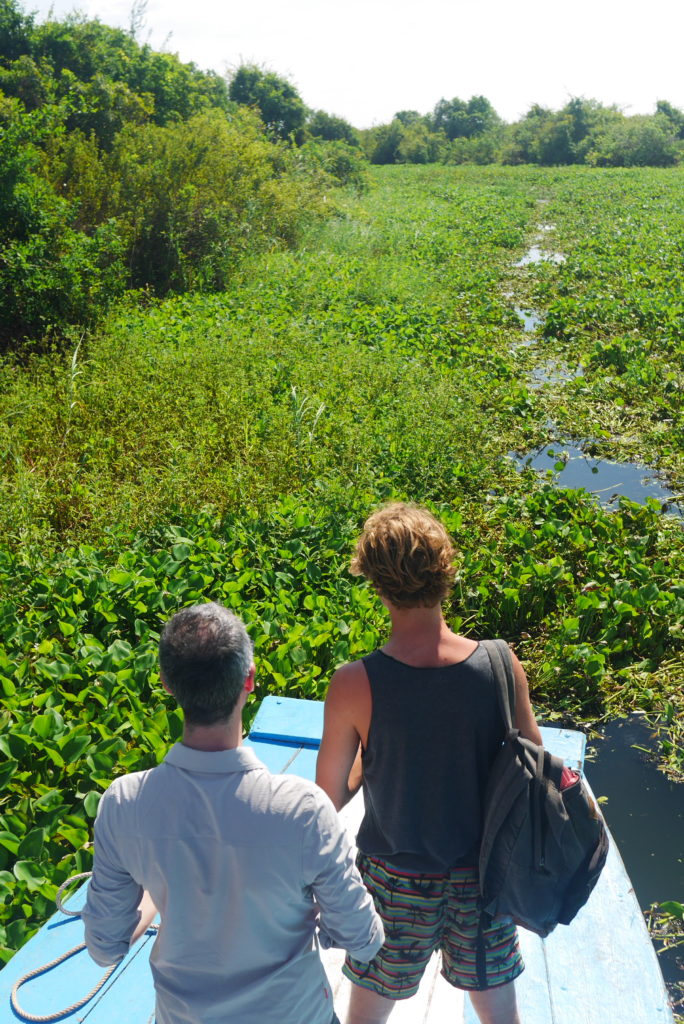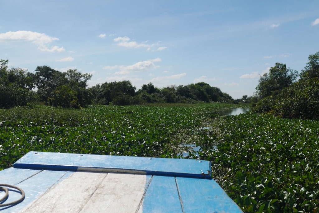 After leaving the last floating village the going got pretty tough. Not only was the the channel very narrow, there was such a mass of floating vegetation that it was like sailing through a field. It’s kind of strange to see a whole field moving as the wake of the boat goes through it.