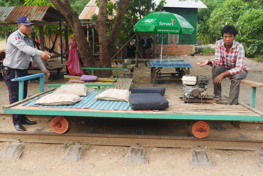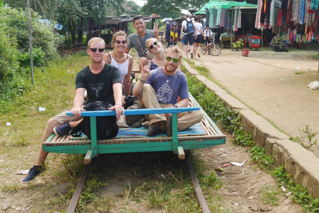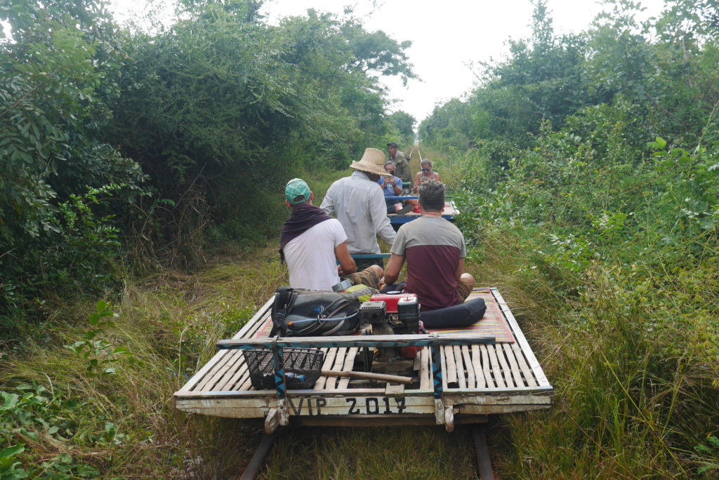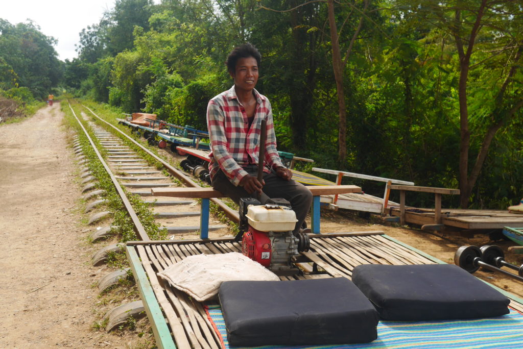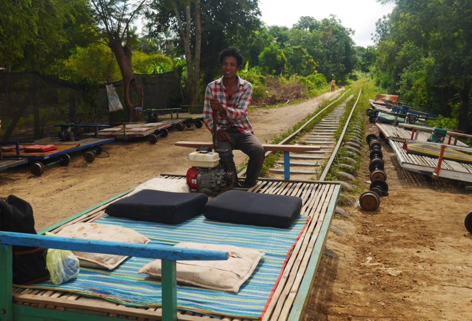 My main reason for coming to Battambang was the bamboo train which sounded really cool. So, this morning I rented a motorbike and headed out to the train station. The train is actually more like a small rail cart consisting of a wooden frame covered with bamboo slats that rests on two axles and is driven by a little petrol engine at the back. Me and my companions, a guy from Singapore I talked to on the boat yesterday and some guys from his hostel, took our seats on the little cusions provided, and off we went along the crooked, badly aligned rails. The train doesn’t really go anywhere, just out to some souvenir shops and back again but it’s a fun experience.