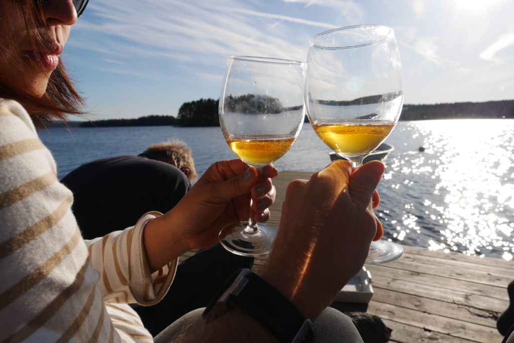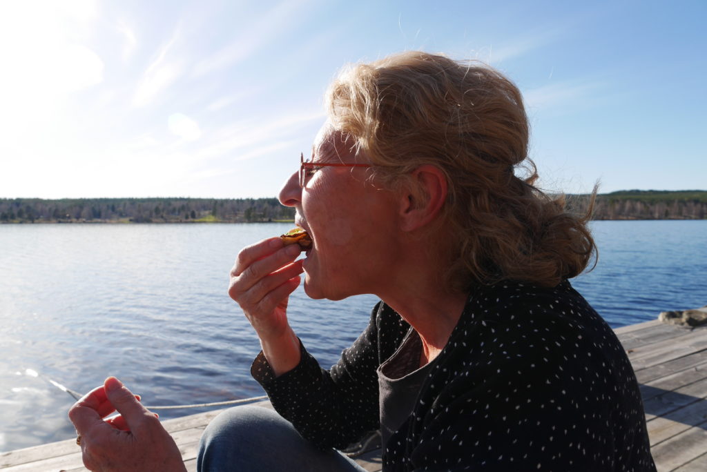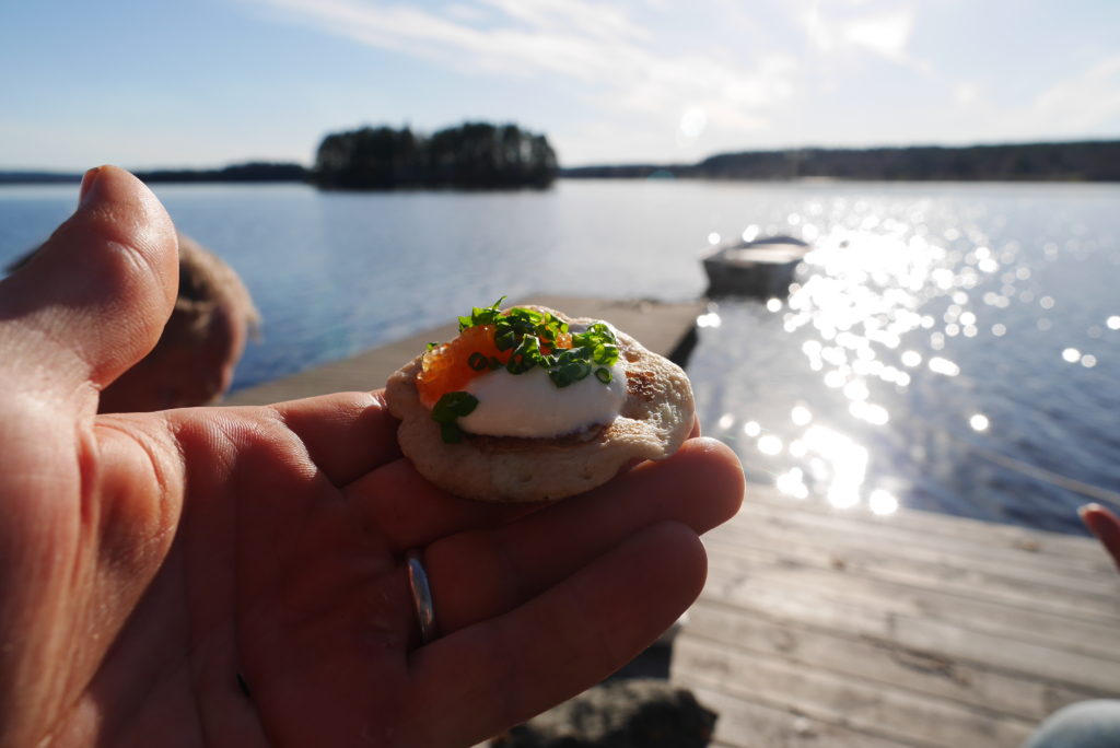 It is a familiy tradition to have blinis (Russian pancakes) with sour cream and vendace roe down at the jetty