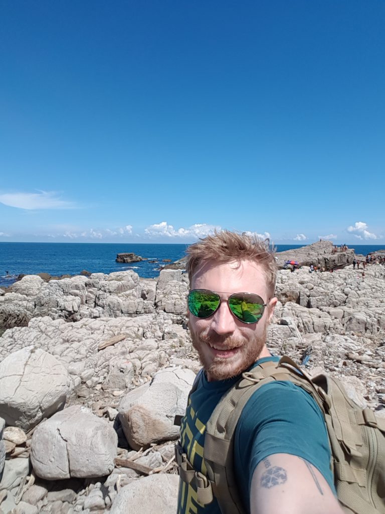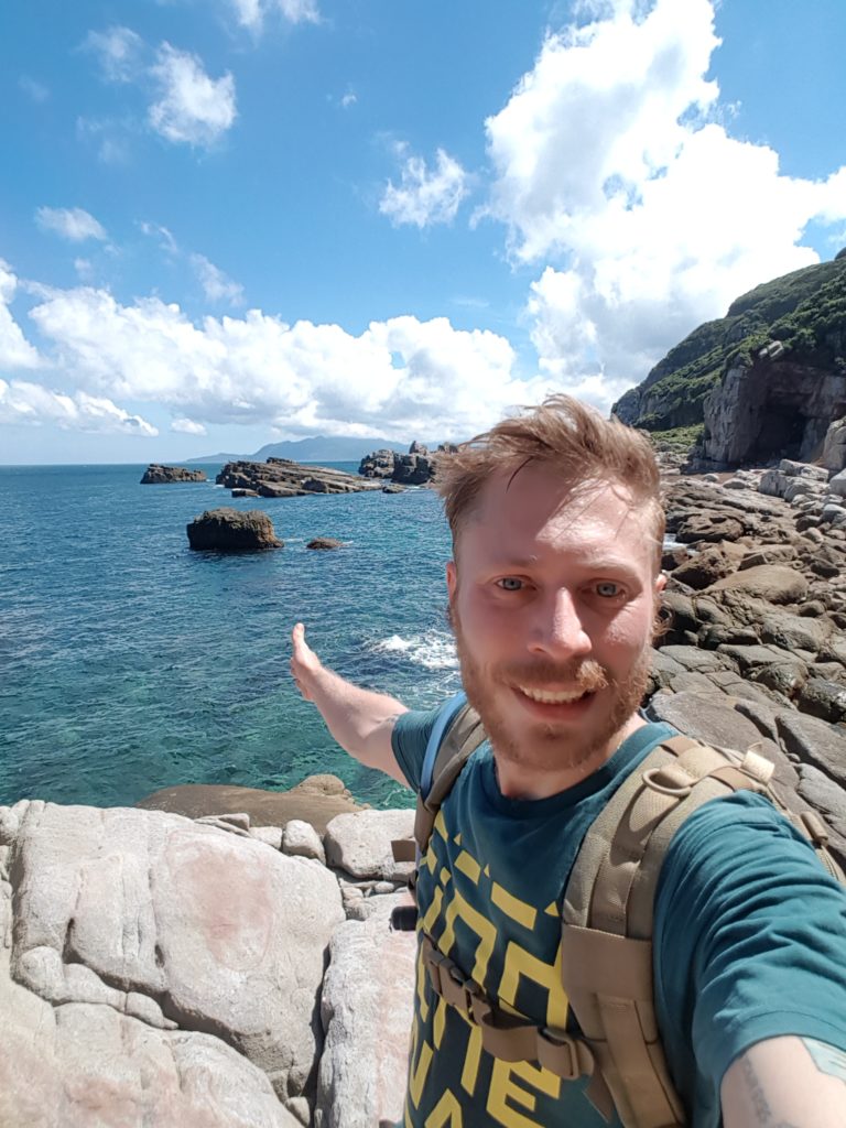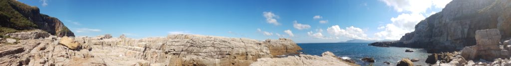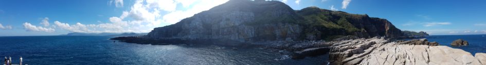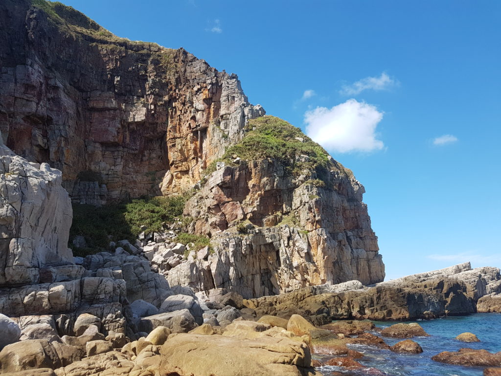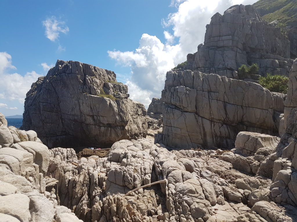 To go climbing in Long Dong you need equipment, which I don’t have, you need to know lead climbing, which I don’t, and you need to know the routs, which I also don’t. Instead of real climbing my idea was to do a bit of what is usually called scrambling, a combination of walking, jumping and climbing to move around in uneven terrain, sort of like parkour for rocky terrain. My idea was to go a few kilometers past Long Dong, scramble across the beach, then walk back along the road. When I got a few hundred meters past Long Dong however, I realized that that wasn’t going to work because the beach was blocked by some kind of resort. Instead I parked at Long Dong and started scrambling along the beach, thinking I could turn around when I got to the resort.