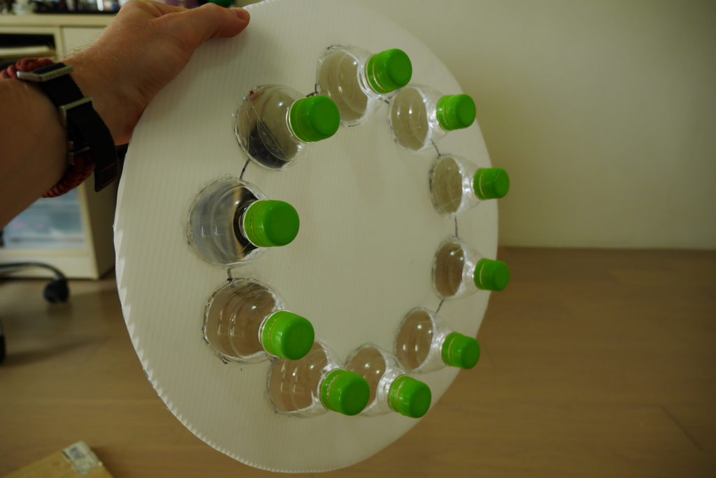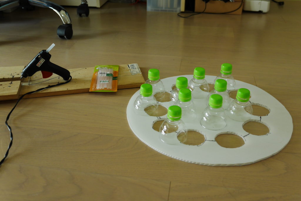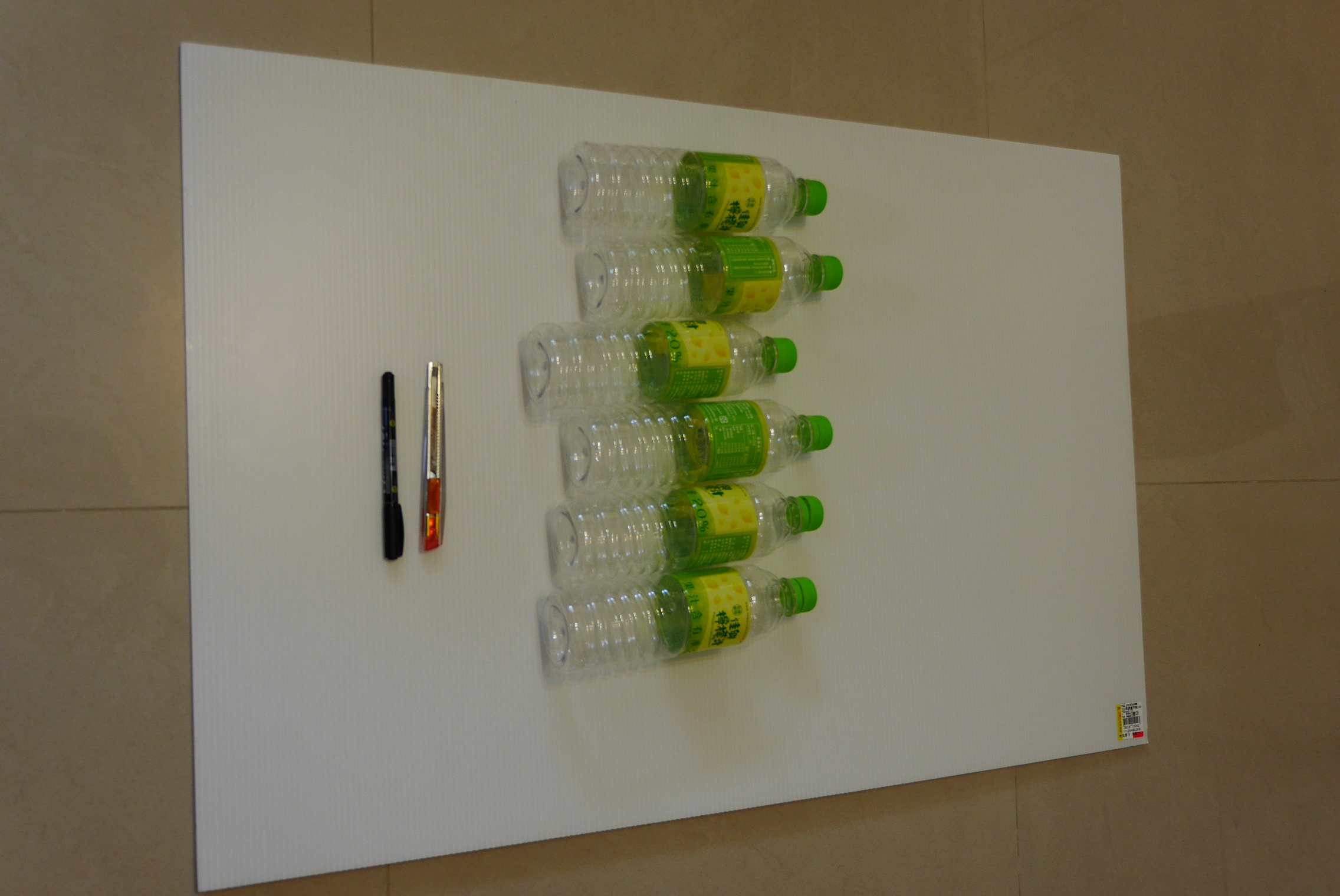 As can be seen in the article you only need some plastic bottles and a backing board of some kind. I though 6 bottles would be enough but I ended up using 10 of them. The board I’m using is a kind of plastic board you can find in stationary stores here in Taiwan. They have a structure similar to cardboard which makes them light and sufficiently strong for small projects.