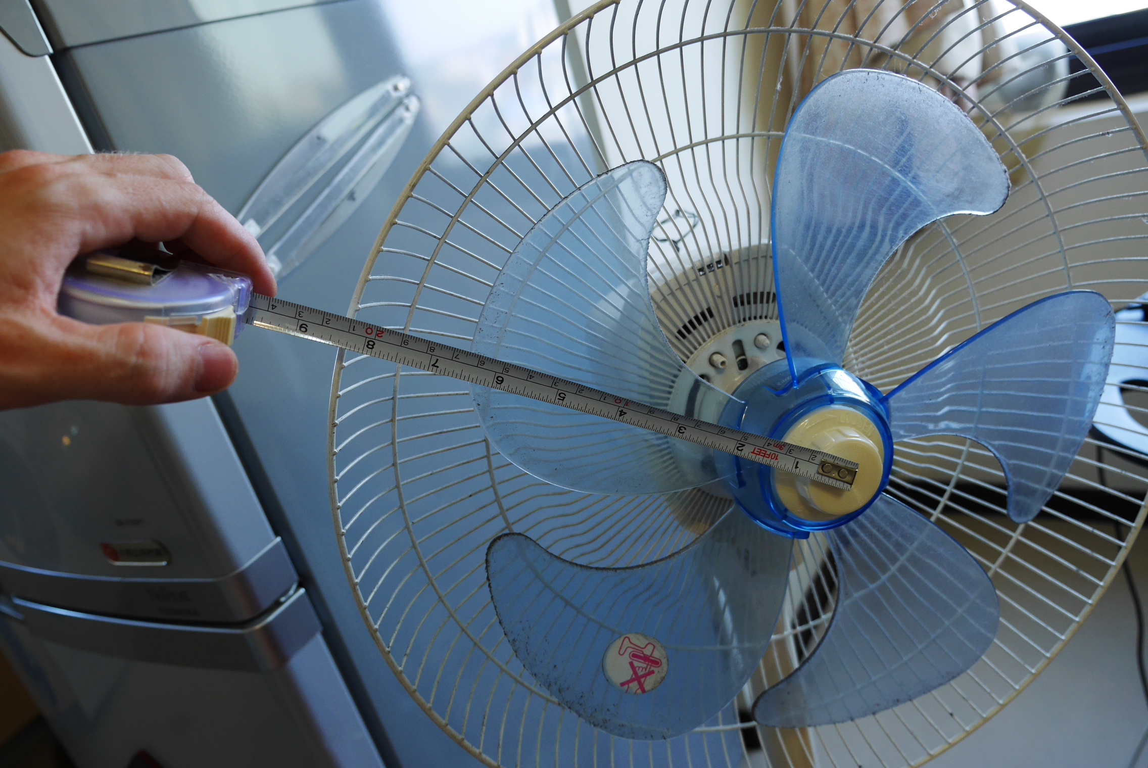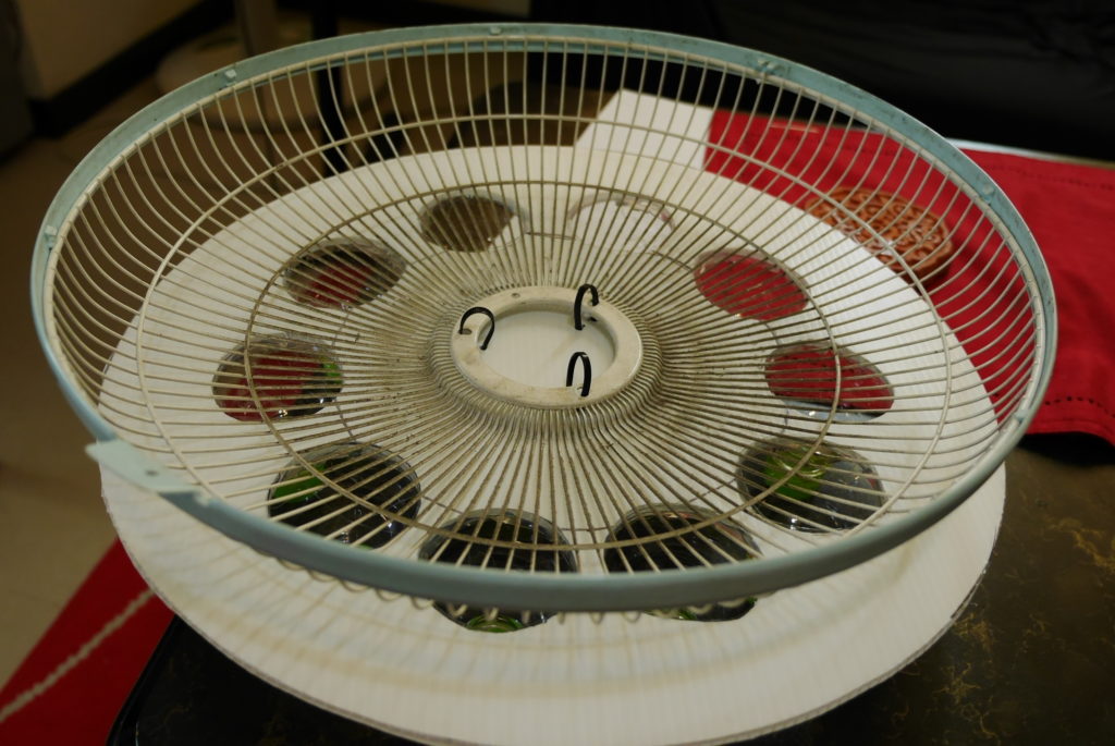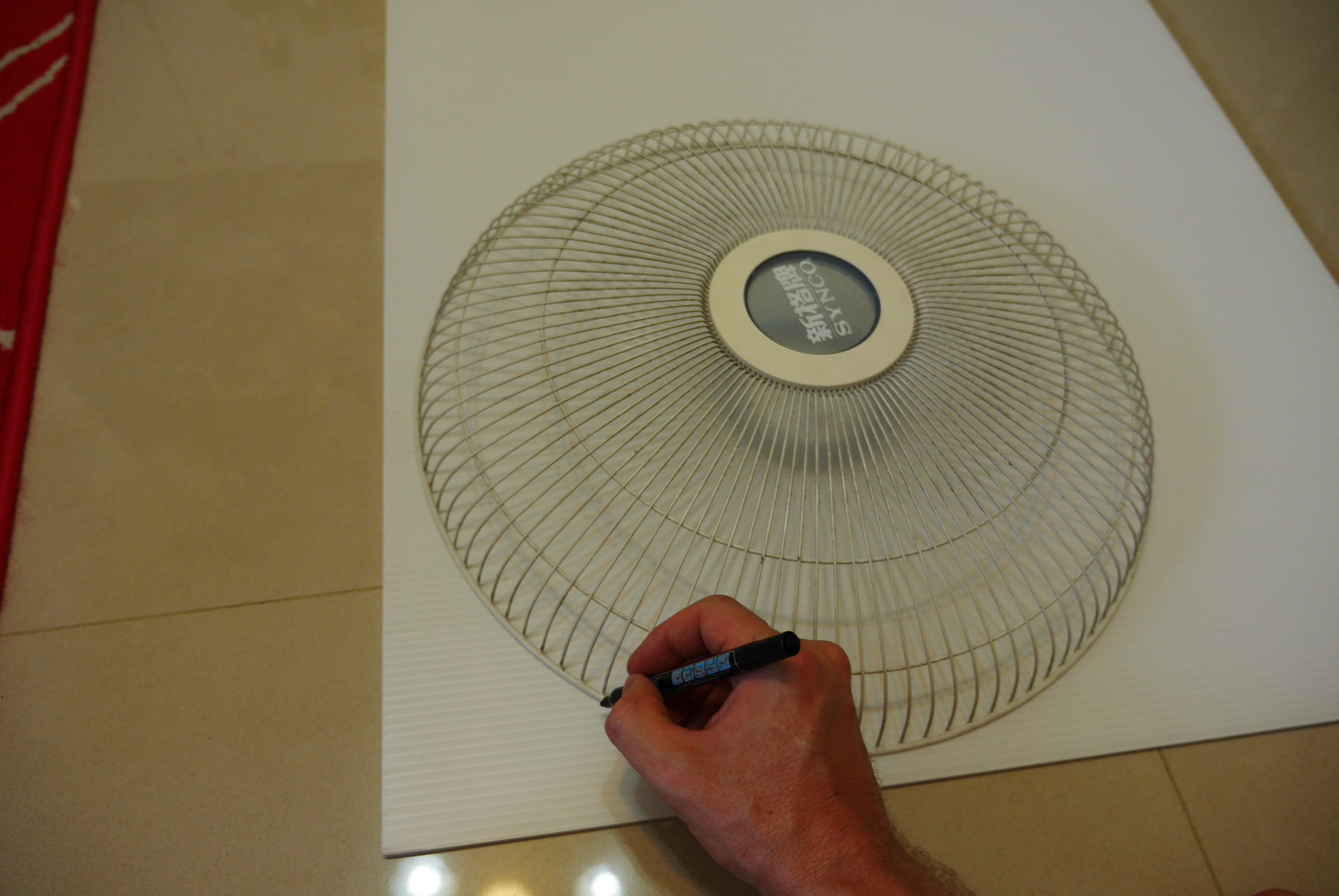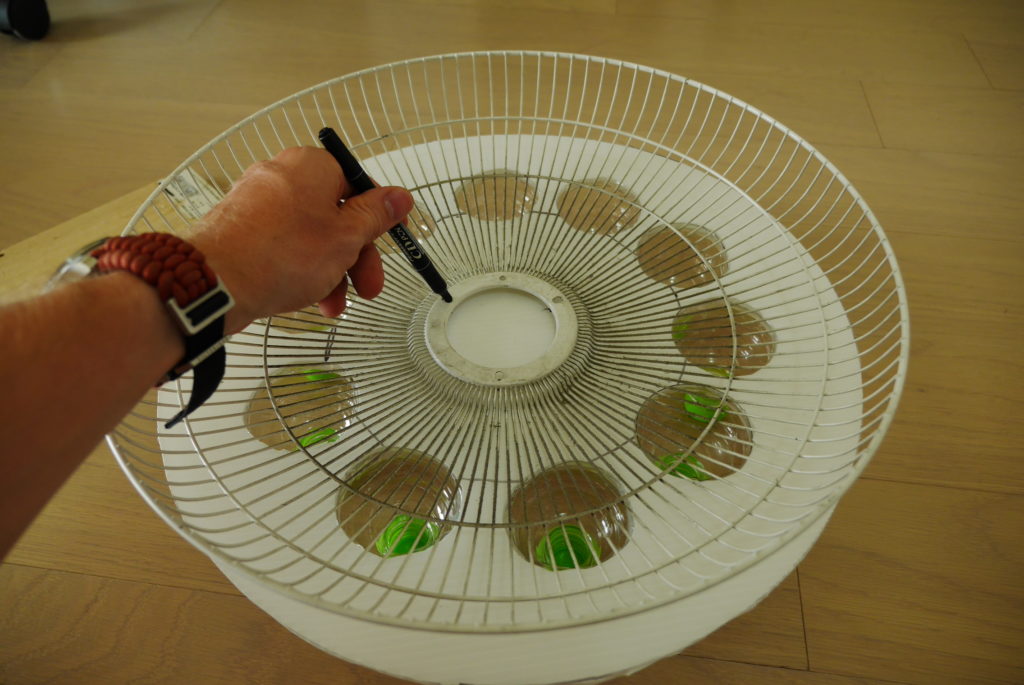 I measured the fan to find how far from the edge to place your bottle tops. I’m not sure what is the best placement but I chose to put them at the widest part of the fan blades.