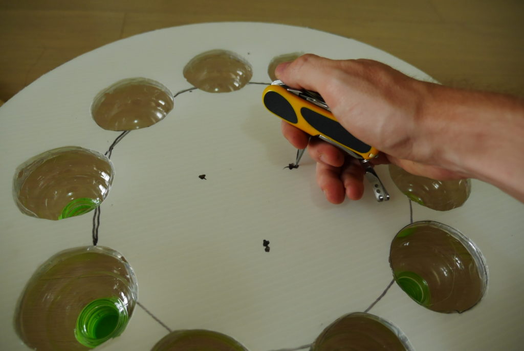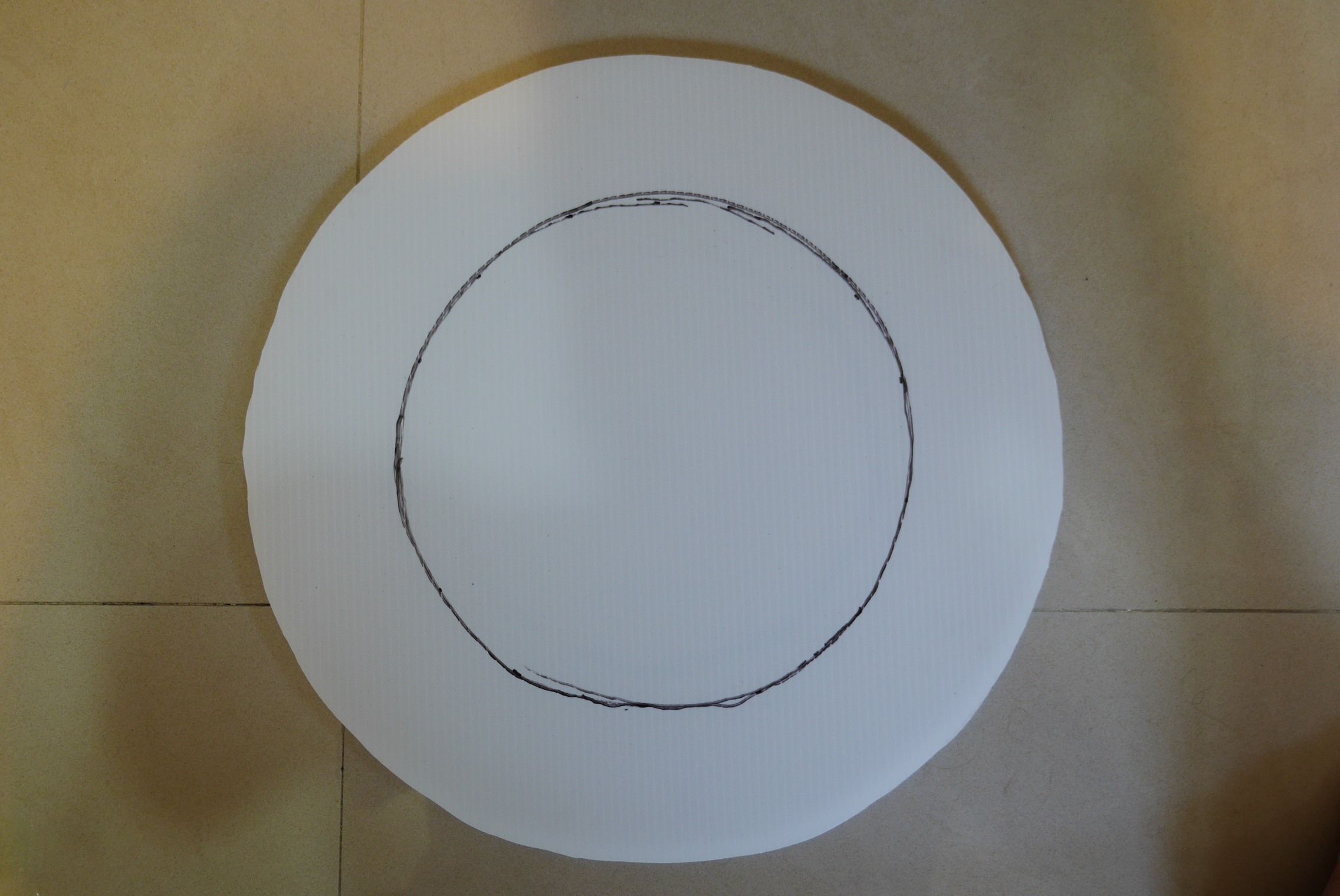 I cut out my backing board and drew a circle marking where I would place my bottle tops.