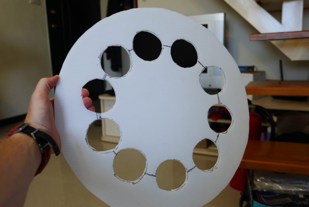 The fan I’m attaching this to has a large hole in the center of the shell (there used to be a cover but it has fallen off) with three smaller holes around it. These would work nicely as attachment points. I made two sets of holes, one matching the three holes in the fan shell and one slightly inside the original holes.