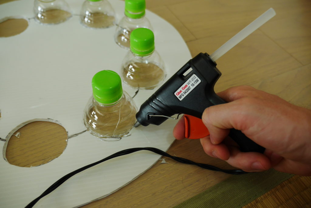 I used a hot glue gun to glue the bottle tops in place. I’m using a small glue gun for crafts which is safe and wont burn the plastic. The industrial kind might damage the plastic or your fingers.