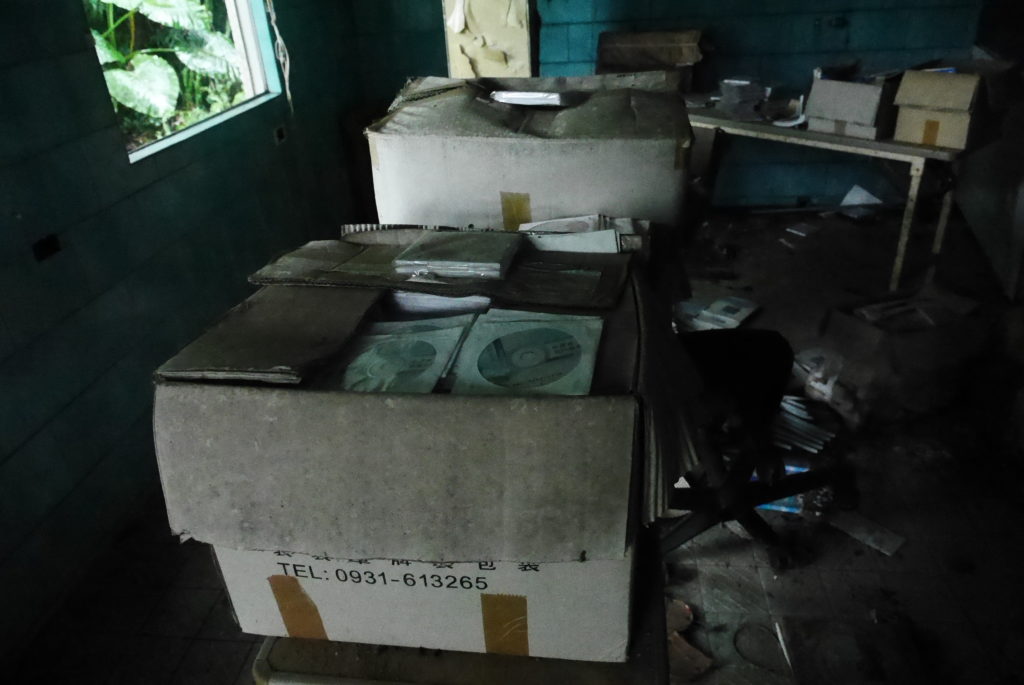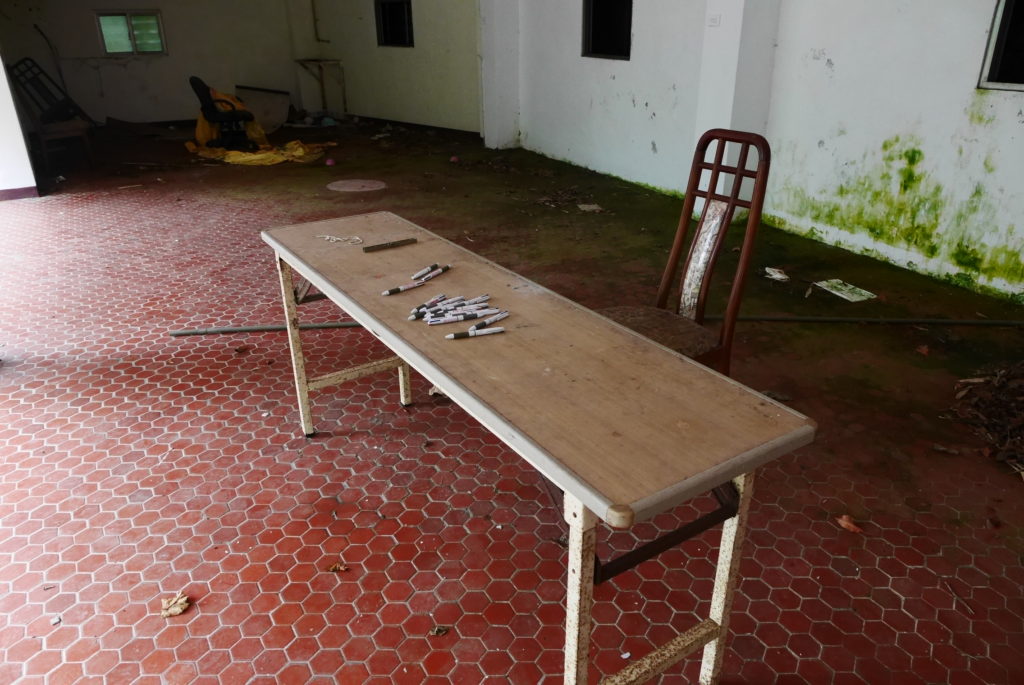 The pens on this table are too new and too clean to have been left there when the place was first abandoned