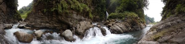 The two fishermen on the beach warn us that the current is strong but I ignore them and follow my friend as he steps into the water. A few steps out the river bed drops away abruptly and I sink down to my chest, my watertight backpack floating up behind me like a cork. The water is cold and I can feel the current tugging at my body, wanting to pull me away and send me down stream. A feeling of trepidation flashes through my mind for a brief moment but disappears when I see my friend fearlessly continue forward, so I push on with determination. As we round the slight bend in the river I look up to the right where a smaller side stream comes cascading down the cliffs to join ours. Further along the little creak, the water flows over the edge of the high, jungle clad cliffs and comes crashing down into a small pool, sending spray high into the air. This place is imbued with a combined sense of danger and beauty and here and now, at this very moment, that is all I need.