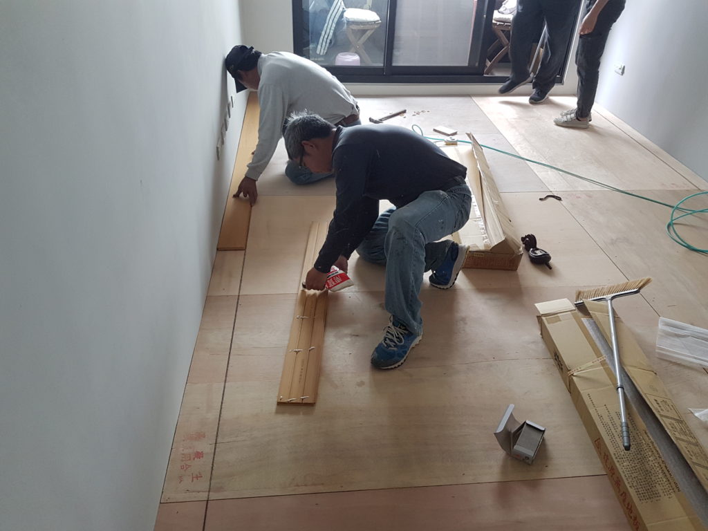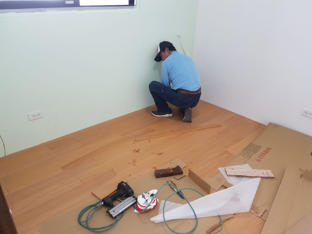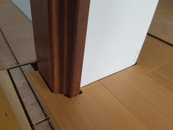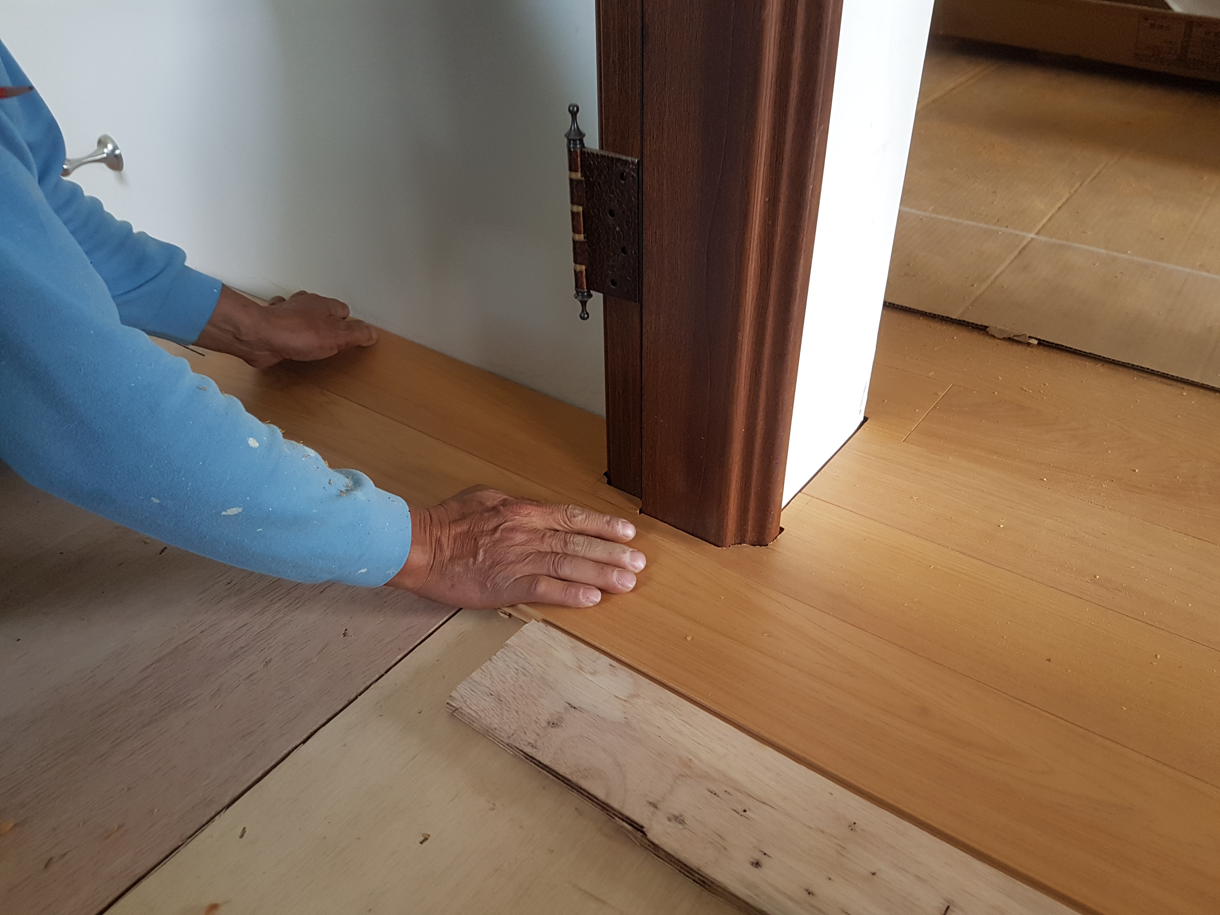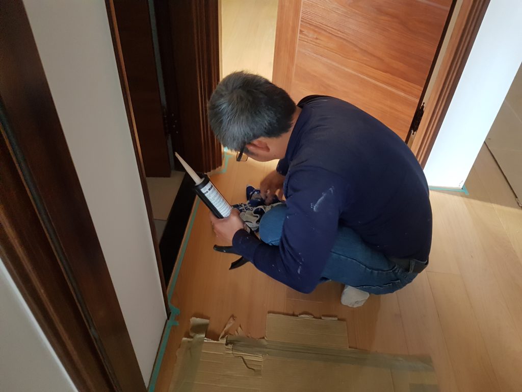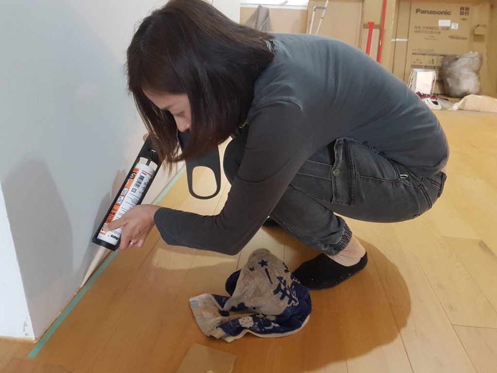 They filled the gap between the last board and the floor with silicone. Since they ran out of silicone Yini had to finish the job for them