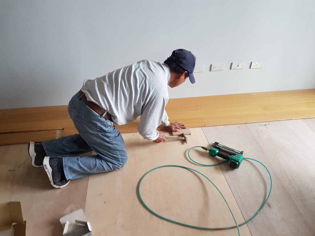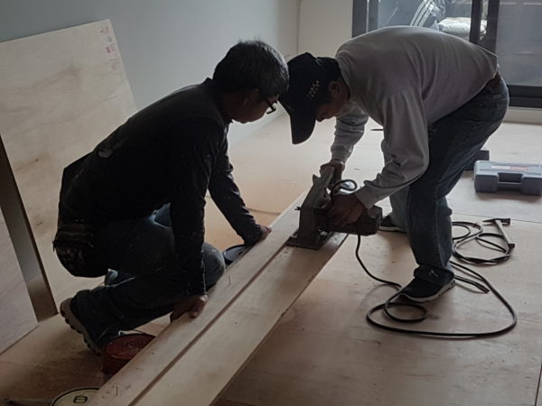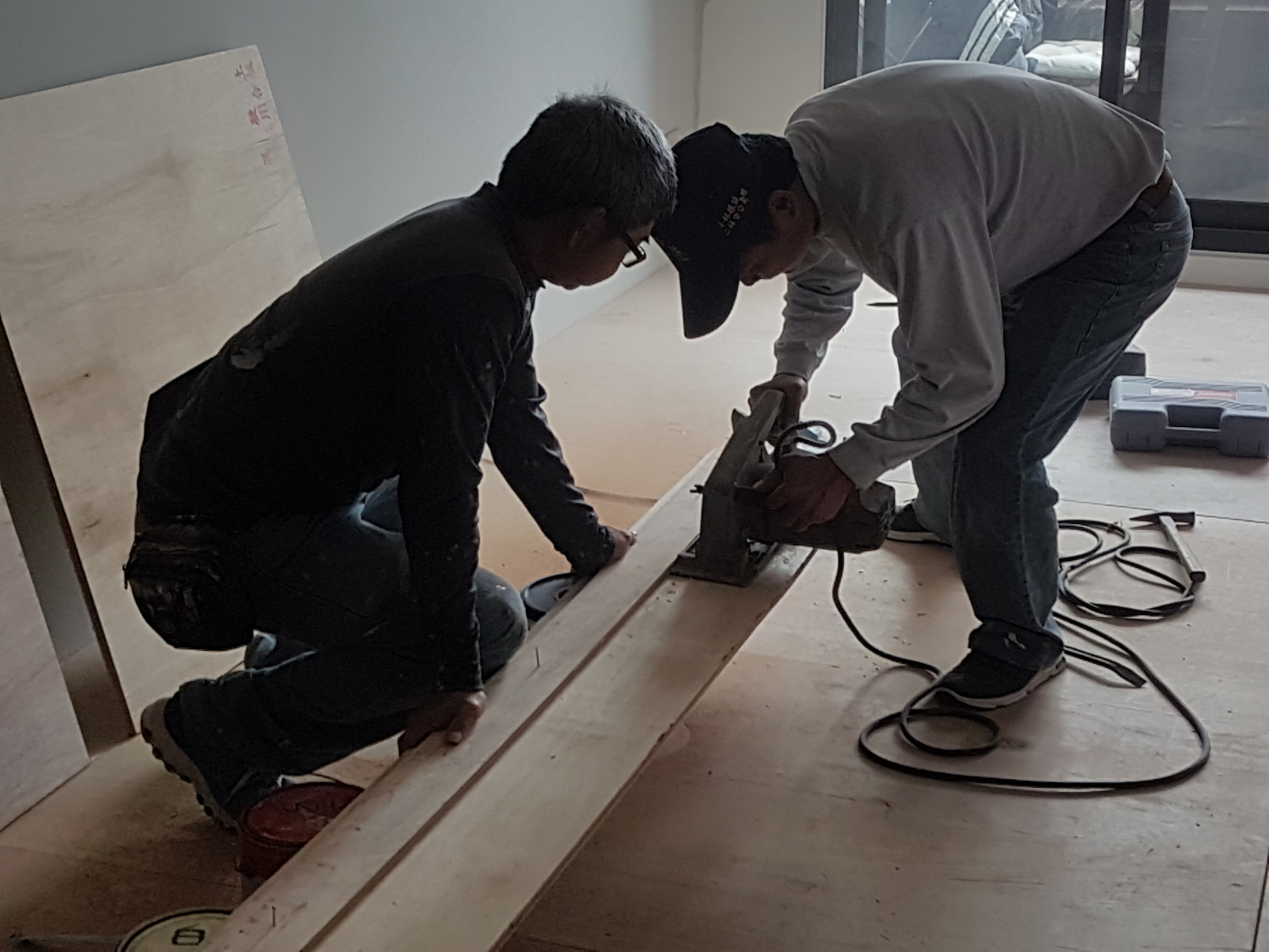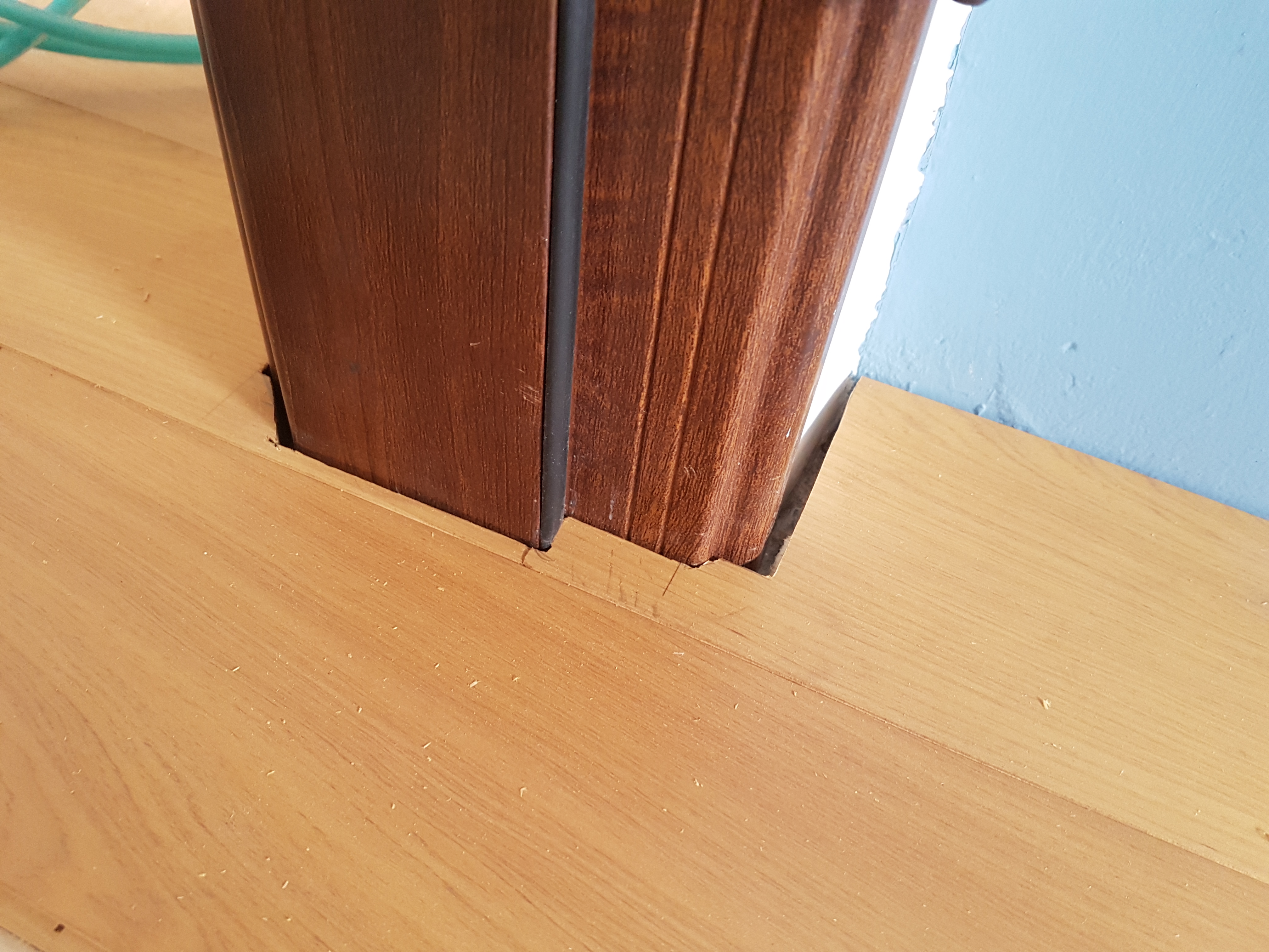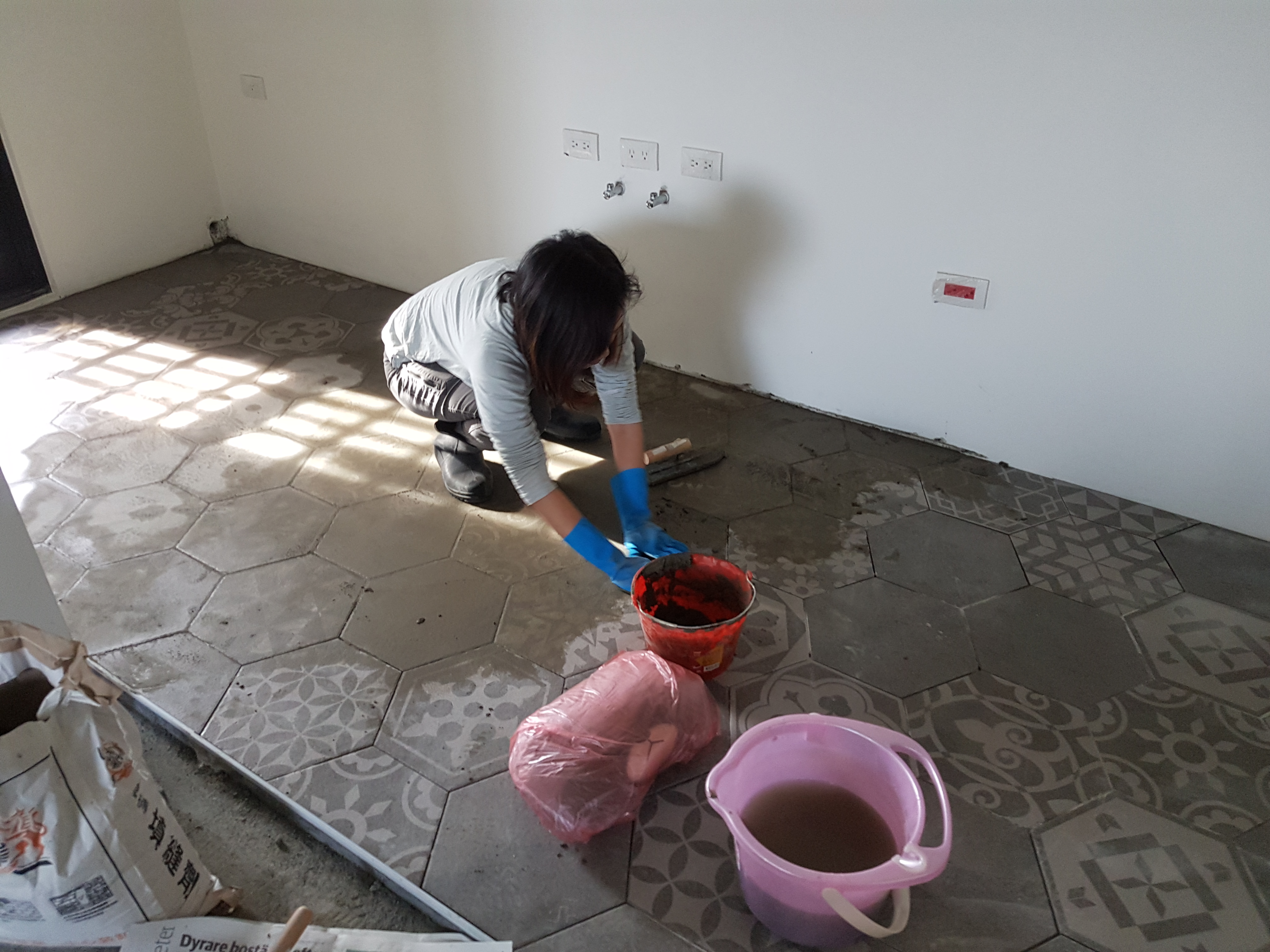 They filled the gap between the last board and the floor with silicone. Since they ran out of silicone Yini had to finish the job for them