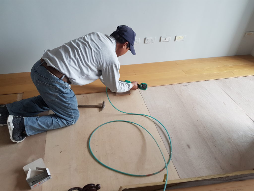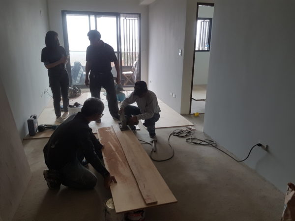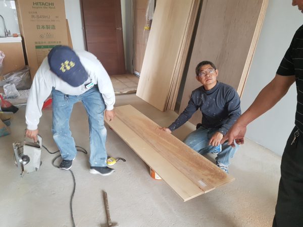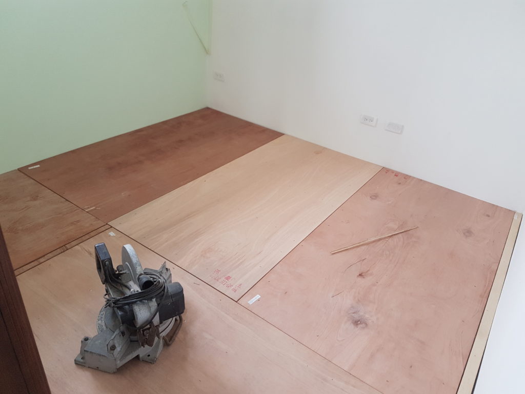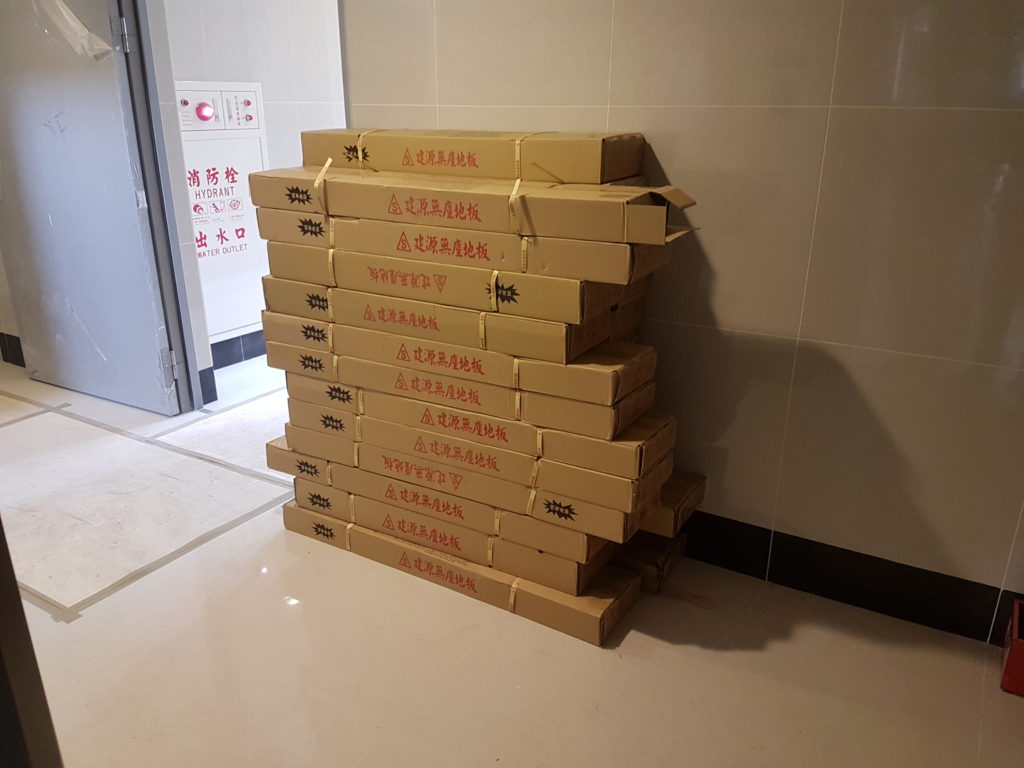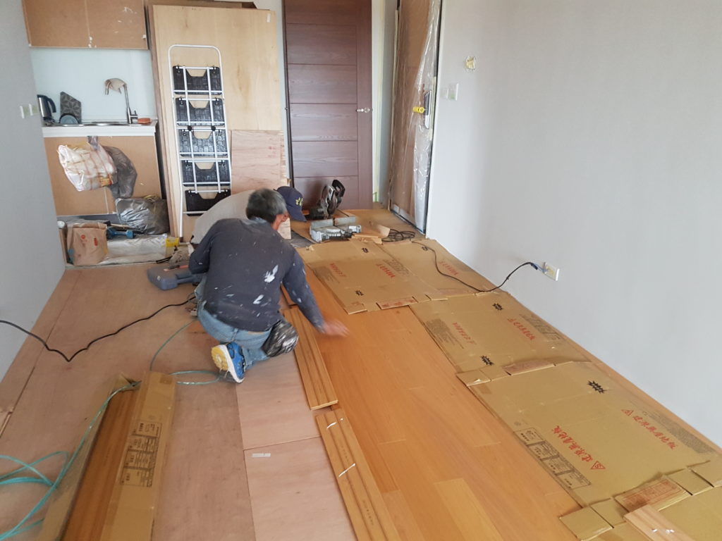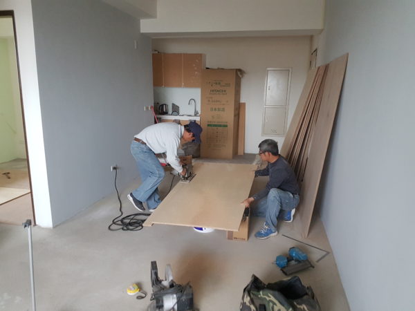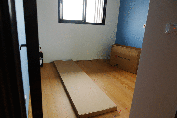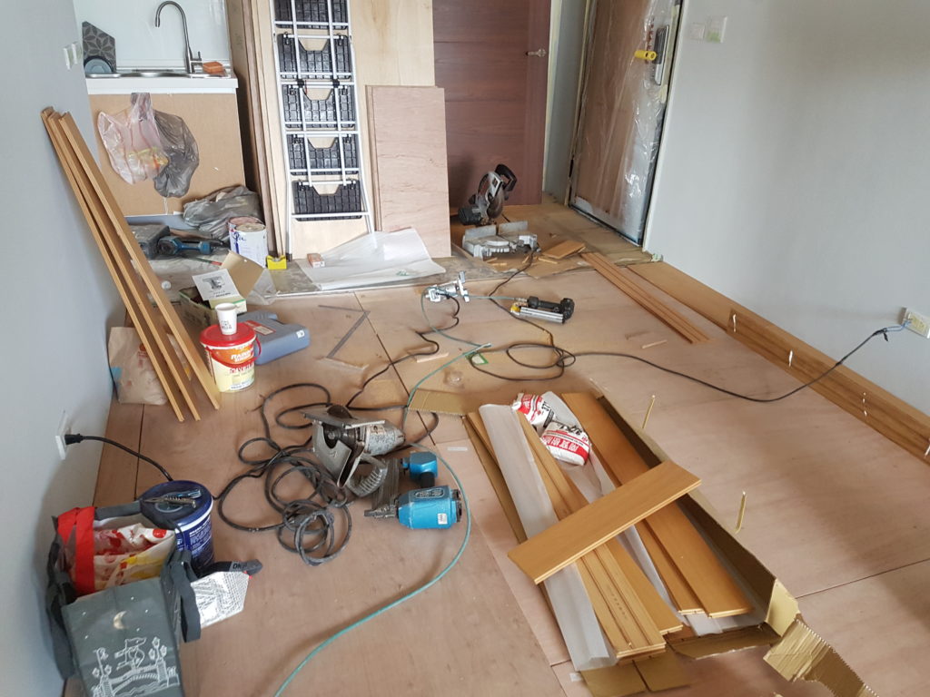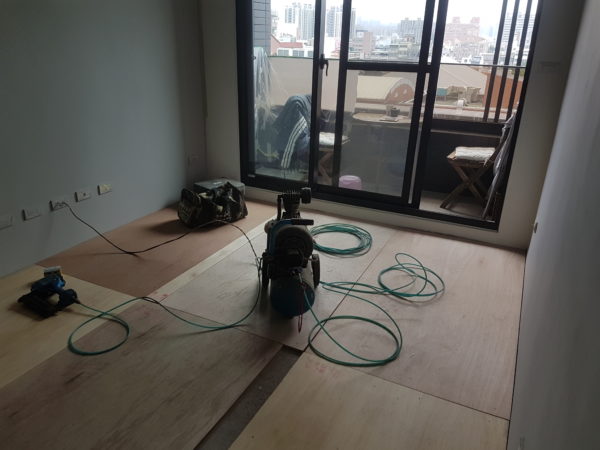 I believe I could have done a lot of the work with the floor on my own if I just had the right tools, but the parts closest to the walls seemed rather difficult and I’m glad we had professional craftsmen to do it. Once the walls and floor were done the only major thing remaining was the AC. We would have preferred to install the AC before the wooden floor as both we and the AC installation guys were afraid of damaging the floor. Due to some scheduling problems we weren’t able to arrange it that way. In order to protect the floor we covered nearly the entire apartment in cardboard.