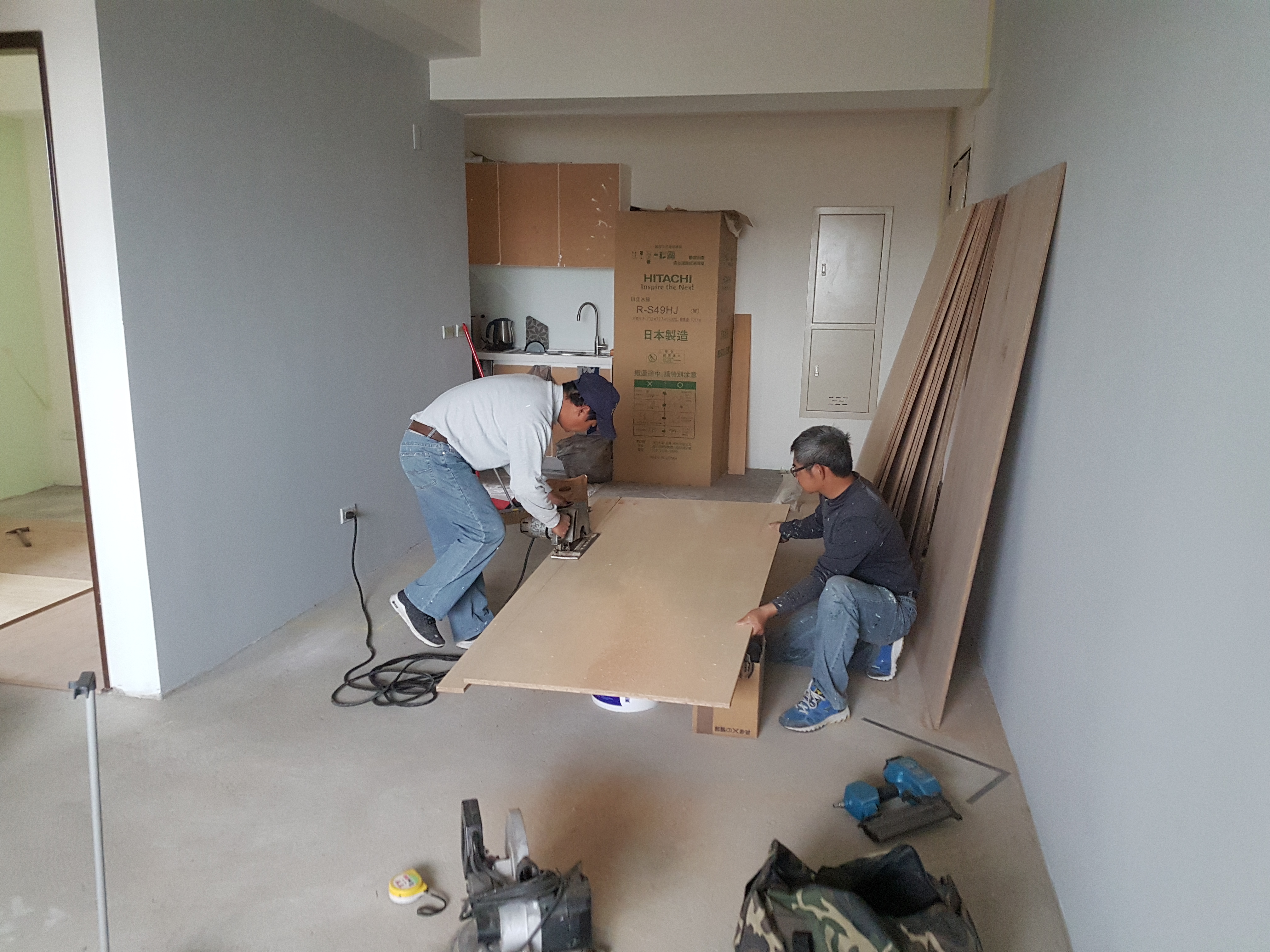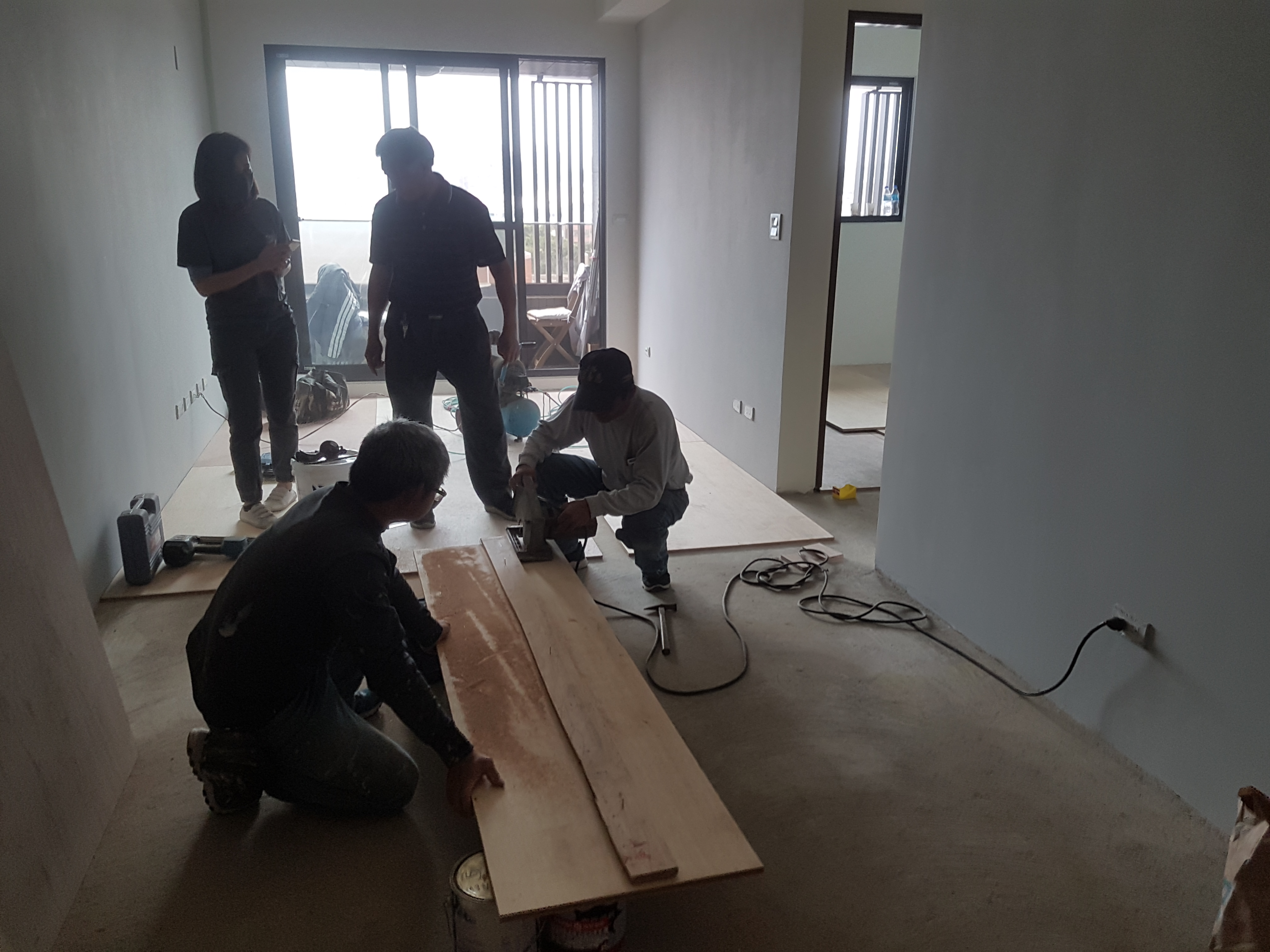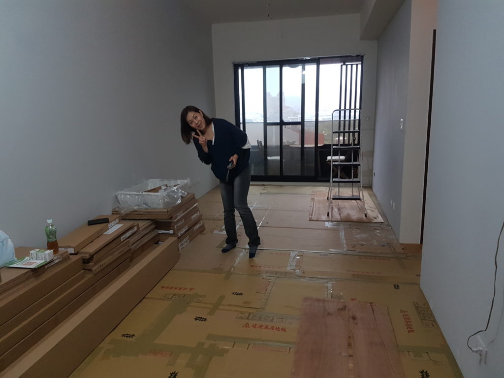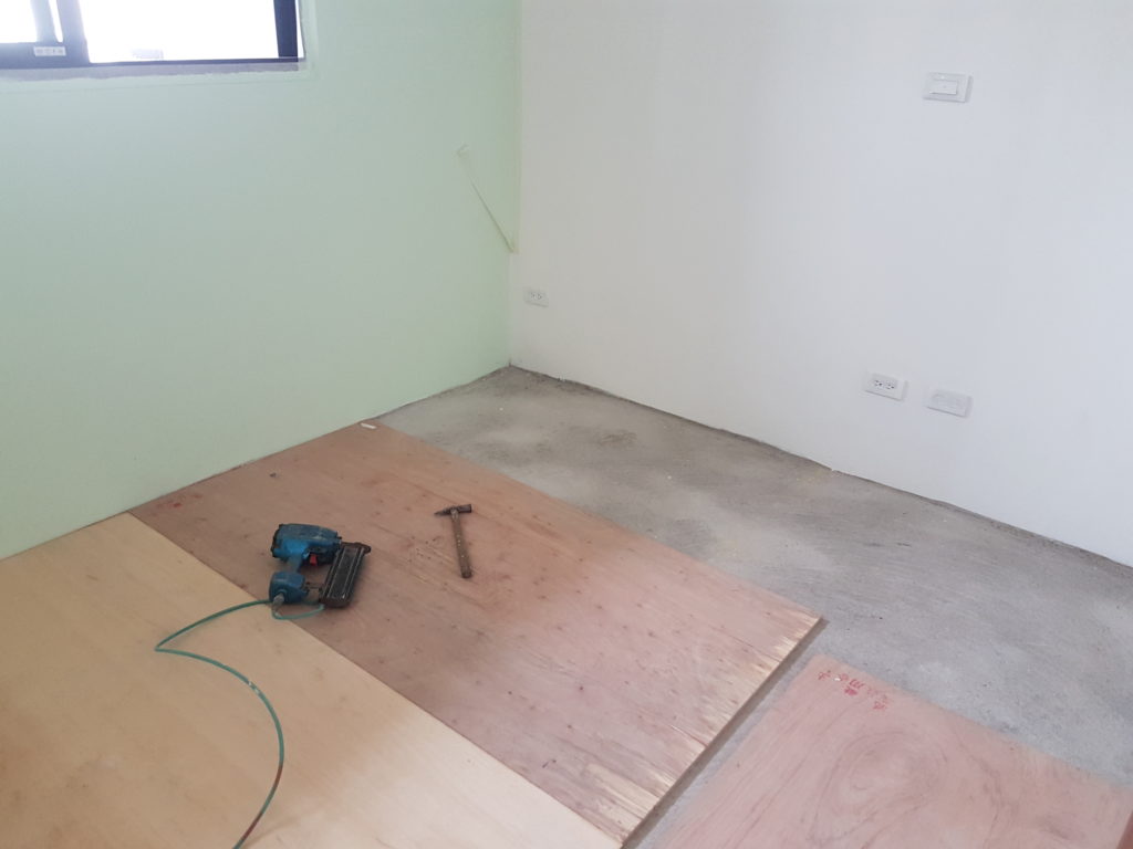 When the walls were painted my father inlaw, who owns a construction company, came with a small team to install the wooden floor for us. We helped as much as we could, carrying lumber, opening boxes and just keeping the place clean and tidy. We left the real work to the professionals though.