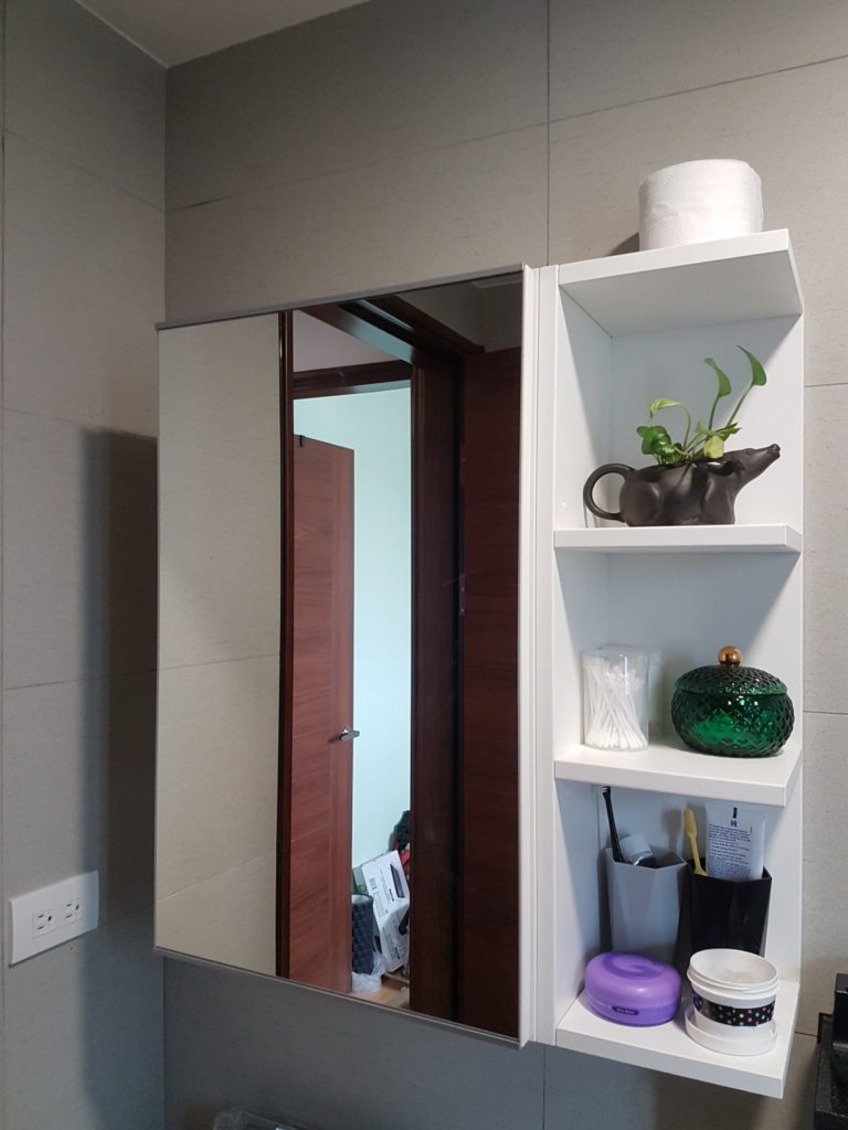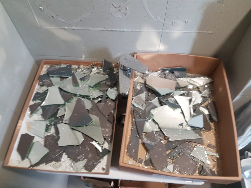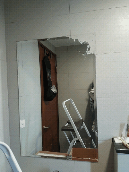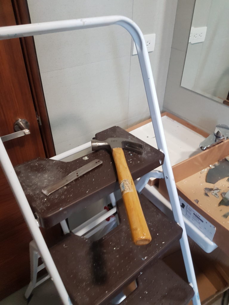 Another tricky part was the bathroom mirror. The construction company had installed a bathroom mirror but we wanted a cabinet so we decided to take it down. The trouble was that it had been glued to the wall with silicone. Try as I might I just couldn’t get it down in one piece. In the end Yini suggested stop trying to keep it intact and just take it down with a chisel and hammer. It worked but there was a lot of broken glass everywhere afterwards.