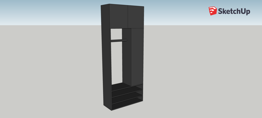 The solution? I sat down and designed a kind of shoe rack/wardrobe thing that would fit this space, in Sketchup. We then took my design to a company that produces custom furniture and they worked with us to create something according to my design. While we were there we also ordered a couple of other pieces of furniture as well.