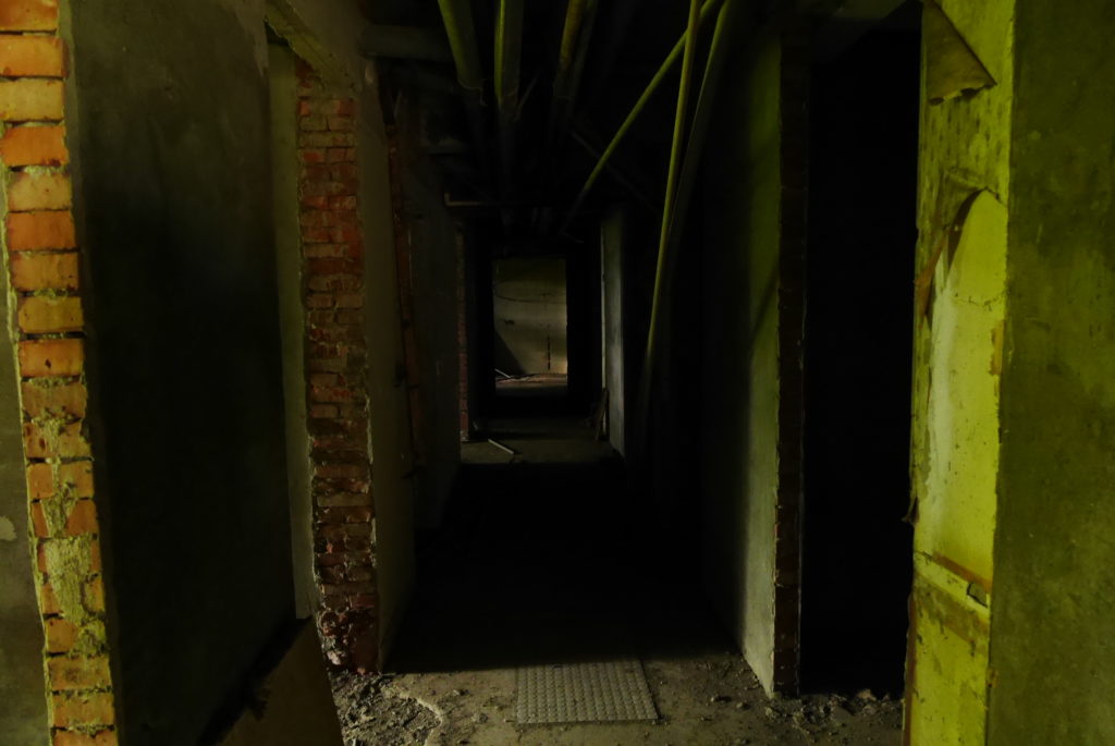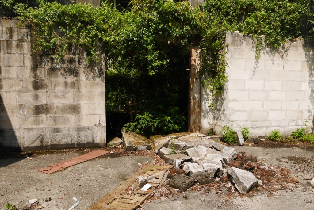 Right next to the entrance hall is something that used to be an open space, perhaps a parking lot, now full of holes where the concrete has collapsed.
