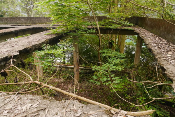 The most popular part of Shimen reservoir is the big damn at its western end with plenty of things to see in the nearby area. At the eastern end of the damn is a visitor center, a small park overlooking the reservoir and, as always in Taiwan, a small market. The abandoned hotel is just there, hiding in plain sight. Right next to the visitor center is a large statue of Chiang Kai Shek standing at the top of some stairs and if you look past him you can spot the roof of the hotel among the trees.