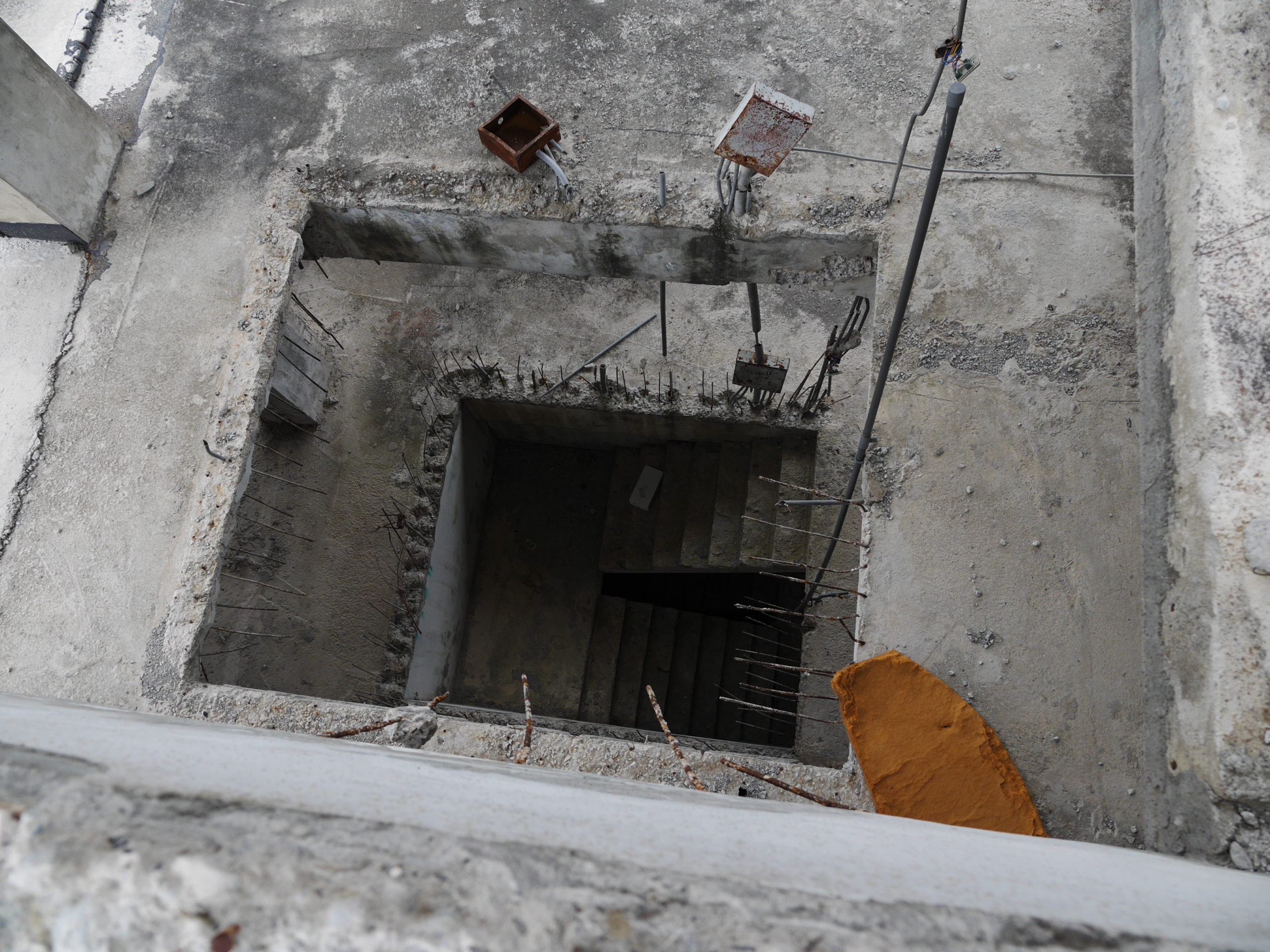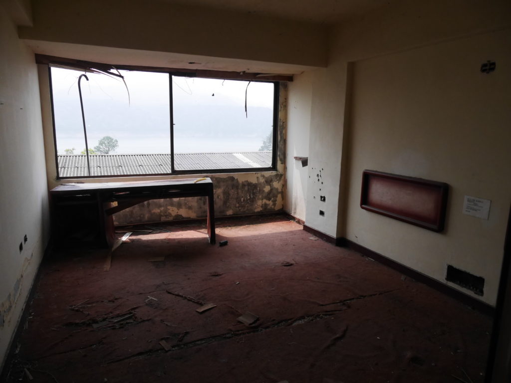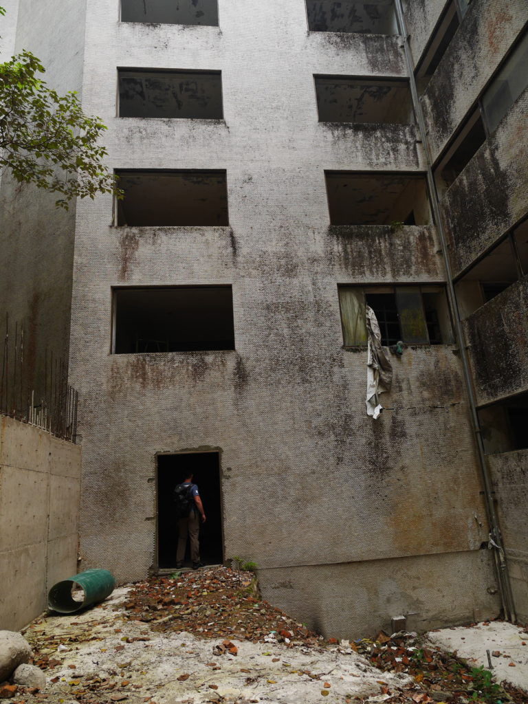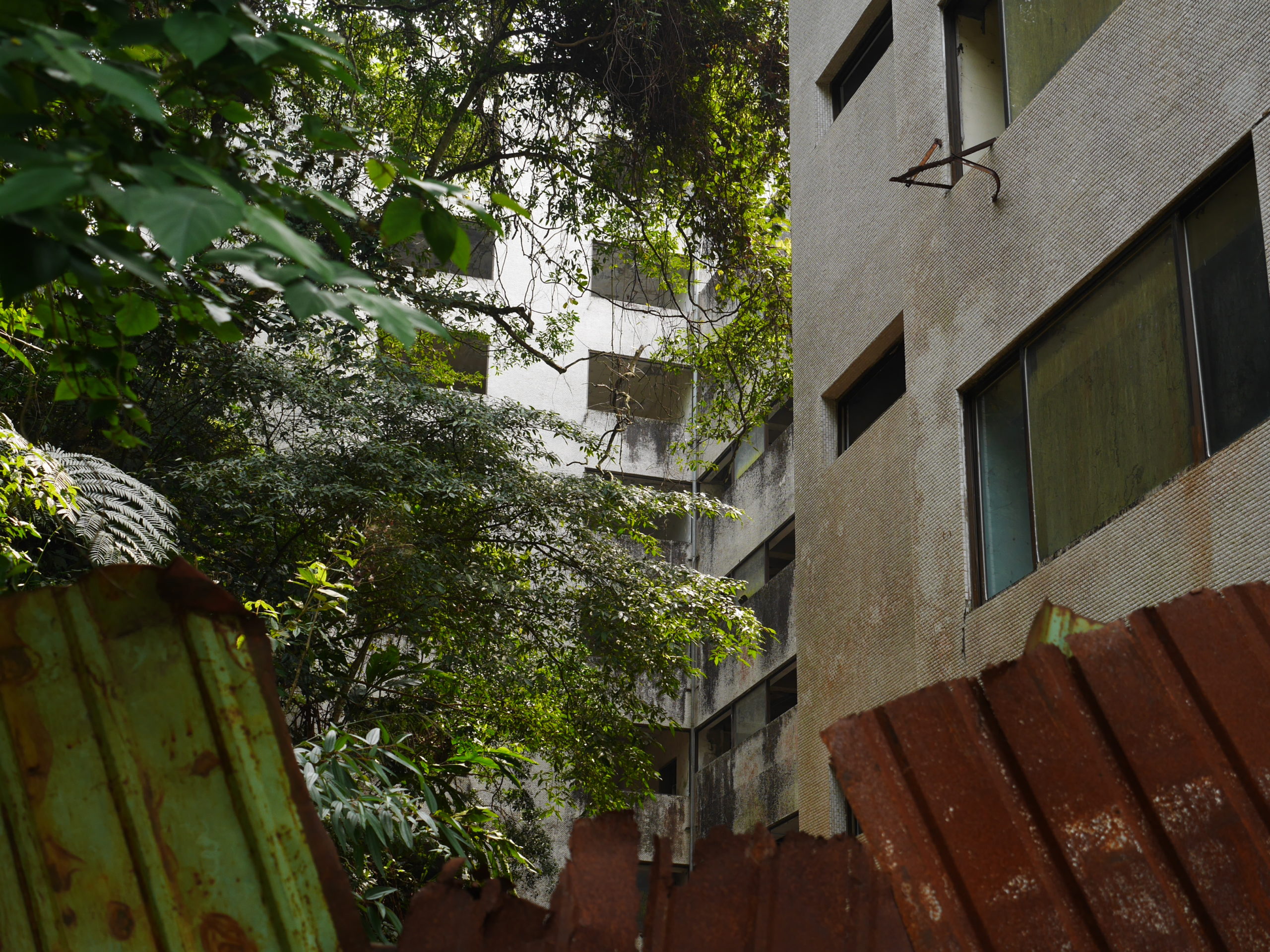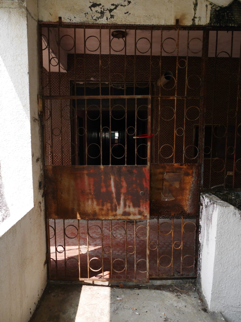 We started by exploring what we thought was part of the hotel but turned out to be a smaller separate building, possibly some kind of annex. It looked to be abandoned with the typical dark lifeless windows and walls covered in dirt and mold. A fence of corrugated iron running all around the ground floor blocked access, but to my surprise there was a gap in the fence at a staircase one the outside where we thought we could enter. However, at each landing there was a rusted metal gate, locked by a relatively new padlock. We did not want to break in, especially with the people working next door, so we had to make do with looking from the outside.