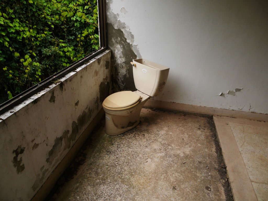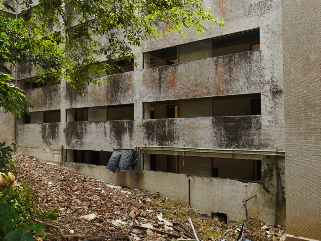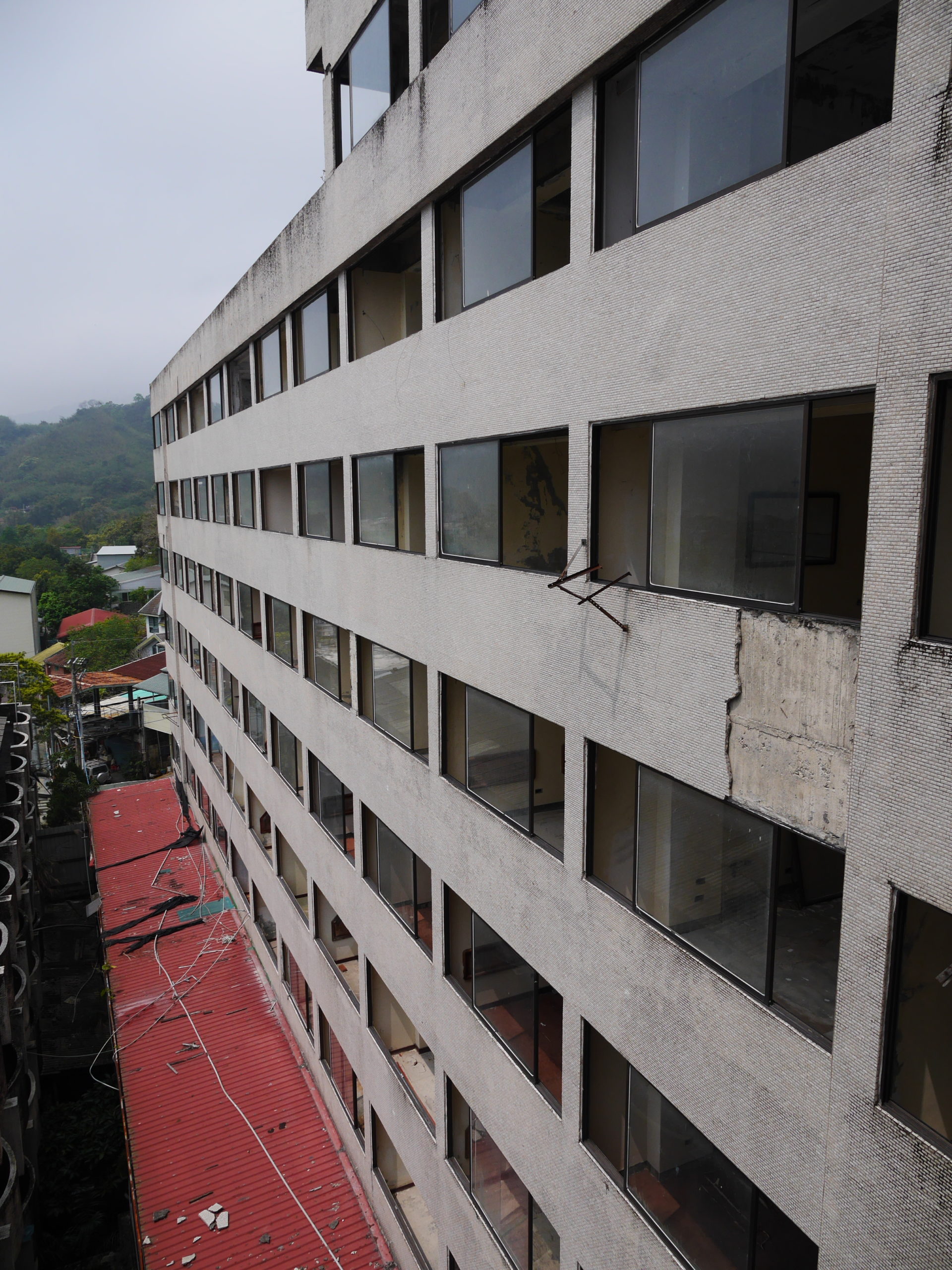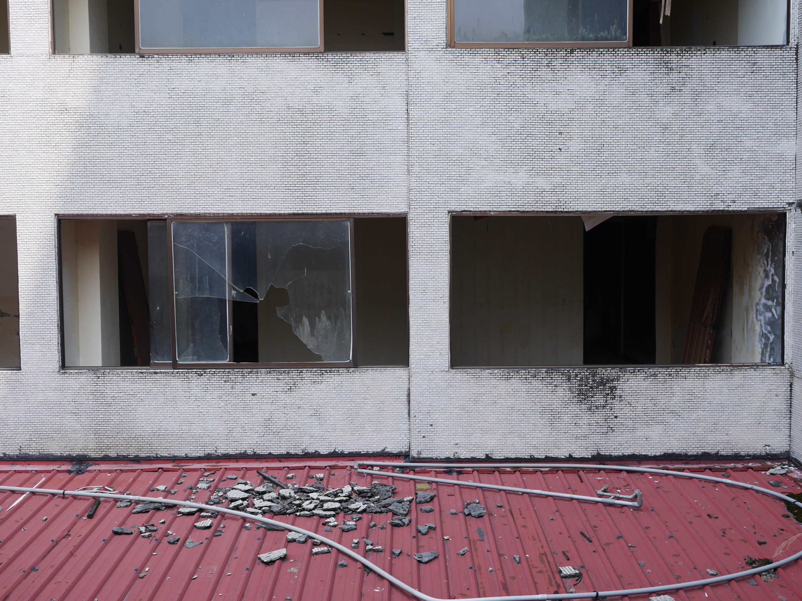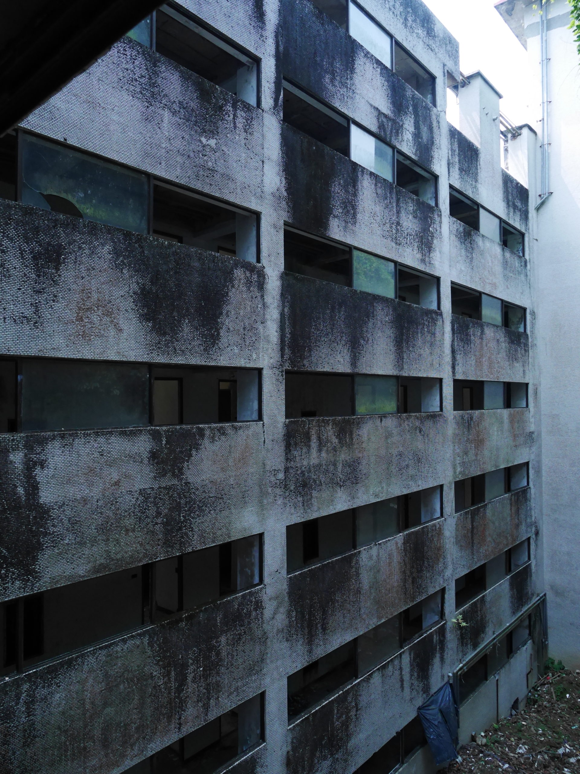 We started by exploring what we thought was part of the hotel but turned out to be a smaller separate building, possibly some kind of annex. It looked to be abandoned with the typical dark lifeless windows and walls covered in dirt and mold. A fence of corrugated iron running all around the ground floor blocked access, but to my surprise there was a gap in the fence at a staircase one the outside where we thought we could enter. However, at each landing there was a rusted metal gate, locked by a relatively new padlock. We did not want to break in, especially with the people working next door, so we had to make do with looking from the outside.