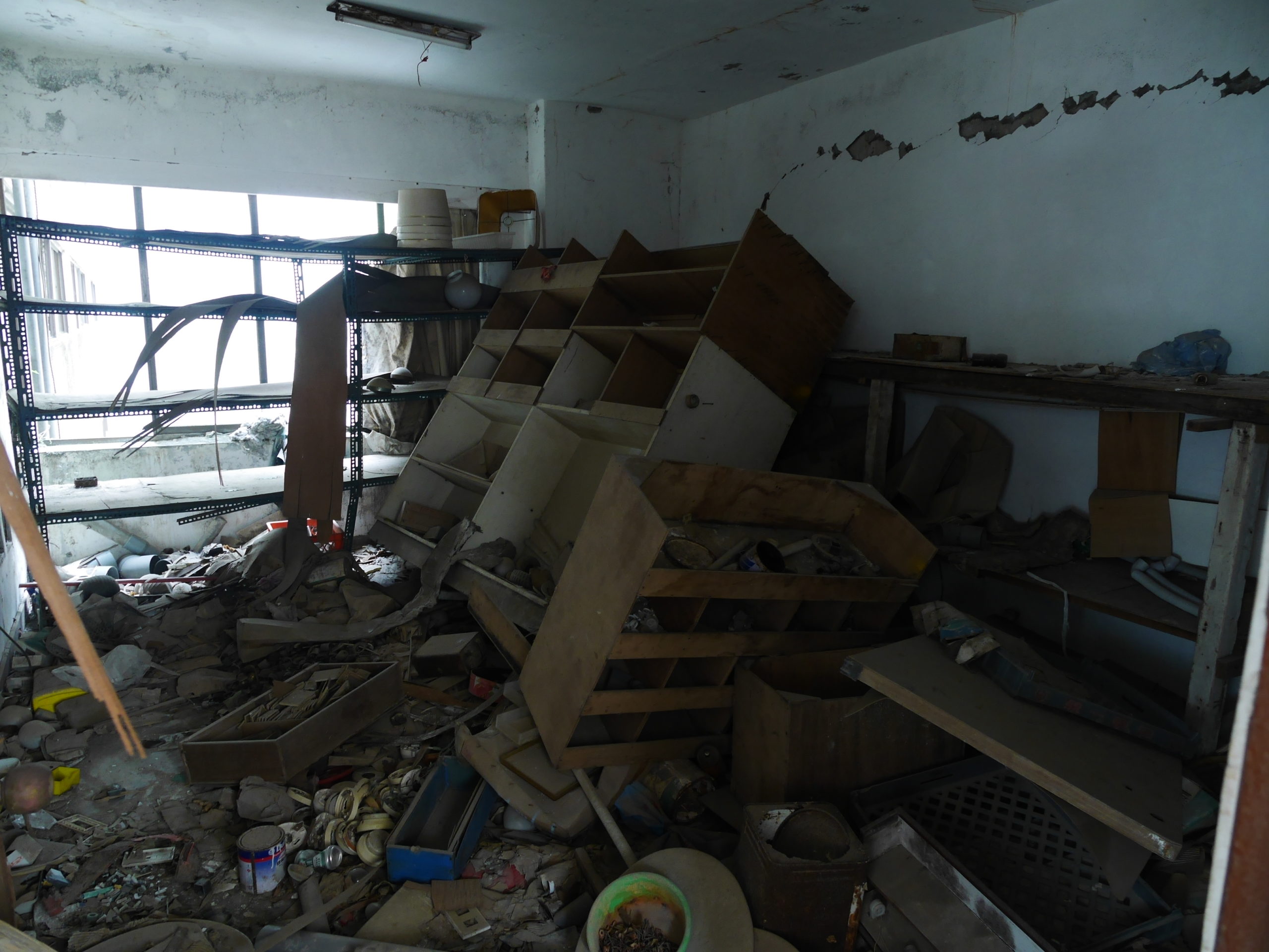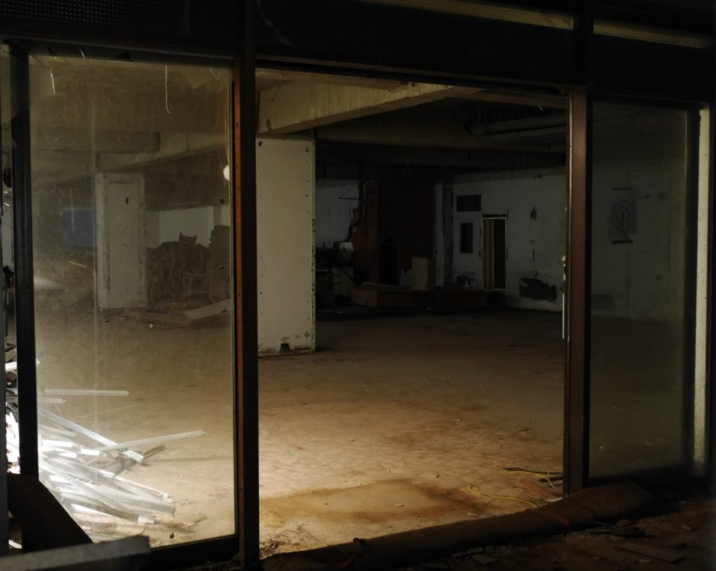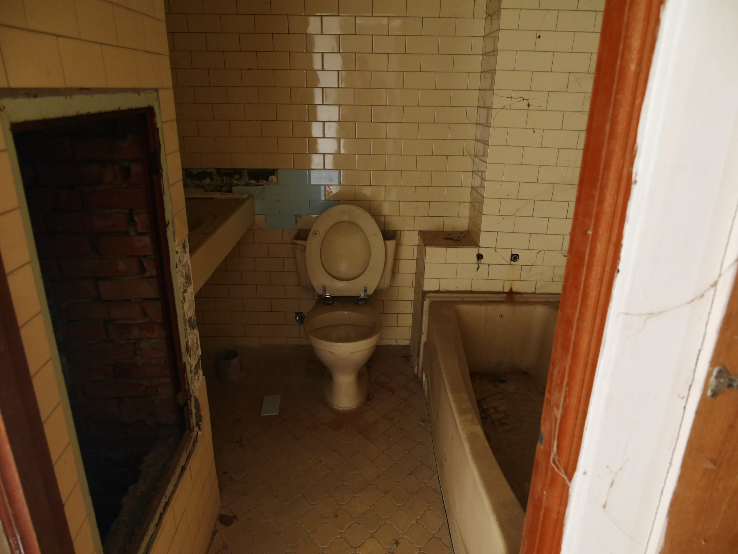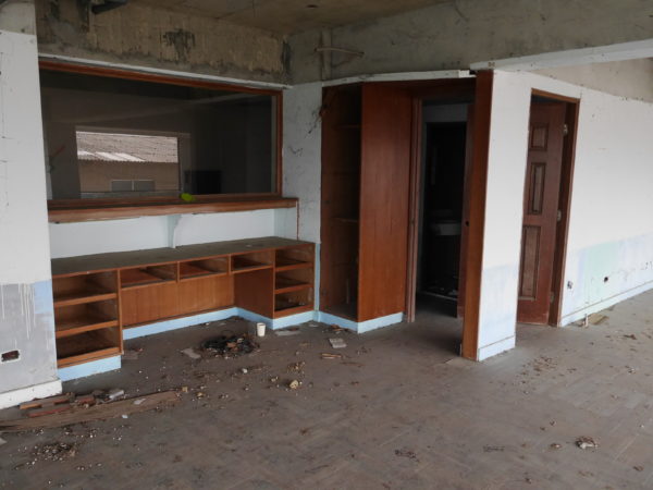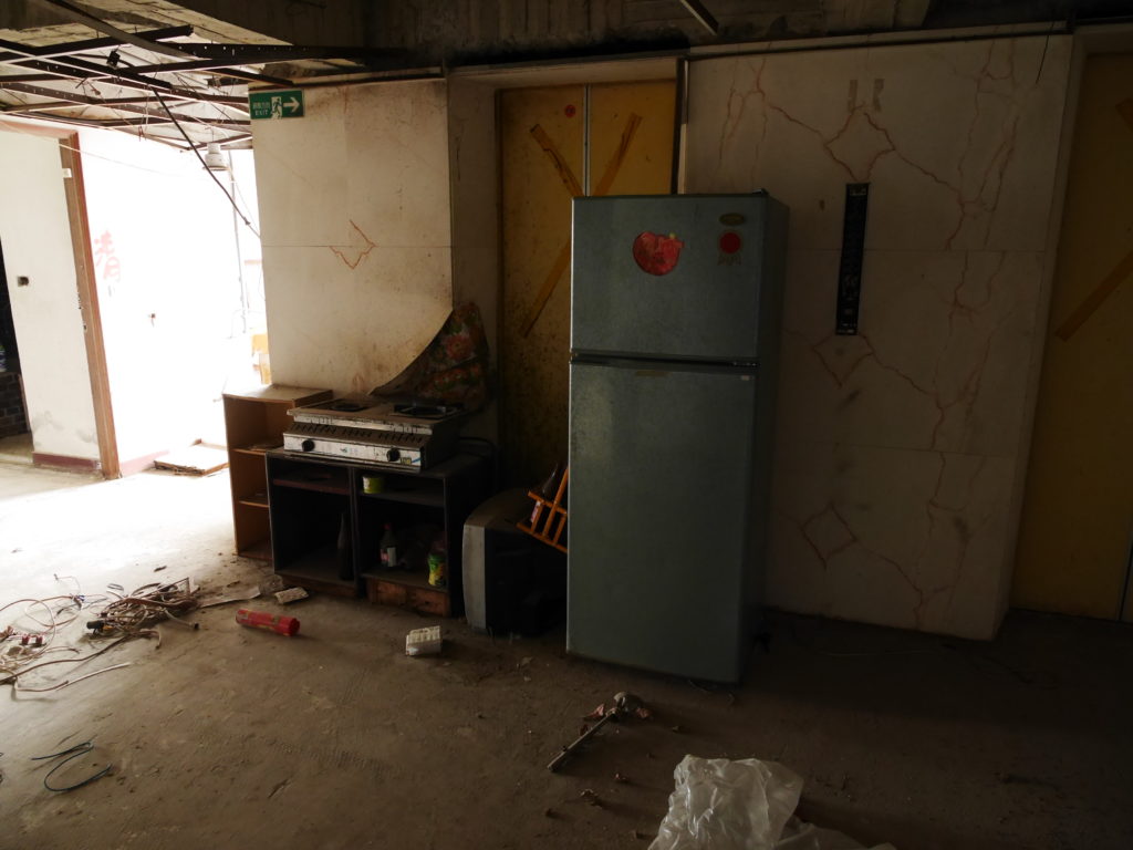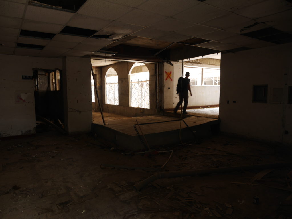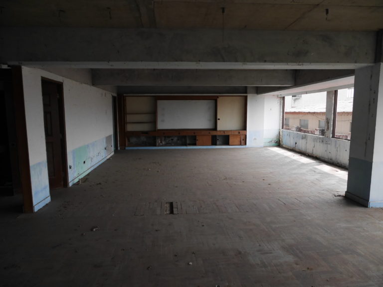 Since we couldn’t enter the ‘annex’ we tried the main building instead. It seems the main entrance is in the part of the building occupied by people, so that was out of the question. We found two side doors plus something that looked like a garage entrance, all three were shuttered. We kept searching until we came to a small backyard full of broken bricks and other construction debris where we could see an empty door opening. Unfortunately, the entrance to the backyard is blocked off by another corrugated iron fence. The fence is in pretty bad shape so we started checking for gaps big enough to get through but couldn’t find anything. Once again it looked like we would be limited to seeing the place from the outside.