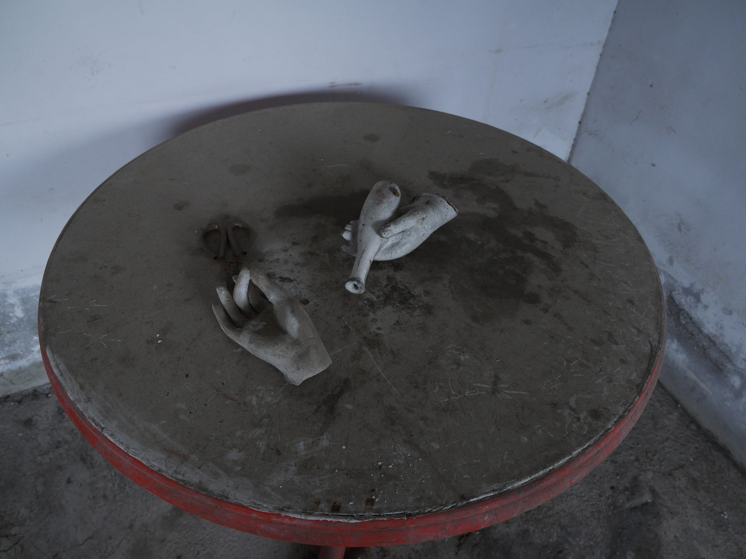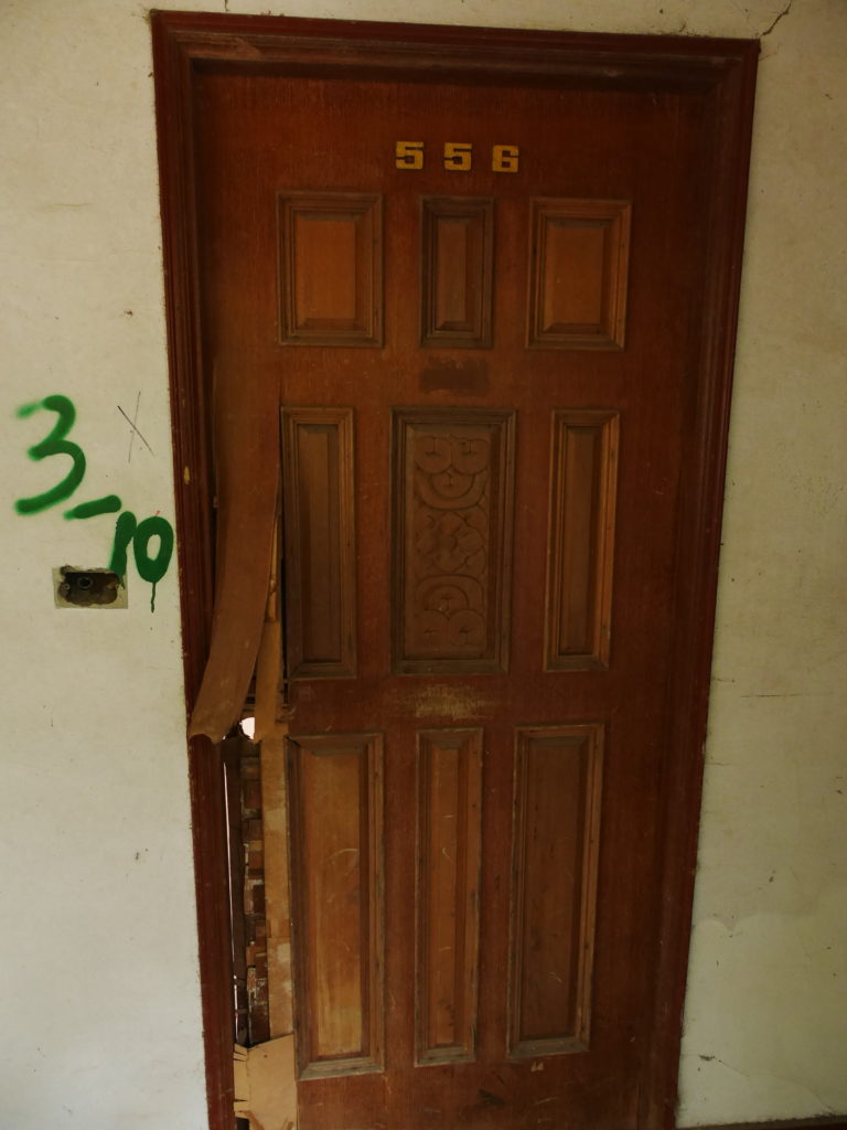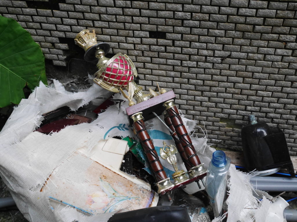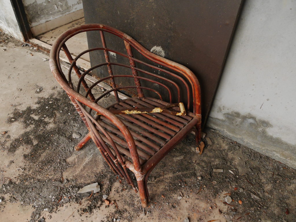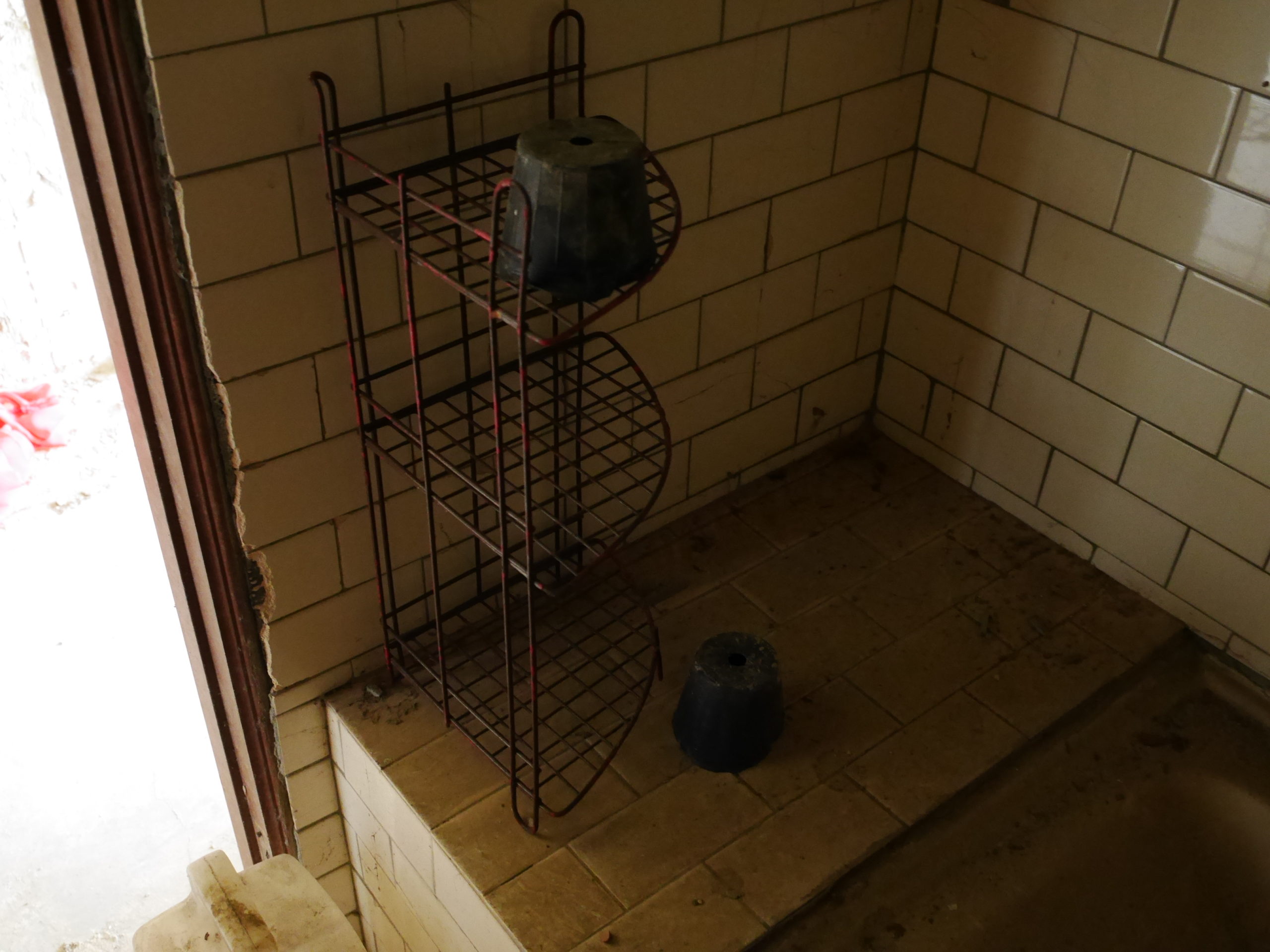 Since we couldn’t enter the ‘annex’ we tried the main building instead. It seems the main entrance is in the part of the building occupied by people, so that was out of the question. We found two side doors plus something that looked like a garage entrance, all three were shuttered. We kept searching until we came to a small backyard full of broken bricks and other construction debris where we could see an empty door opening. Unfortunately, the entrance to the backyard is blocked off by another corrugated iron fence. The fence is in pretty bad shape so we started checking for gaps big enough to get through but couldn’t find anything. Once again it looked like we would be limited to seeing the place from the outside.
