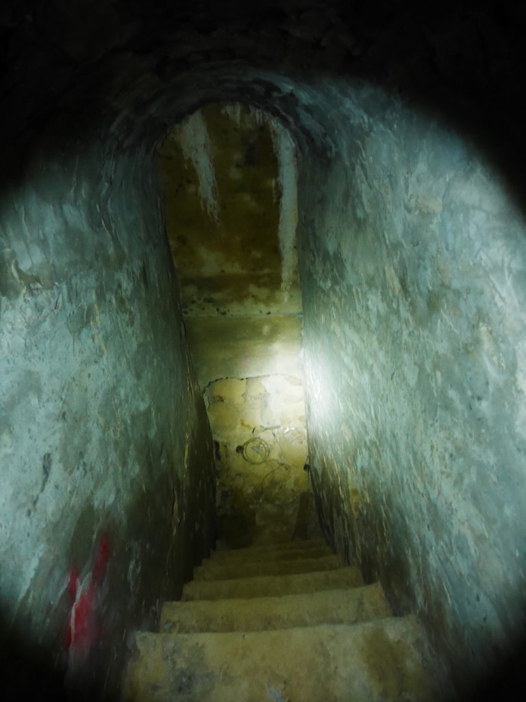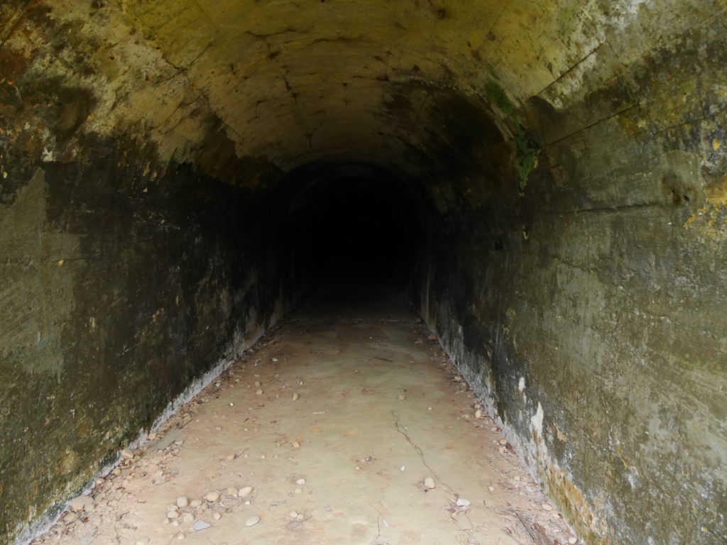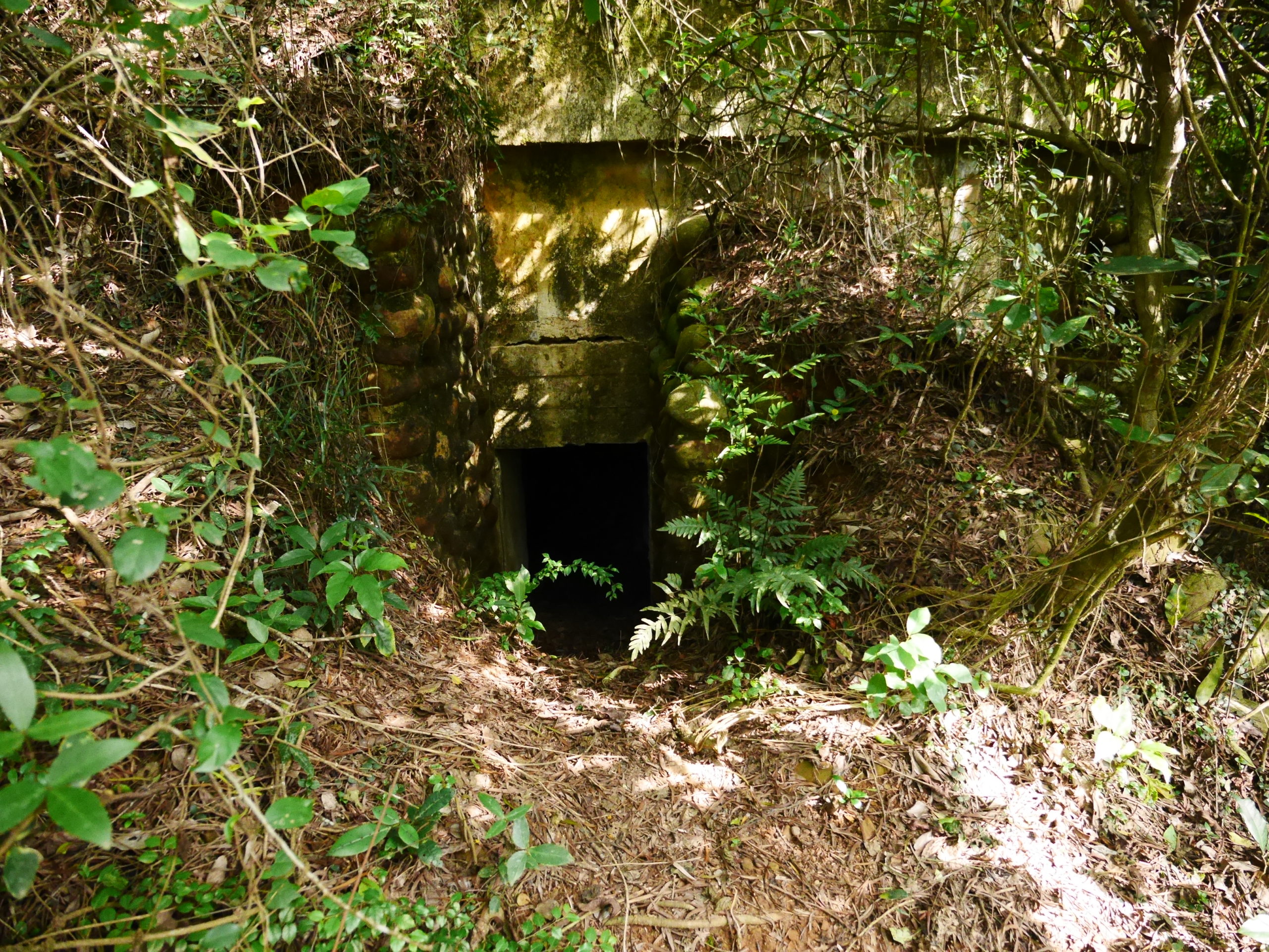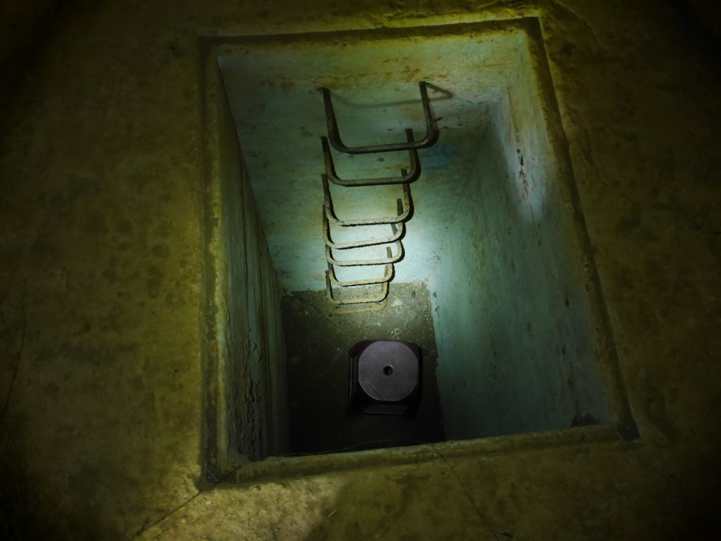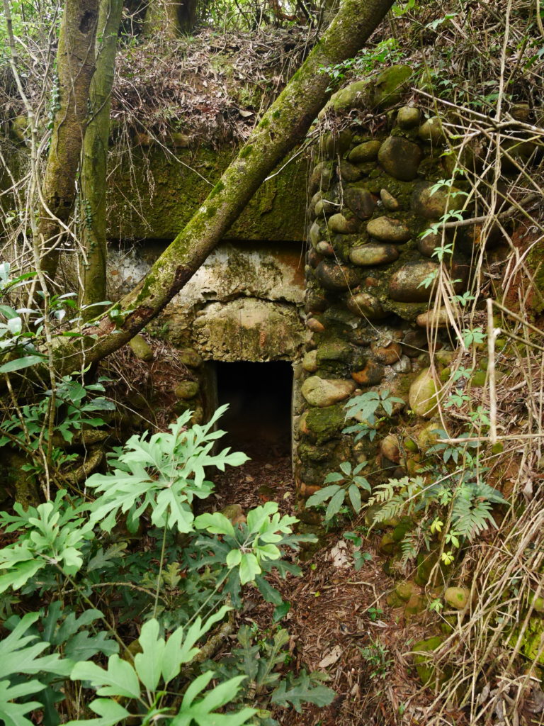When you reach the cafe turn right and go up the stairs, following the signs towards 蓮花寺. After a climbing for a short distance you should see a large fallen tree by the side of the trail. Just around the corner from the tree, the trail passes by an overgrown bunker, this is the first entrance. You will need to get down on your hands and knees to be able to get in. Inside there is a hole in the center of the room with a ladder on one side, go down this ladder and you are in the tunnels. Quick note before I continue, there’s no light down there, bring a good flashlight and extra batteries, do Not rely on the flashlight function of your phone.