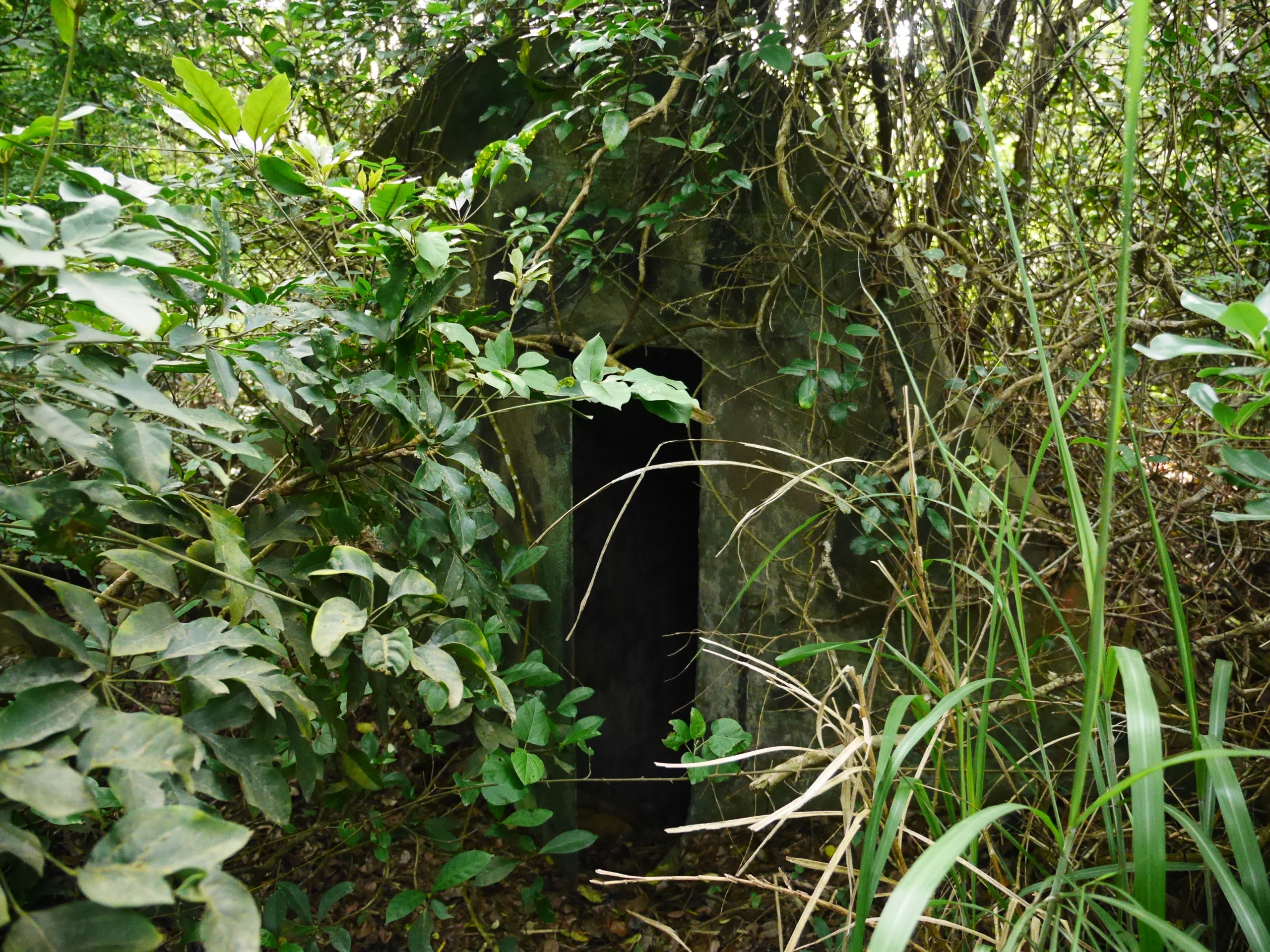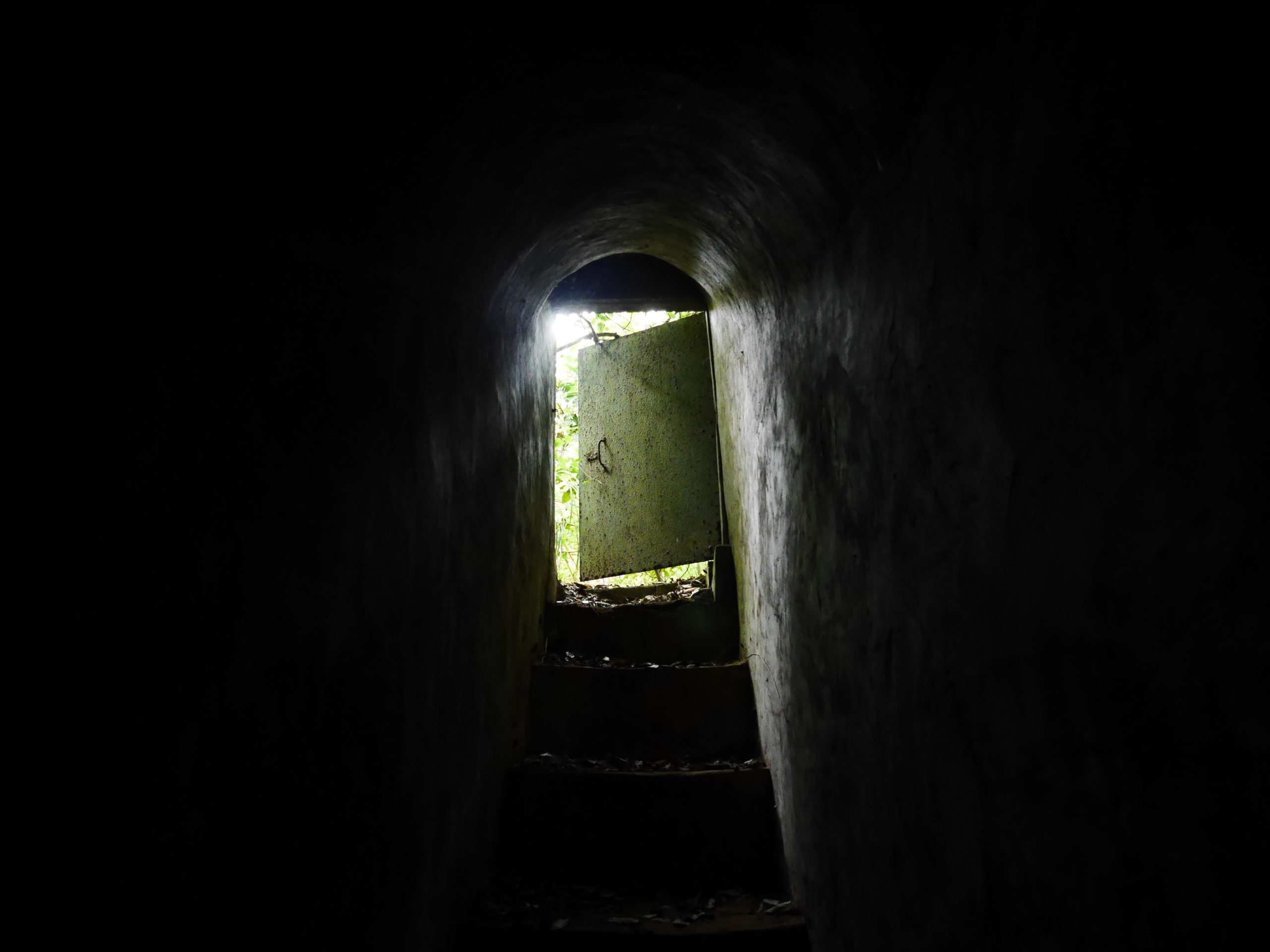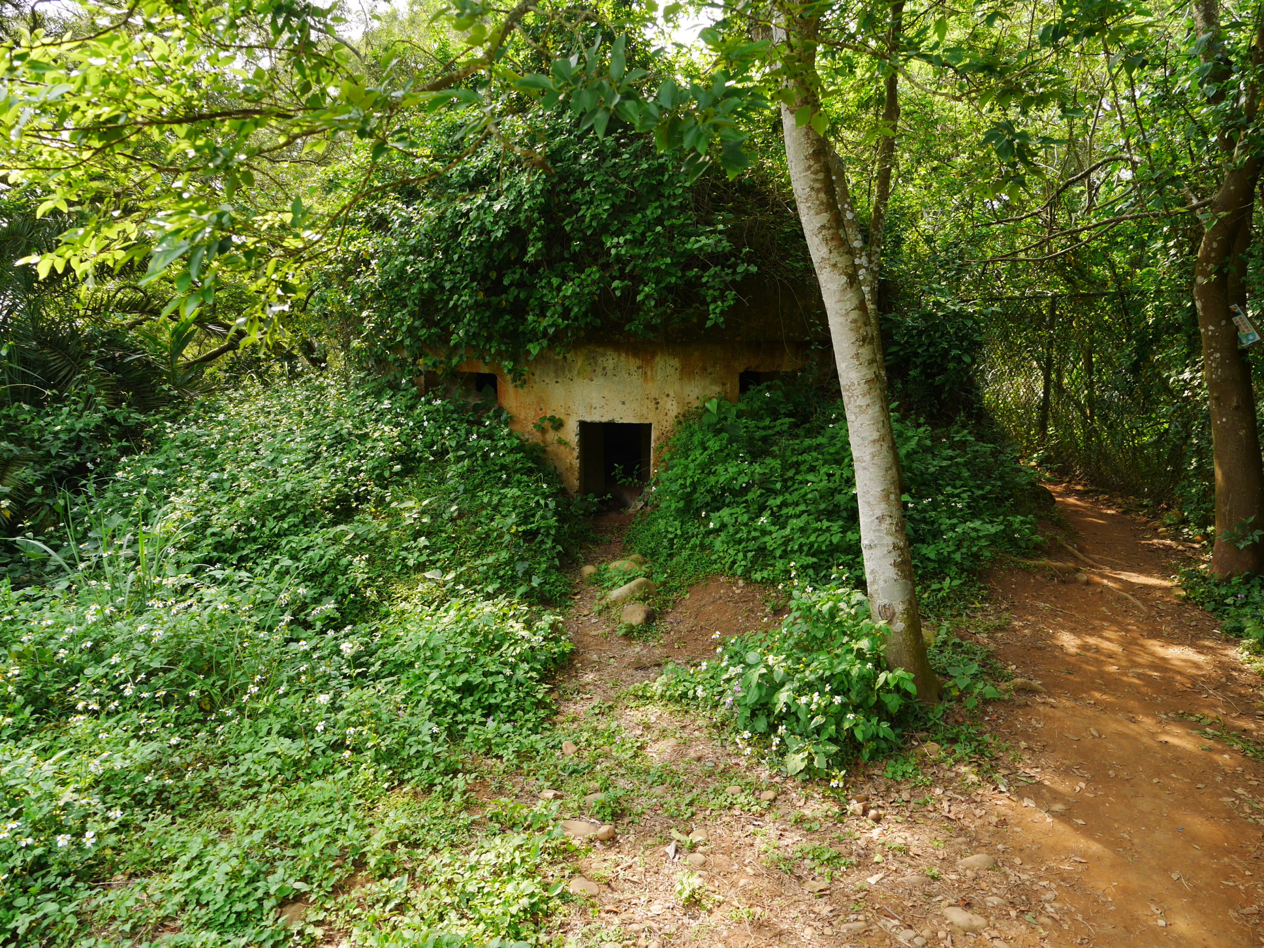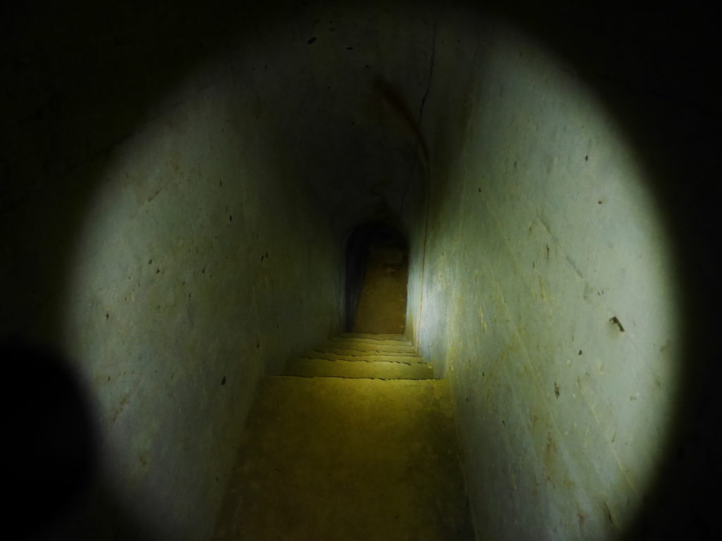When you reach the cafe turn right and go up the stairs, following the signs towards 蓮花寺. After a climbing for a short distance you should see a large fallen tree by the side of the trail. Just around the corner from the tree, the trail passes by an overgrown bunker, this is the first entrance. You will need to get down on your hands and knees to be able to get in. Inside there is a hole in the center of the room with a ladder on one side, go down this ladder and you are in the tunnels. Quick note before I continue, there’s no light down there, bring a good flashlight and extra batteries, do Not rely on the flashlight function of your phone.