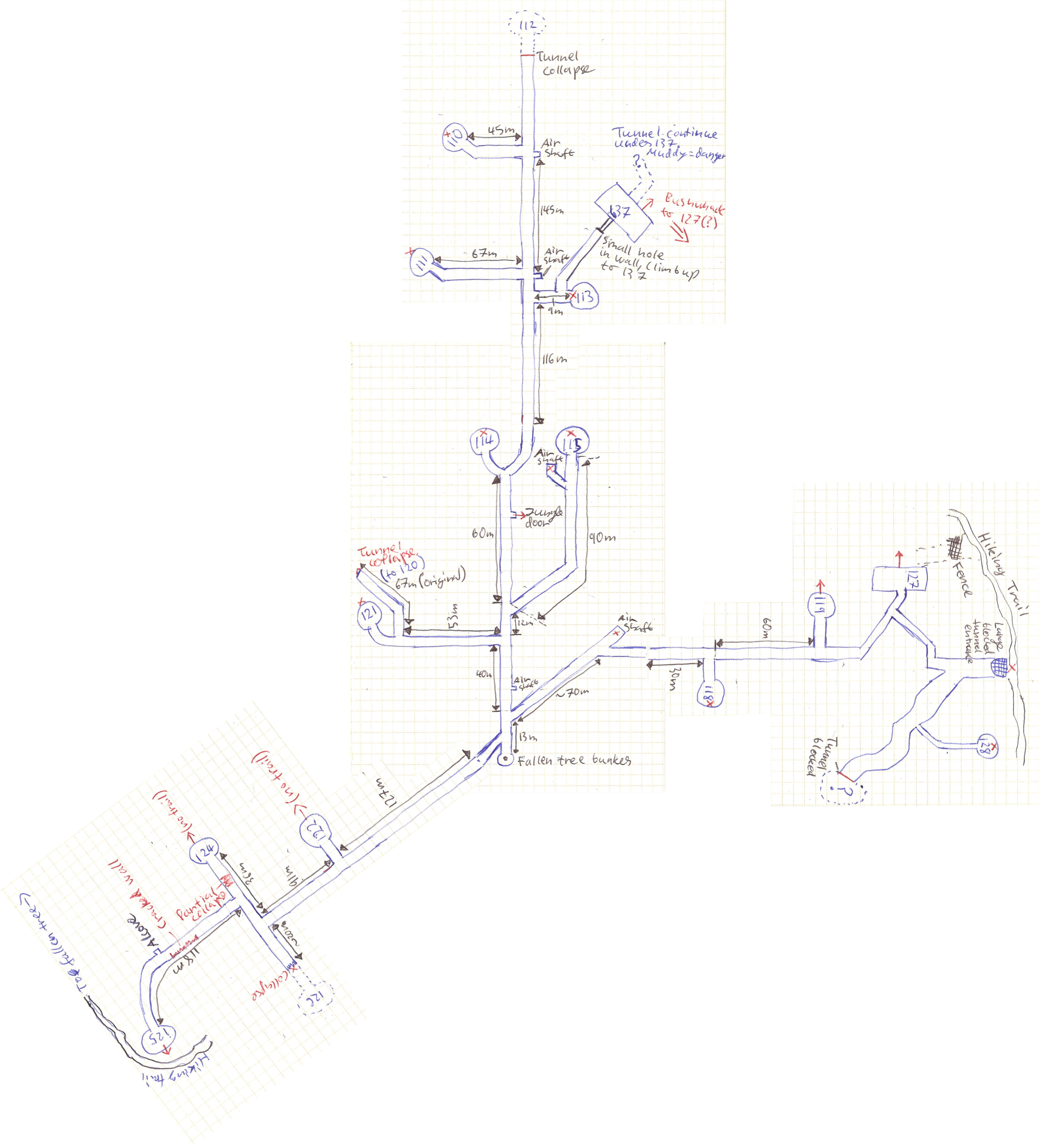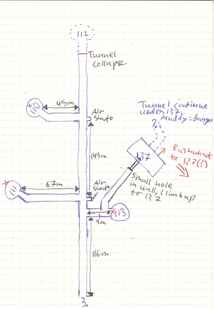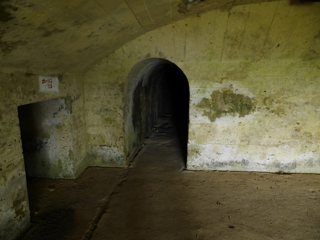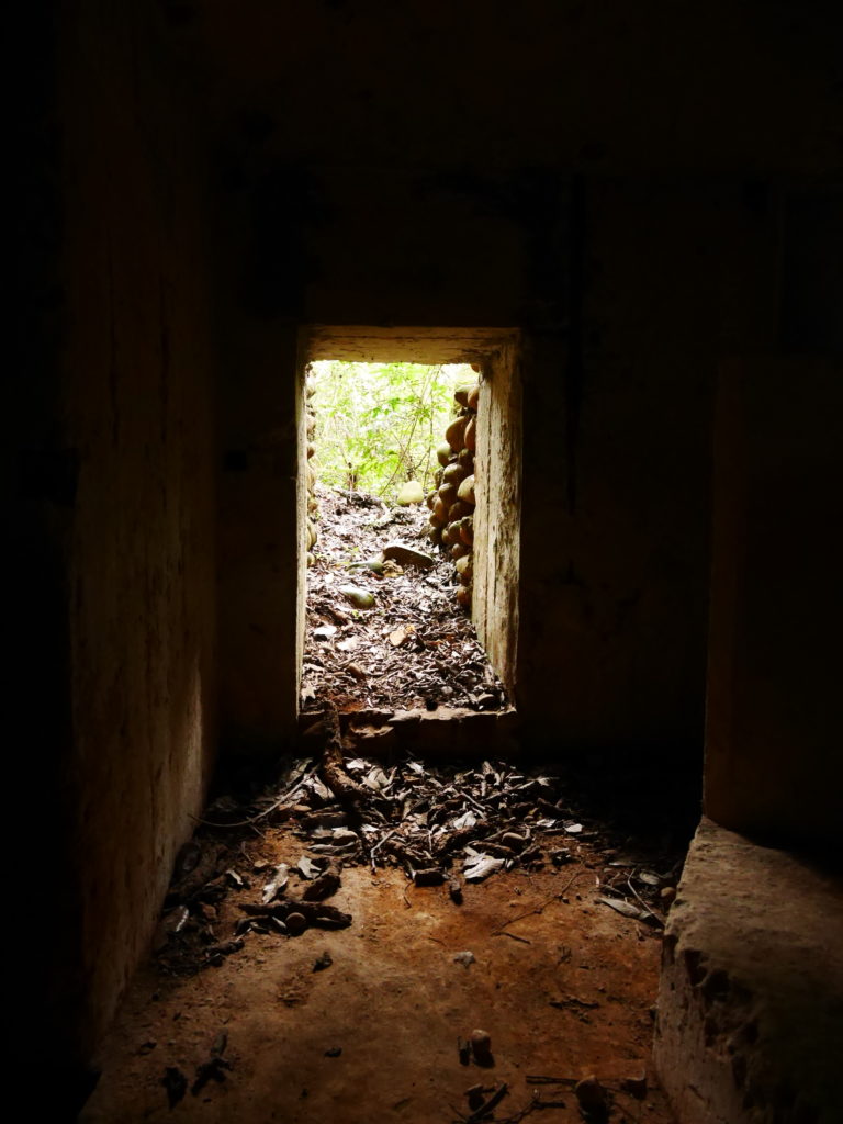Before you say anything, I want to apologize for my poor handwriting, I hope you can read it. Note that all the bunkers have a number which you will find stenciled on the bunker wall and sometimes also in the tunnel leading to it. I’ve added a bunch of photos below and as far as possible I have added this bunker number as a reference so you can know where it was taken. I also added a few close ups of different map sections for reference. You will see some distances in the map, when possible I’ve copied these from distance markers on the walls, but sometimes they are just my estimate. When a bunker is marked with a red X it means it is blocked in some way or another. Conversely, when it is marked with a red arrow it means there is a way out of the tunnels at this point. Note that while it’s possible to get out of the tunnels, several of the exits just lead out into the jungle and you’d have to bushwhack a bit to get back to the trail. Finally one more note: several parts have collapsed over the years, meaning that the state of the tunnels might change in the future due to earthquakes or landslides. Keep that in mind when using my map, I cannot guarantee that it is still valid.