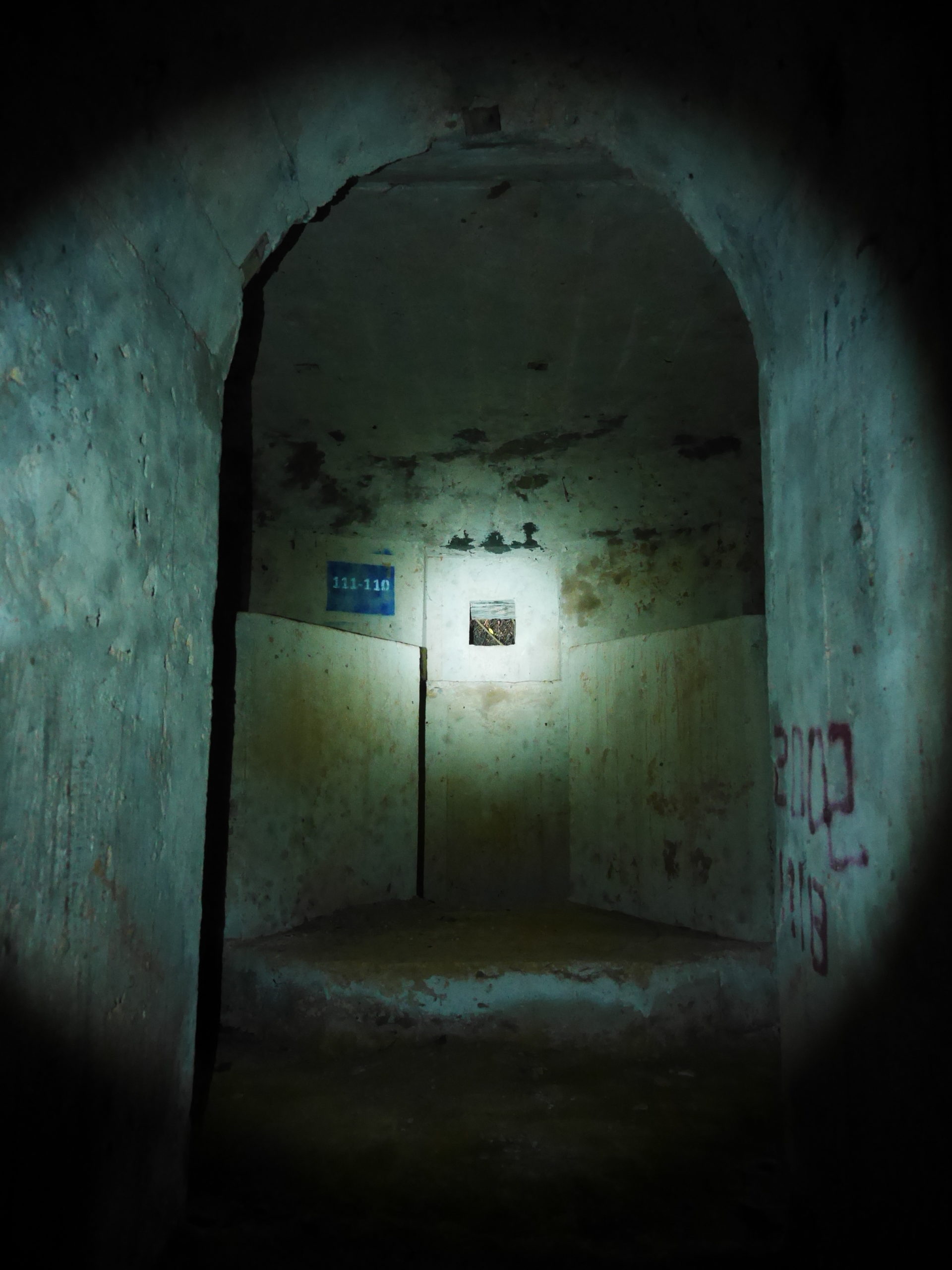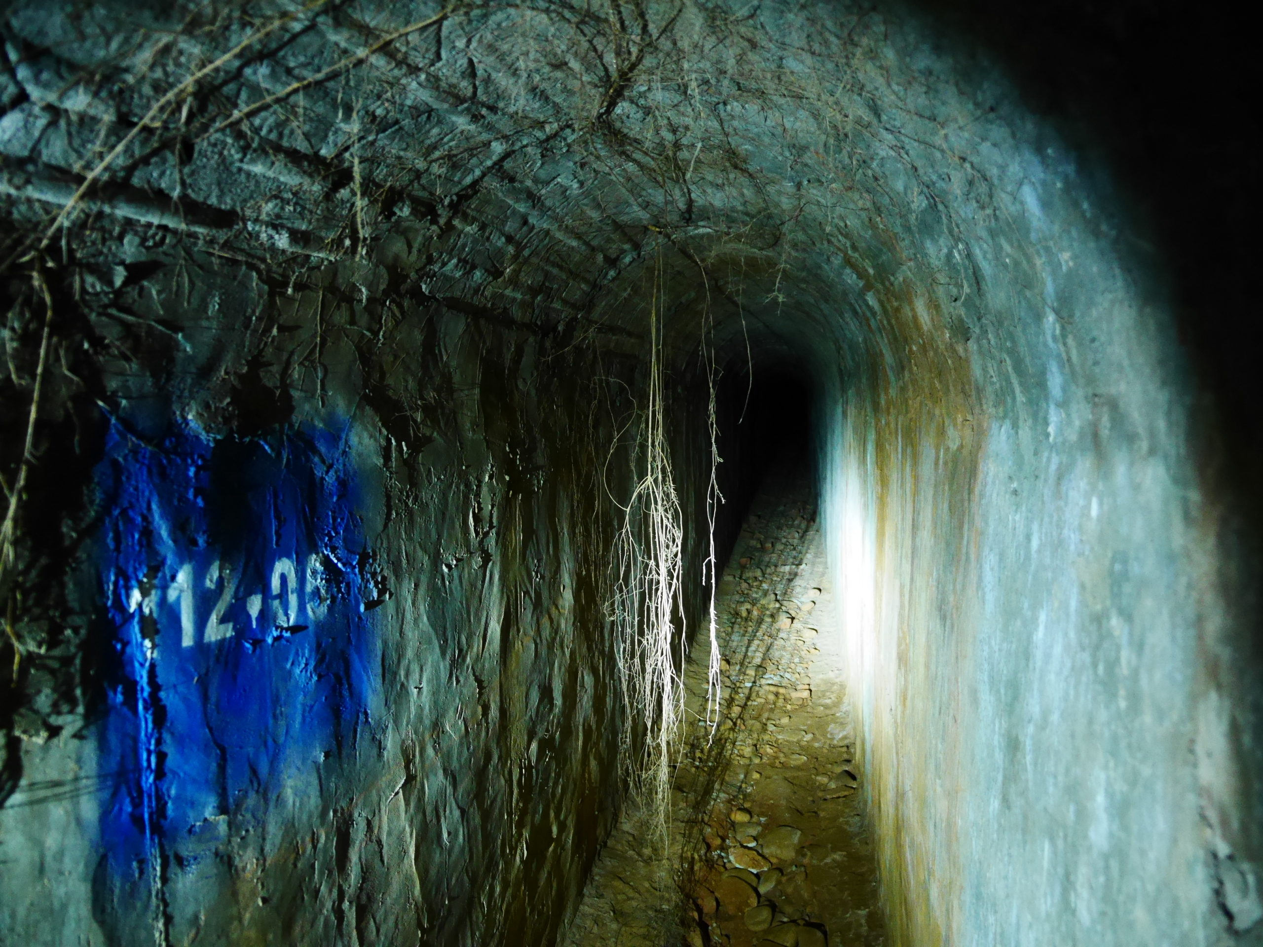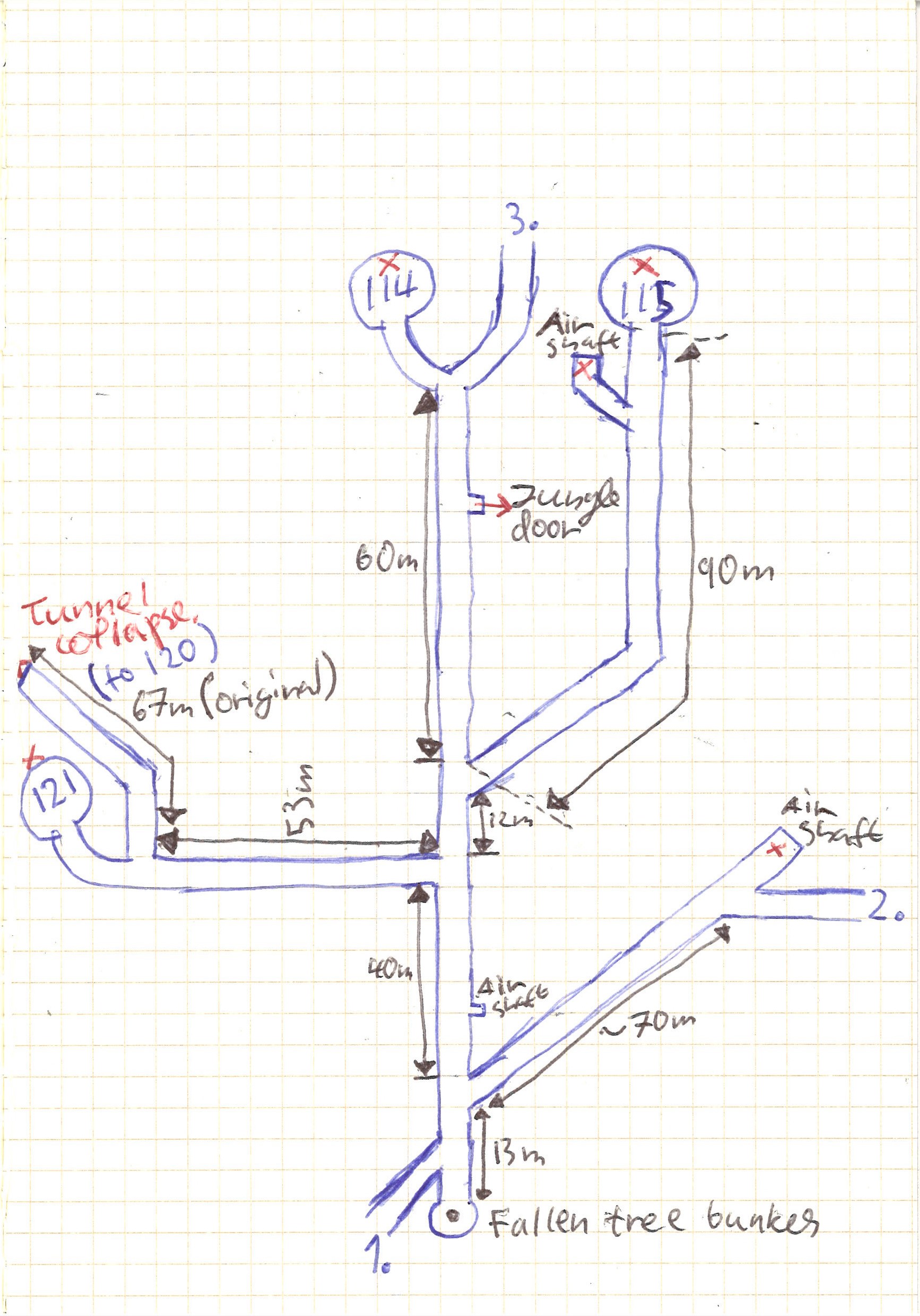 Before you say anything, I want to apologize for my poor handwriting, I hope you can read it. Note that all the bunkers have a number which you will find stenciled on the bunker wall and sometimes also in the tunnel leading to it. I’ve added a bunch of photos below and as far as possible I have added this bunker number as a reference so you can know where it was taken. I also added a few close ups of different map sections for reference. You will see some distances in the map, when possible I’ve copied these from distance markers on the walls, but sometimes they are just my estimate. When a bunker is marked with a red X it means it is blocked in some way or another. Conversely, when it is marked with a red arrow it means there is a way out of the tunnels at this point. Note that while it’s possible to get out of the tunnels, several of the exits just lead out into the jungle and you’d have to bushwhack a bit to get back to the trail. Finally one more note: several parts have collapsed over the years, meaning that the state of the tunnels might change in the future due to earthquakes or landslides. Keep that in mind when using my map, I cannot guarantee that it is still valid.
