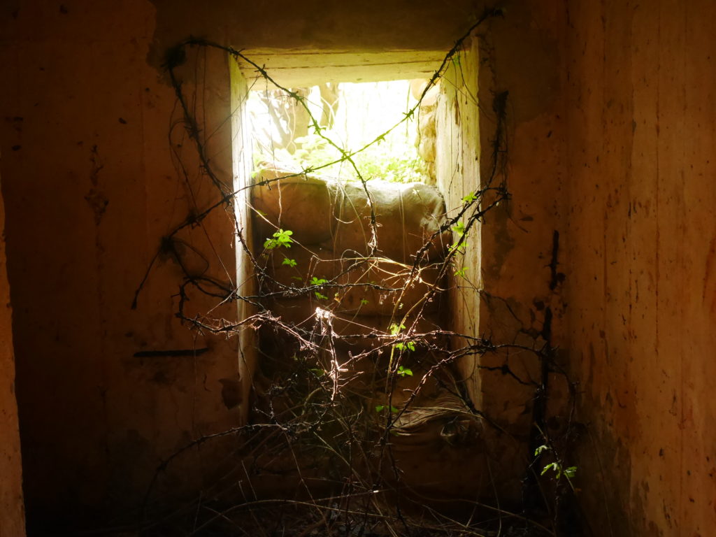 Just around the corner from bunker 113 there’s a short path that seems to just end at a wall. Upon further inspection I found a small hole in the wall leading into another part of the system. Crawling through I found that the tunnel drops down about a meter and continues around the a corner. There was also a square opening above my head, leading up to a room above. I considered going on but quickly noted that the tunnel ahead looked extremely muddy. Previous experience has told me that this could be very slippery, to the point where it might be difficult to get back up if you go sliding down it. I decided it was too dangerous to explore further without a friend to help as well as a length of rope. I strongly advise you stay clear of this part unless you know what you’re doing. I did however climb up through the opening in the ceiling to discover bunker 137. This is a big bunker of the same type as number 127 and it looks like there used to be a path between them but it’s now overgrown.