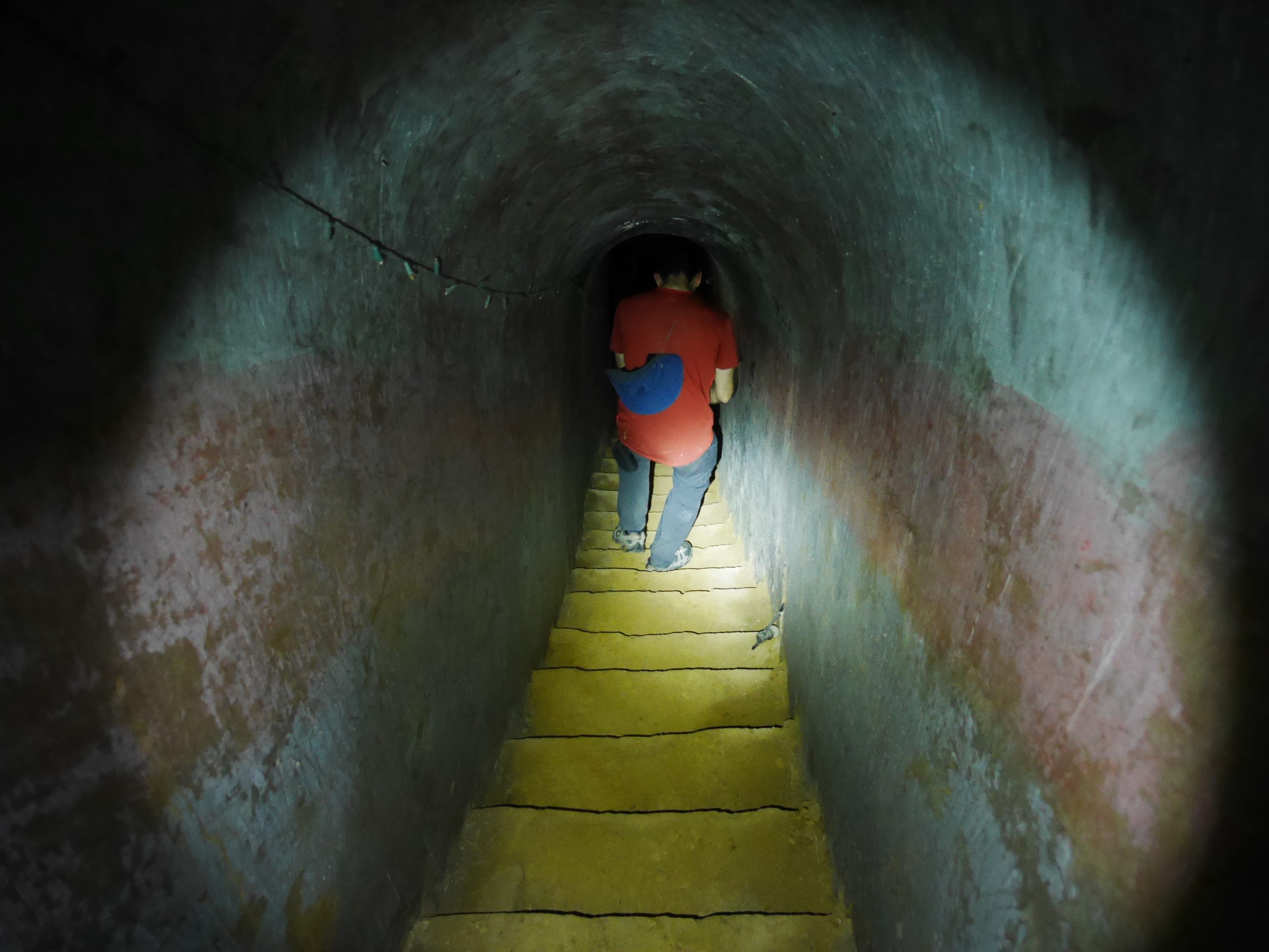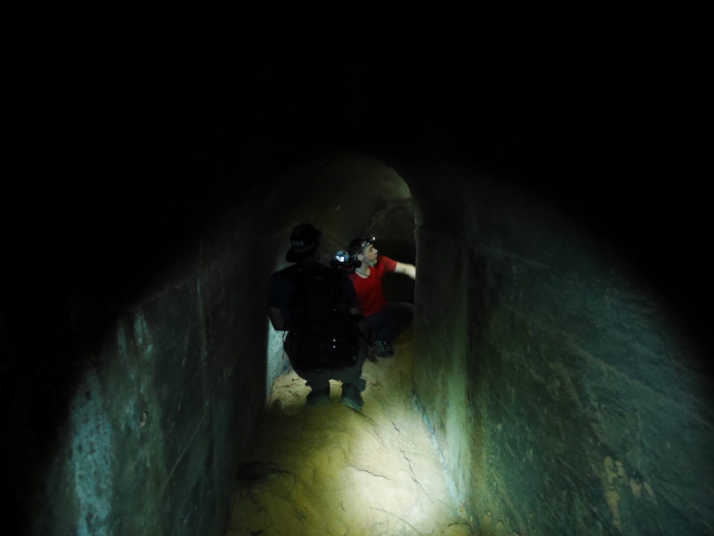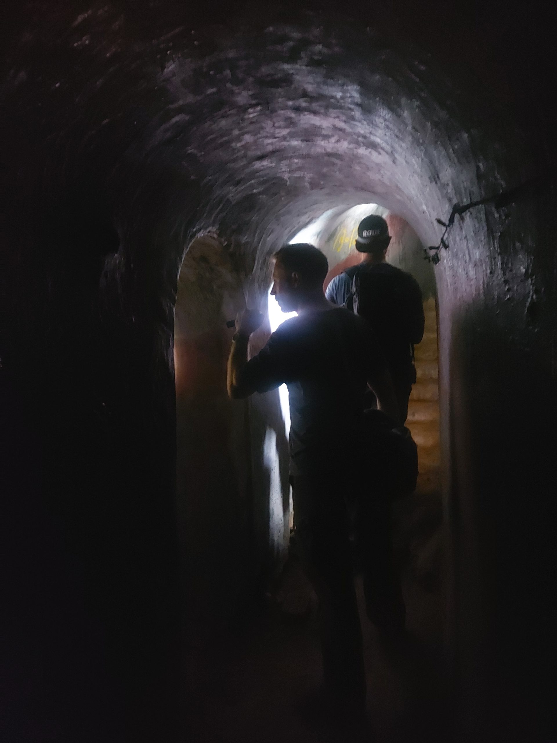 The other small tunnel leads down a steep set of stairs, past a small storage room, then up another set of stairs. As we were going down we started hearing loud voices. It sounded as if people were having a party in some room at the other end of the tunnel. Not wanting to get caught we snuck up and peaked in. There wasn’t any party that we could see but we realized we must have reached the backdoor of one of the cafes. We know that the cafe owners organize tours of the tunnels, our guess is that they bring people in this way.
