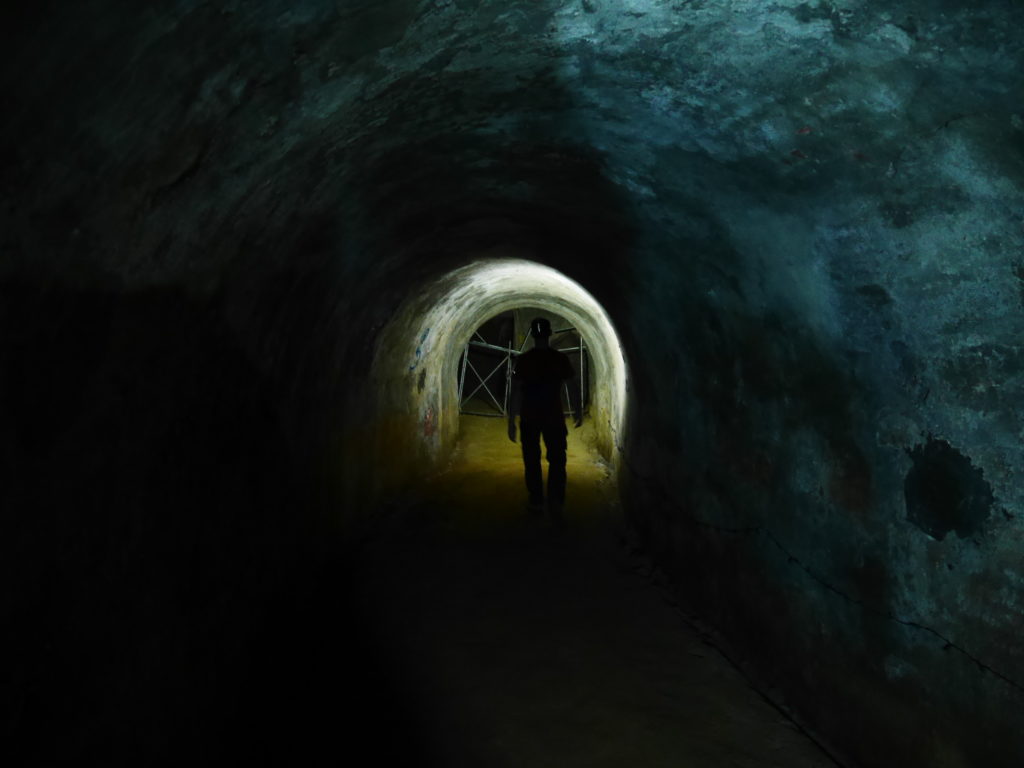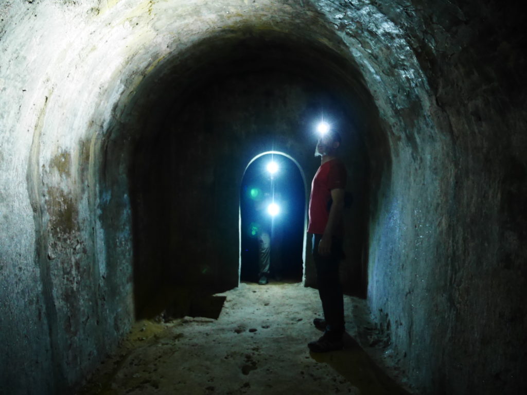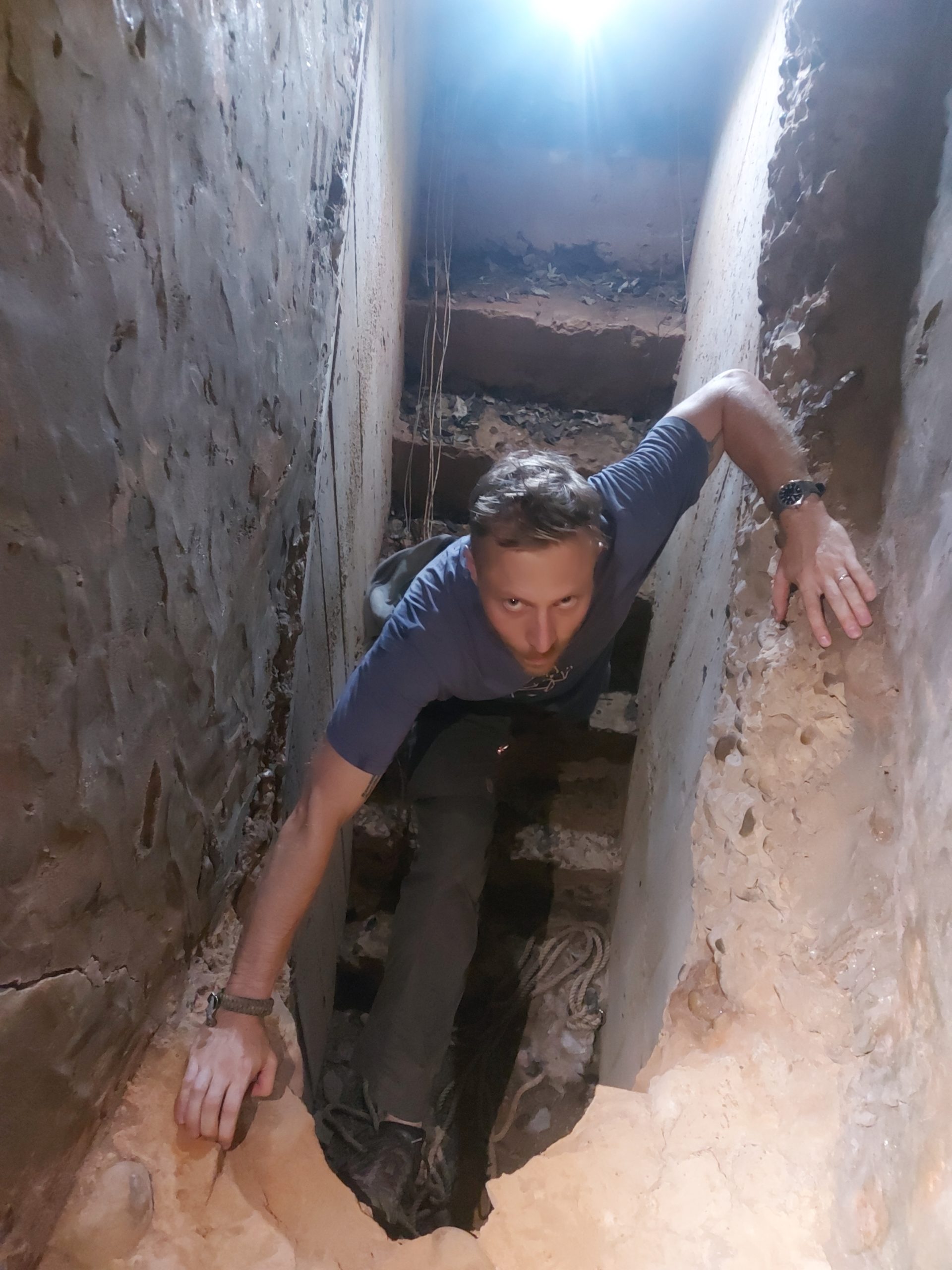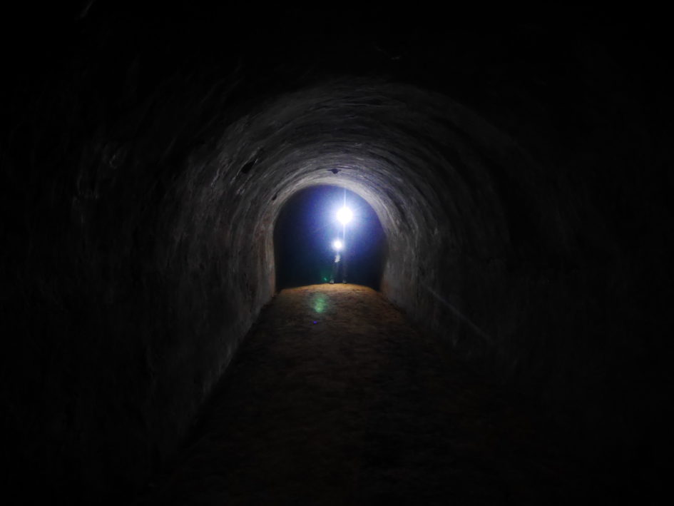 The other small tunnel leads down a steep set of stairs, past a small storage room, then up another set of stairs. As we were going down we started hearing loud voices. It sounded as if people were having a party in some room at the other end of the tunnel. Not wanting to get caught we snuck up and peaked in. There wasn’t any party that we could see but we realized we must have reached the backdoor of one of the cafes. We know that the cafe owners organize tours of the tunnels, our guess is that they bring people in this way.