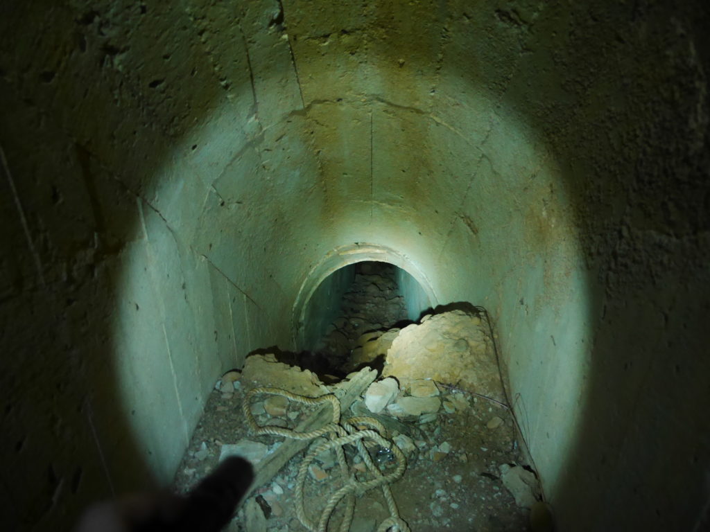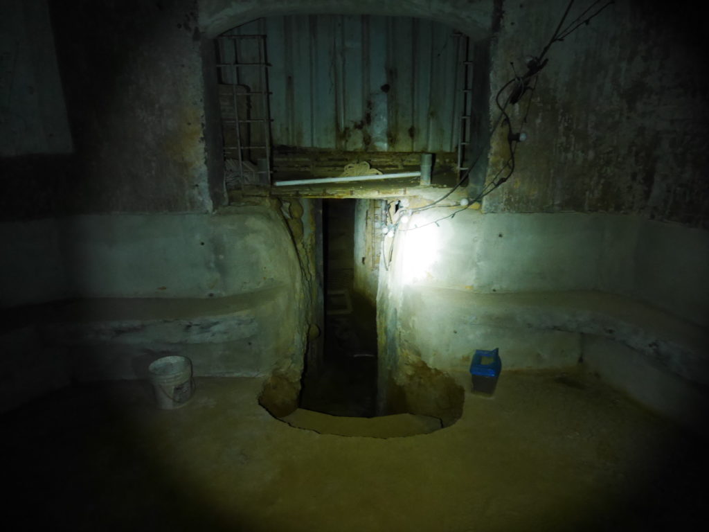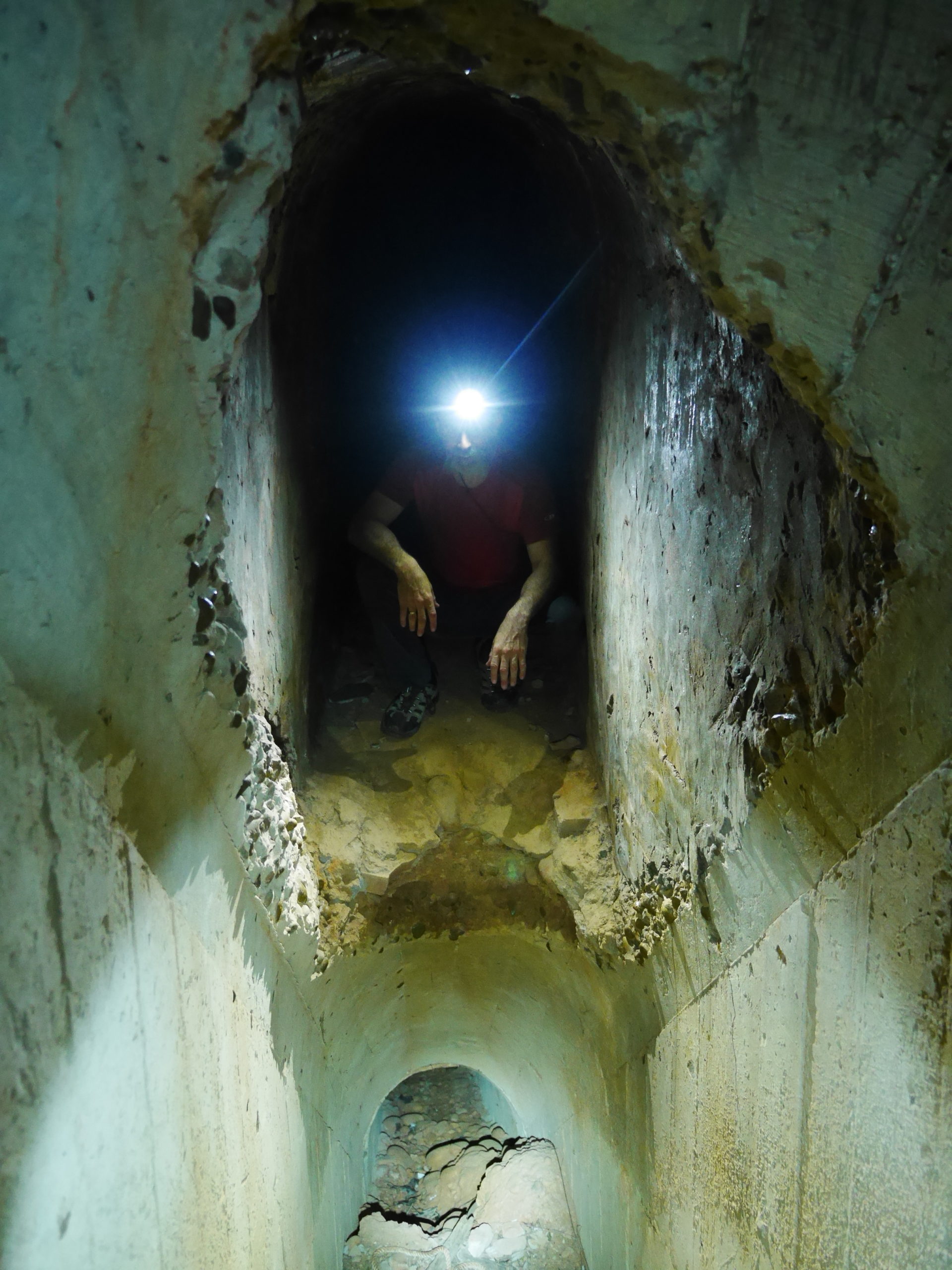 When we had finished exploring the artillery bunkers and the man cave, we headed back to the parts of the system that was on my original map and started working our way through it for Johan’s video. Since there were three of us, I dared explore those parts of the system that I had deemed too risky to enter when I was alone. First there was Bunker 113 where there’s a big hole in floor just before the bunker entrance. David ensured me that it was possible to get back up without a rope so down I went. From the hole it should be able to enter a lower level of the tunnel system. Unfortunately this tunnel has been blocked by a collapse a few meters in. Getting out of the hole on my own was possible but not easy. You can reach the edge of the hole with your hands, no problem, but there are no good footholds straight below, so you essentially have to heave yourself up while standing on the stairs a step or two back from the edge. It would be extra hard for people who are short or lack upper body strength, so if that’s you I recommend not jumping down, especially if you are on your own.