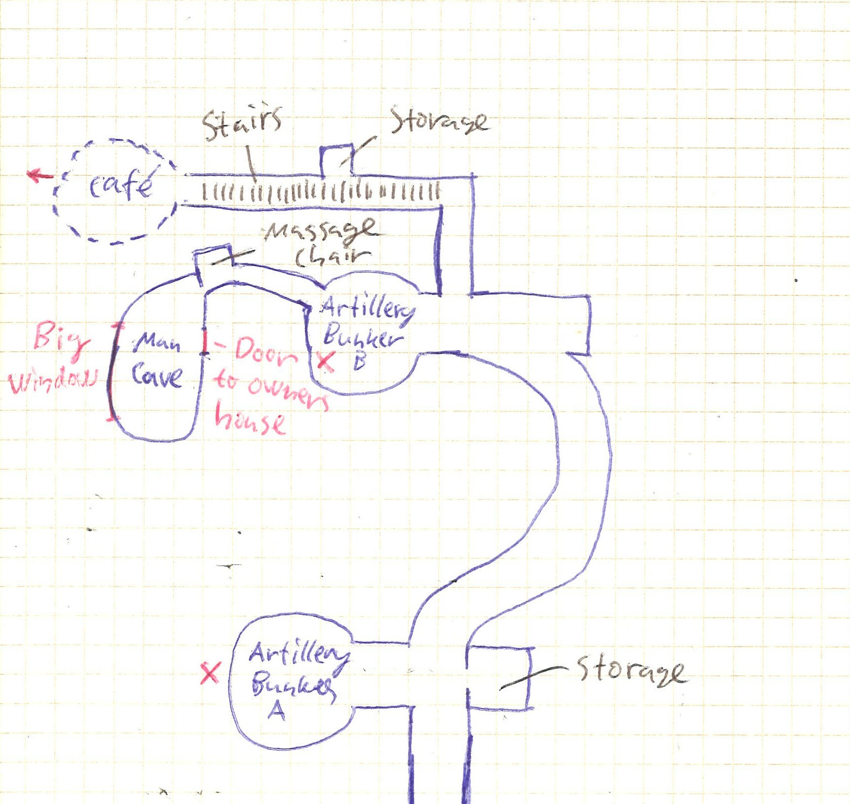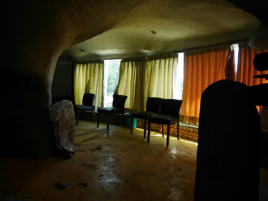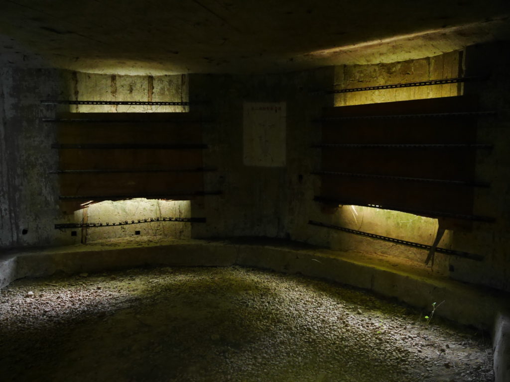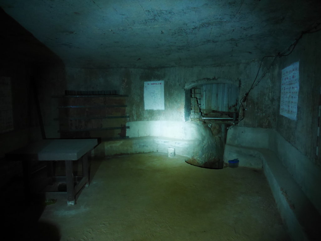 Continuing down the wide tunnel we came to the second artillery emplacement (Artillery Bunker B on my map). The big tunnel ends here but there are two smaller tunnels exiting this bunker. Both of these small tunnels lead to some very unexpected places. Following the first one we go to a small space, almost like an alcove, with an old dusty massage chair in front of a Chinese painting, and a closed door at the other end. Opening the door we went into a surprisingly bright room with big windows facing the outside, walls that look like someone had spray painted them with random colors, furnished with a number of chairs. There is also a doorway leading out of this room, with a door that belongs in a home rather than a military bunker. We quickly realized that we had wandered into somebody’s basement rec room, a literal man cave if you will, and made a hasty retreat back into the bunkers. My policy when exploring abandoned buildings is to stay away from any place where people actually live, just to respect their privacy. My recommendation for anyone going down this tunnel is to turn around once you reach the little alcove with the massage chair.