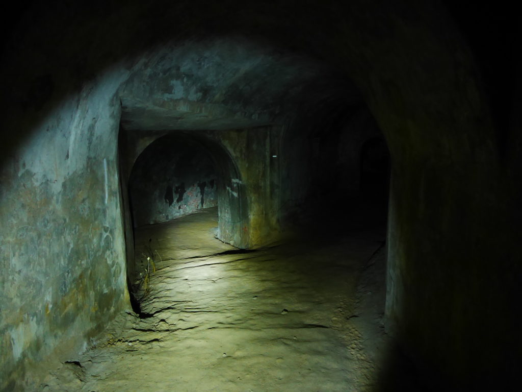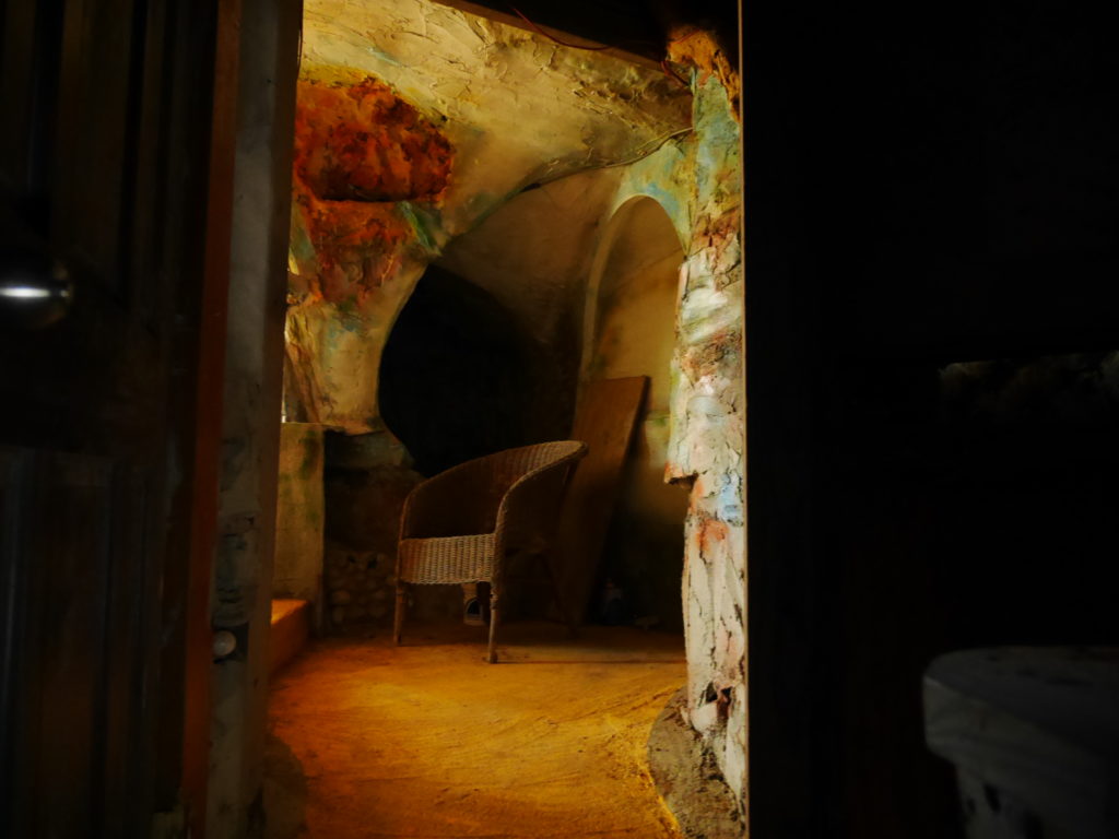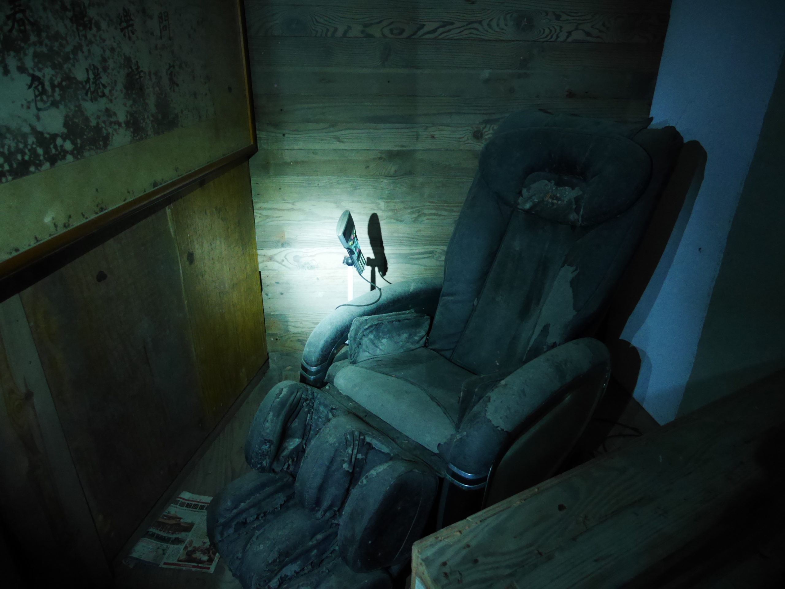 Continuing down the wide tunnel we came to the second artillery emplacement (Artillery Bunker B on my map). The big tunnel ends here but there are two smaller tunnels exiting this bunker. Both of these small tunnels lead to some very unexpected places. Following the first one we go to a small space, almost like an alcove, with an old dusty massage chair in front of a Chinese painting, and a closed door at the other end. Opening the door we went into a surprisingly bright room with big windows facing the outside, walls that look like someone had spray painted them with random colors, furnished with a number of chairs. There is also a doorway leading out of this room, with a door that belongs in a home rather than a military bunker. We quickly realized that we had wandered into somebody’s basement rec room, a literal man cave if you will, and made a hasty retreat back into the bunkers. My policy when exploring abandoned buildings is to stay away from any place where people actually live, just to respect their privacy. My recommendation for anyone going down this tunnel is to turn around once you reach the little alcove with the massage chair.